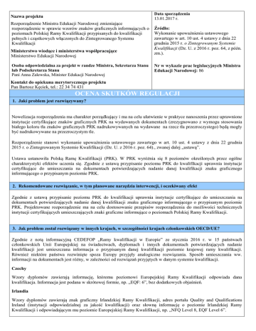 Data sporządzenia 13.01.2017 r. Nazwa projektu Rozporządzenie Ministra Edukacji Narodowej zmieniające rozporządzenie w sprawie wzorów znaków graficznych informujących o poziomach Polskiej Ramy Kwalifikacji przypisanych do kwalifikacji pełnych i cząstkowych włączonych do Zintegrowanego Systemu Kwalifikacji Ministerstwo wiodące i ministerstwa współpracujące Ministerstwo Edukacji Narodowej Osoba odpowiedzialna za projekt w randze Ministra, Sekretarza Stanu lub Podsekretarza Stanu Pani Anna Zalewska, Minister Edukacji Narodowej Źródło: Wykonanie upoważnienia ustawowego zawartego w art. 10 ust. 4 ustawy z dnia 22 grudnia 2015 r. o Zintegrowanym Systemie Kwalifikacji (Dz. U. z 2016 r. poz. 64, z późn. zm.). Nr w wykazie prac legislacyjnych Ministra Edukacji Narodowej: 86 Kontakt do opiekuna merytorycznego projektu Pan Bartosz Kęciek, tel.: 22 34 74 431 OCENA SKUTKÓW REGULACJI 1. Jaki problem jest rozwiązywany? Nowelizacja rozporządzenia ma charakter porządkujący i ma na celu ułatwienie w praktyce nanoszenia przez uprawnione instytucje certyfikujące znaków graficznych PRK na wydawanych dokumentach (zrezygnowano z wymogu stosowania białego koloru tła znaków graficznych PRK nadrukowywanych na wydawane na rzecz tła przezroczystego) będą mogły być nadrukowywane na przezroczystym tle. Rozporządzenie stanowi wykonanie upoważnienia ustawowego zawartego w art. 10 ust. 4 ustawy z dnia 22 grudnia 2015 r. o Zintegrowanym Systemie Kwalifikacji (Dz. U. z 2016 r. poz. 64)., zwanej dalej „ustawą”. Ustawa ustanowiła Polską Ramę Kwalifikacji (PRK). W PRK wyróżnia się 8 poziomów określonych przez ogólne charakterystyki efektów uczenia się. Zgodnie z ustawą przypisanie poziomu PRK do kwalifikacji uprawnia instytucje certyfikujące do umieszczania na dokumentach potwierdzających nadanie danej kwalifikacji znaku graficznego informującego o przypisanym poziomie PRK. 2. Rekomendowane rozwiązanie, w tym planowane narzędzia interwencji, i oczekiwany efekt Zgodnie z ustawą przypisanie poziomu PRK do kwalifikacji uprawnia instytucje certyfikujące do umieszczania na dokumentach potwierdzających nadanie danej kwalifikacji znaku graficznego informującego o przypisanym poziomie PRK. Projektowane rozporządzenie ma na celu dostosowanie przepisów rozporządzenia do możliwości technicznych instytucji certyfikujących umieszczających znaki graficzne informujące o poziomach Polskiej Ramy Kwalifikacji. 3. Jak problem został rozwiązany w innych krajach, w szczególności krajach członkowskich OECD/UE? Zgodnie z notą informacyjną CEDEFOP „Ramy kwalifikacji w Europie” ze stycznia 2016 r. w 15 państwach członkowskich Unii Europejskiej na świadectwach, dyplomach i innych dokumentach potwierdzających nadanie kwalifikacji jest umieszczana informacja o przypisanym danej kwalifikacji poziomie krajowej ramy kwalifikacji. Również niektóre państwa rozwinięte spoza Europy przyjęły analogiczne rozwiązania. Sposób umieszczania ww. informacji na dokumentach jest różny, w zależności od rozwiązań przyjętych w danym systemie kwalifikacji. Czechy Wzory dyplomów zawierają informację, któremu poziomowi Europejskiej Ramy Kwalifikacji odpowiada dana kwalifikacja. Informacja jest podana w skrótowej formie, np. „EQF: 6”, bez dodatkowych objaśnień. Irlandia Wzory dyplomów zawierają znak graficzny Irlandzkiej Ramy Kwalifikacji, adres portalu Quality and Qualifications Ireland (instytucji odpowiedzialnej za jakość kwalifikacji) oraz słowną informację o poziomie Irlandzkiej Ramy Kwalifikacji i odpowiadającym mu poziomie Europejskiej Ramy Kwalifikacji, np. „NFQ Level 8, EQF Level 6”. Niemcy Wzory dyplomów i świadectw zawierają słowną informację o poziomie Niemieckiej i Europejskiej Ramy Kwalifikacji, np. „Dieser Abschluss ist im Deutschen und Europäischen Qualifikationsrahmen dem Niveau 4 zugeordnet” – “Świadectwo jest przyporządkowane poziomowi 4 Niemieckiej i Europejskiej Ramy Kwalifikacji”. Szkocja Wzory dyplomów i certyfikatów zawierają informację o poziomie Szkockiej Ramy Kwalifikacji, umieszczaną w środkowej części dyplomu, bezpośrednio po nazwie kwalifikacji, w formie np. „SCQF LEVEL 6”. Republika Południowej Afryki Wzory dyplomów i certyfikatów zawierają znak graficzny South African Qualifications Authority i informację o poziomie Krajowej Ramy Kwalifikacji, w formie np. „NQF Level: 4”. 4. Podmioty, na które oddziałuje projekt Grupa Ministrowie Wielkość 19 Źródło danych KPRM Potencjalne instytucje certyfikujące (w tym szkoły, uczelnie, instytucje szkoleniowe) Wszystkie szkoły w systemie oświaty (około 28 tys.), szkoły wyższe (438), instytucje szkoleniowe (około 10 tys. firm szkoleniowych ujętych w Rejestrze Instytucji Szkoleniowych) GUS, Rejestr Instytucji Szkoleniowych Osoby fizyczne (w szczególności osoby uczące się, w tym również ich rodzice i opiekunowie prawni, osoby pracujące, pozostające bez pracy, nauczyciele, trenerzy, doradcy zawodowi itp.) Wszystkie osoby uczące się: w systemie szkolnym (dzieci i młodzież): 4,6 mln i w szkołach wyższych: 1,7 mln oraz osoby dorosłe (wiek: 25-64): 22 mln (rocznie w systemie pozaformalnym kształci się około 4,2 mln dorosłych, nieformalnie uczy się około 3,5 mln). GUS, MNiSW Oddziaływanie Znak graficzny będzie stosowany na dokumentach potwierdzających nadanie kwalifikacji uregulowanych, po ich włączeniu do ZSK. Po włączeniu kwalifikacji do ZSK i otrzymaniu uprawnień do certyfikowania będą uprawnione do umieszczania na świadectwach i dyplomach znaków graficznych potwierdzających poziom i wysoką jakość nadawanych kwalifikacji. Świadectwa, dyplomy i certyfikaty potwierdzające nadanie kwalifikacji włączonych do ZSK będą czytelniejsze i wiarygodniejsze dla pracodawców, co zwiększy szanse znalezienia pracy/awansu zawodowego. Łącznie: 28,7 mln. 5. Informacje na temat zakresu, czasu trwania i podsum