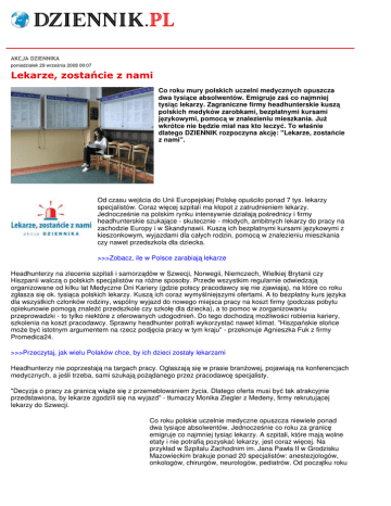 AKCJA DZIENNIKA poniedziałek 29 września 2008 00:07 Lekarze, zostańcie z nami Co roku mury polskich uczelni medycznych opuszcza dwa tysiące absolwentów. Emigruje zaś co najmniej tysiąc lekarzy. Zagraniczne firmy headhunterskie kuszą polskich medyków zarobkami, bezpłatnymi kursami językowymi, pomocą w znalezieniu mieszkania. Już wkrótce nie będzie miał nas kto leczyć. To właśnie dlatego DZIENNIK rozpoczyna akcję: "Lekarze, zostańcie z nami". Od czasu wejścia do Unii Europejskiej Polskę opuściło ponad 7 tys. lekarzy specjalistów. Coraz więcej szpitali ma kłopot z zatrudnieniem lekarzy. Jednocześnie na polskim rynku intensywnie działają pośrednicy i firmy headhunterskie szukające - skutecznie - młodych, ambitnych lekarzy do pracy na zachodzie Europy i w Skandynawii. Kuszą ich bezpłatnymi kursami językowymi z kieszonkowym, wyjazdami dla całych rodzin, pomocą w znalezieniu mieszkania czy nawet przedszkola dla dziecka. >>>Zobacz, ile w Polsce zarabiają lekarze Headhunterzy na zlecenie szpitali i samorządów w Szwecji, Norwegii, Niemczech, Wielkiej Brytanii czy Hiszpanii walczą o polskich specjalistów na różne sposoby. Przede wszystkim regularnie odwiedzają organizowane od kilku lat Medyczne Dni Kariery (gdzie polscy pracodawcy się nie zjawiają), na które co roku zgłasza się ok. tysiąca polskich lekarzy. Kuszą ich coraz wymyślniejszymi ofertami. A to bezpłatny kurs języka dla wszystkich członków rodziny, wspólny wyjazd do nowego miejsca pracy na koszt firmy (podczas pobytu opiekunowie pomogą znaleźć przedszkole czy szkołę dla dziecka), a to pomoc w zorganizowaniu przeprowadzki - to tylko niektóre z oferowanych udogodnień. Do tego dochodzą możliwości robienia kariery, szkolenia na koszt pracodawcy. Sprawny headhunter potrafi wykorzystać nawet klimat. "Hiszpańskie słońce może być istotnym argumentem na rzecz podjęcia pracy w tym kraju" - przekonuje Agnieszka Fuk z firmy Promedica24. >>>Przeczytaj, jak wielu Polaków chce, by ich dzieci zostały lekarzami Headhunterzy nie poprzestają na targach pracy. Ogłaszają się w prasie branżowej, pojawiają na konferencjach medycznych, a jeśli trzeba, sami szukają pożądanego przez pracodawcę specjalisty. "Decyzja o pracy za granicą wiąże się z przemeblowaniem życia. Dlatego oferta musi być tak atrakcyjnie przedstawiona, by lekarze zgodzili się na wyjazd" - tłumaczy Monika Ziegler z Medeny, firmy rekrutującej lekarzy do Szwecji. Co roku polskie uczelnie medyczne opuszcza niewiele ponad dwa tysiące absolwentów. Jednocześnie co roku za granicę emigruje co najmniej tysiąc lekarzy. A szpitali, które mają wolne etaty i nie potrafią pozyskać lekarzy, jest coraz więcej. Na przykład w Szpitalu Zachodnim im. Jana Pawła II w Grodzisku Mazowieckim brakuje ponad 20 specjalistów: anestezjologów, onkologów, chirurgów, neurologów, pediatrów. Od początku roku dyrekcja zamieszcza komunikaty w lokalnej prasie i w branżowym piśmie lekarskim. "Do tej pory nikogo nie znaleźliśmy. Za to trzech kolejnych lekarzy zrezygnowało z pracy i wyjechało za granicę" - mówi Krystyna Płuskin, dyrektor szpitala. "W polskich szpitalach niestety wciąż pokutuje przekonanie, że zatrudniając lekarza, robi mu się ogromną łaskę" - mówi Paweł Jezierski, neurolog i założyciel fundacji "Nie biorę, chcę normalnie zarabiać”. "A nie możemy sobie pozwolić na wypuszczanie lekarzy za granicę. Już teraz widać lukę pokoleniową. Brakuje młodych specjalistów. Jeśli w Polsce nie znajdą atrakcyjnej pracy, lada dzień nie będzie miał nas kto leczyć". Nie odezwał się do mnie żaden polski pracodawca KATARZYNA ŚWIERCZYŃSKA: Dlaczego wyjechała pani z Polski? BEATA SZYMKO*: W kraju zrobiłam specjalizację z medycyny rodzinnej, pracowałam w dwóch przychodniach i hospicjum. Całe tygodnie spędzałam tyko w pracy. Pewnego razu w poniedziałek rano zaczęłam się zastanawiać, czy tak powinno wyglądać moje życie. Postanowiłam to zmienić. Przesłałam swoje dokumenty do różnych szpitali w Polsce z pytaniem o możliwość dalszej specjalizacji i jednocześnie wysłałam oferty do biur rekrutujących za granicę. Jedna z propozycji, jakie dostałam, to była właśnie Szwecja. Czy odezwał się jakiś polski szpital? Nie. Dlaczego przyjęła pani propozycję akurat ze Szwecji? Znała pani język? Ze szwedzkim nigdy nie miałam styczności. Ale okazało się to bez znaczenia. Zaoferowano mi siedmiomiesięczny kurs języka w Konstancinie z zakwaterowaniem, wyżywieniem i miesięczną dietą, która pozwalała na rezygnację z pracy na czas kursu. Jeszcze przed nim razem z innymi uczestnikami kursu zostaliśmy zaproszeni do Szwecji, gdzie mogliśmy obejrzeć nasze przyszłe miejsca pracy - przychodnie mieszkania i ich okolice, szkoły i przedszkola. Zorganizowano też kolację, na której spotkaliśmy się z osobami z poprzednich kursów, które dzieliły się z nami swymi wrażeniami. To wszystko robi wrażenie. Czy sama praca też jest tak atrakcyjna? Tu pracuje się naprawdę komfortowo. Mam doskonałe możliwości dalszego kształcenia, kursy szkoleniowe opłaca mi pracodawca. Tu nie muszę nikogo błagać o przyznanie i tak przysługującego mi urlopu. Wszystkie nadgodziny, a nawet nadminuty, są skrupulatnie liczone i potem można je odebrać jako czas wolny. Nie wspomnę już o takich sprawach jak czas dla pacjenta. Tu na każdego mogę przeznaczyć ok. 20 min. W Polsce to marzenie. *Beata Szymko ma 33 lata, w Szwecji pracuje od roku jako lekarz rodzinny Pokażmy, że warto u nas pracować KATARZYNA ŚWIERCZYŃSKA: Dlaczego dyrektorzy polskich szpitali i osoby odpowiedzialne w samorządach za politykę zdrowotną nie walczą tak intensywnie o lekarzy, jak robią to pośrednicy i head-hunterzy z zachodniej Europy? GRZEGORZ CHODKOWSKI*: W krajach takich, jak: Szwecja, Niemcy czy Francja, medyczny sektor pracy od dawna rządzi się prawami wolnego rynku. Tam w