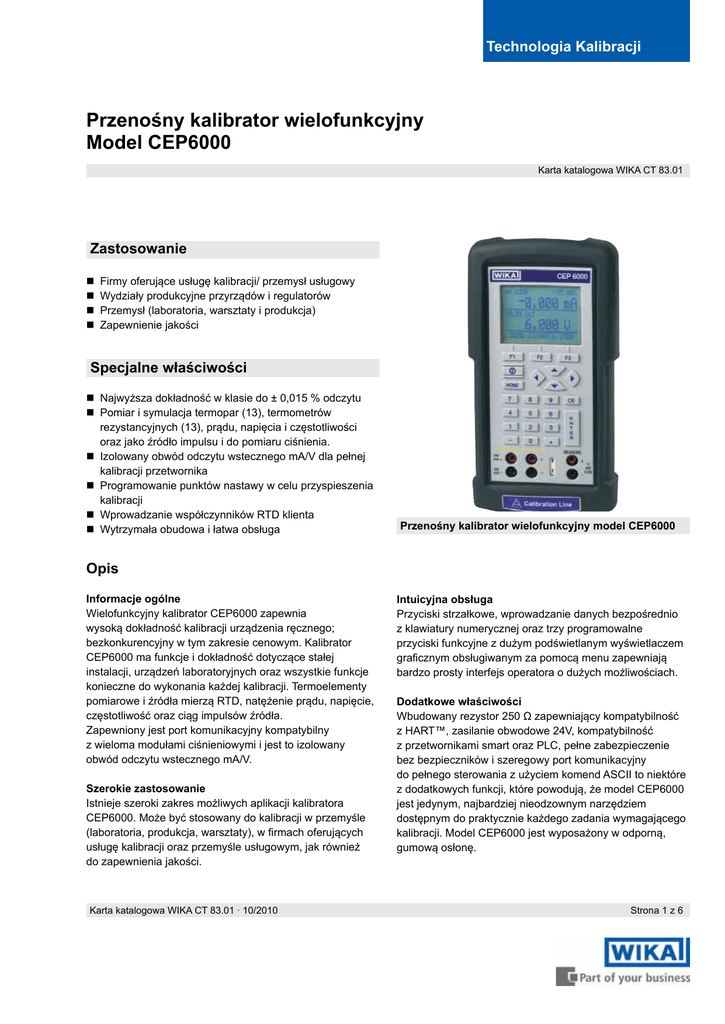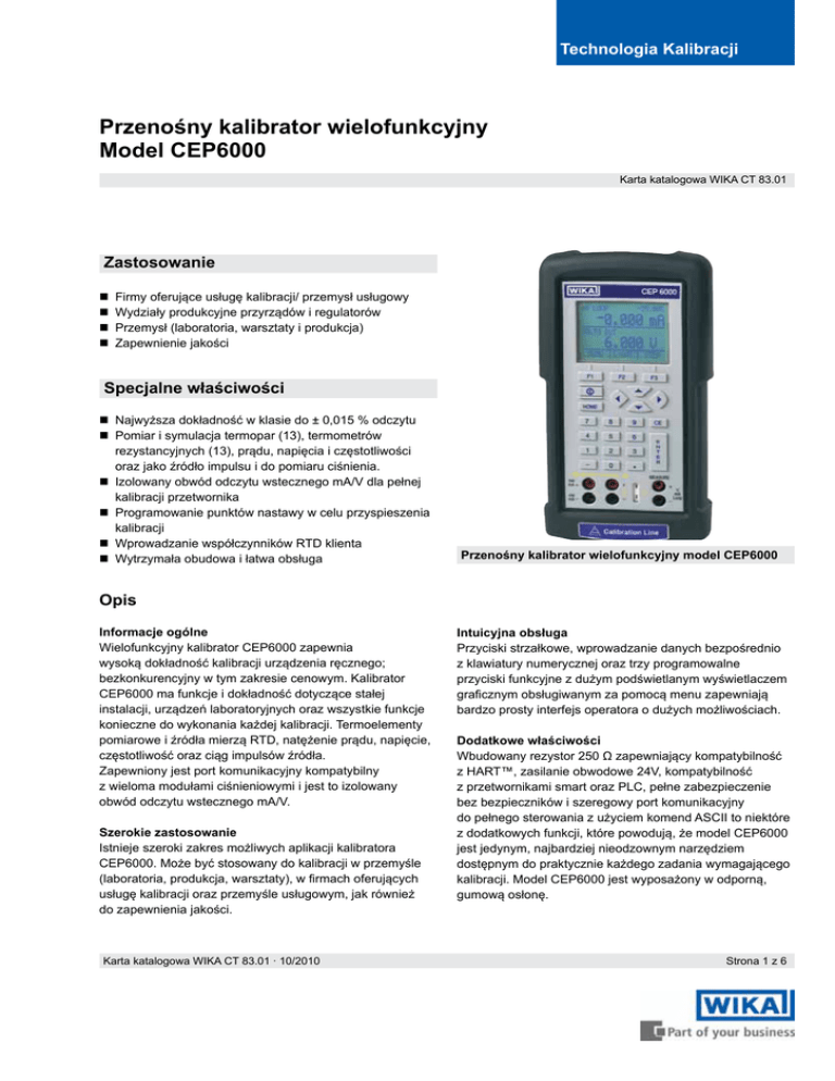 Technologia Kalibracji Przenośny kalibrator wielofunkcyjny Model CEP6000 Karta katalogowa WIKA CT 83.01 Zastosowanie Firmy oferujące usługę kalibracji/ przemysł usługowy Wydziały produkcyjne przyrządów i regulatorów Przemysł (laboratoria, warsztaty i produkcja) Zapewnienie jakości Specjalne właściwości Najwyższa dokładność w klasie do ± 0,015 % odczytu Pomiar i symulacja termopar (13), termometrów rezystancyjnych (13), prądu, napięcia i częstotliwości oraz jako źródło impulsu i do pomiaru ciśnienia. Izolowany obwód odczytu wstecznego mA/V dla pełnej kalibracji przetwornika Programowanie punktów nastawy w celu przyspieszenia kalibracji Wprowadzanie współczynników RTD klienta Wytrzymała obudowa i łatwa obsługa Przenośny kalibrator wielofunkcyjny model CEP6000 Opis Informacje ogólne Wielofunkcyjny kalibrator CEP6000 zapewnia wysoką dokładność kalibracji urządzenia ręcznego; bezkonkurencyjny w tym zakresie cenowym. Kalibrator CEP6000 ma funkcje i dokładność dotyczące stałej instalacji, urządzeń laboratoryjnych oraz wszystkie funkcje konieczne do wykonania każdej kalibracji. Termoelementy pomiarowe i źródła mierzą RTD, natężenie prądu, napięcie, częstotliwość oraz ciąg impulsów źródła. Zapewniony jest port komunikacyjny kompatybilny z wieloma modułami ciśnieniowymi i jest to izolowany obwód odczytu wstecznego mA/V. Szerokie zastosowanie Istnieje szeroki zakres możliwych aplikacji kalibratora CEP6000. Może być stosowany do kalibracji w przemyśle (laboratoria, produkcja, warsztaty), w firmach oferujących usługę kalibracji oraz przemyśle usługowym, jak również do zapewnienia jakości. Karta katalogowa WIKA CT 83.01 ∙ 10/2010 Intuicyjna obsługa Przyciski strzałkowe, wprowadzanie danych bezpośrednio z klawiatury numerycznej oraz trzy programowalne przyciski funkcyjne z dużym podświetlanym wyświetlaczem graficznym obsługiwanym za pomocą menu zapewniają bardzo prosty interfejs operatora o dużych możliwościach. Dodatkowe właściwości Wbudowany rezystor 250 Ω zapewniający kompatybilność z HART™, zasilanie obwodowe 24V, kompatybilność z przetwornikami smart oraz PLC, pełne zabezpieczenie bez bezpieczników i szeregowy port komunikacyjny do pełnego sterowania z użyciem komend ASCII to niektóre z dodatkowych funkcji, które powodują, że model CEP6000 jest jedynym, najbardziej nieodzownym narzędziem dostępnym do praktycznie każdego zadania wymagającego kalibracji. Model CEP6000 jest wyposażony w odporną, gumową osłonę. Strona 1 z 6 Wymiary w mm Widok z przodu Widok z boku Widok z góry Strona 2 z 6 Karta katalogowa WIKA CT 83.01 ∙ 10/2010 Dane techniczne Wyświetlacz Model CEP6000 2-częściowy z 10-polami o wielkości znaków 8 mm Wejście i wyjście Termometry oporowe Pt100 (385, 3926, 3916), Pt200, Pt500, Pt1000, Ni120, Cu10, Cu50, Cu100, YSI400, Pt10, Pt50 Termoelementy Type J, K, T, E, R, S, B, L, U, N, C, XK, BP Sygnał napięciowy DC 0 ... 30 V Sygnał prądowy (natężenie) 0 ... 24 mA Oporność 0 ... 400 Ω and 400 ... 4000 Ω Częstotliwość/impulsy 2 CPM ... 10.00 kHz Ciśnienie zależne od modułu ciśnieniowego Zasilanie elektryczne w obwodzie 24 V DC RTD reakcja częstotliwościowa 5 ms; działa ze wszystkimi przetwornikami impulsowymi Częstotliwość 1 ... 20 V z wybieraną amplitudą Impulsy 1 ... 20 V z wybieraną amplitudą (jedynie dla źródła) Specialne właściwości Automatyczny krok / funkcja rampy, bezpośrednie wprowadzenie niestandardowych współczynników termometrów oporowych, ustawienie wartości zadanej dla każdej funkcji wyjściowej oraz wbudowany rezystor komunikacji HART ™ Interfejs RS-232, USB z opcjonalnym seryjnym adapterem Zasilanie Baterie DC 6 V, dla (4) AA baterii Czas pracy 20 godzin Wskaźnik stanu baterii wyświetlana ikona, gdy akumulatorek jest wyczerpany Dopuszczalna Temperatura robocza -10 ... +50 °C Temperatura przechowywania -20 ... +70 °C Stabilność 0,005 % odczytu/°C poza zakresem 23 °C ± 5 °C Obudowa Materiał plastik (z ochronną gumową) Stopień ochrony IP 52 CE-potwierdzenie dyrektywa EMC 2004/108/WE, EN 61326 Emisja (Grupa 1, klasa B) i odporność (przenośny test i sprzęt pomiarowy) Wymiary 220,9 x 106,6 x 58,4 mm Masa ok. 863 g Karta katalogowa WIKA CT 83.01 ∙ 10/2010 Strona 3 z 6 Wejściowe i wyjściowe sygnały Zakres pomiarowy Absolutna niepewność (błąd całkowity) Sygnały napięciowe w mV Termoelementy Typ B Typ C Typ E Typ J Typ K Typ L Typ N Typ R Typ S Typ T Typ U Typ XK Typ BP Termometr rezystancyjne Pt100 (385) Pt100 (3926) Pt100 (3916) Pt200 Pt500 Pt1000 Pt10 PT50 Ni120 Cu 10 Cu 50 Cu 100 YSI 400 -10.000 ... +75.000 mV 0.02 % ± 10 µV 600 ... 1820 °C 0 ... 2316 °C -250 ... +1000 °C -210 ... +1200 °C -200 ... +1372 °C -200 ... +900 °C -200 ... +1300 °C 0 ... +1767 °C 0 ... +1767 °C -250 ... +400 °C -200 ... +600 °C -200 ... +800 °C 0 ... +2500 °C 1.2 ... 1.5 °C 0.6 ... 2.3 °C 0.2 ... 0.6 °C 0.2 ... 0.4 °C 0.3 ... 0.6 °C 0.2 ... 0.25 °C 0.4 ... 0.8 °C 1.2 °C 1.2 °C 0.2 ... 0.6 °C 0.25 ... 0.5 °C 0.2 °C 0.9 ... 2.3 °C -200 ... +800 °C -200 ... +630 °C -200 ... +630 °C -200 ... +630 °C -200 ... +630 °C -200 ... +630 °C -200 ... +800 °C -200 ... +800 °C -80 ... +260 °C -100 ... +260 °C -180 ... +200 °C -180 ... +200 °C 15 ... 50 °C 0.10 ... 0.29 °C 0.10 ... 0.24 °C 0.08 ... 0.25 °C 0.40 ... 0.66 °C 0.18 ... 0.34 °C 0.10 ... 0.25 °C 0.78 ... 1.19 °C 0.18 ... 0.39 °C 0.06 °C 0.82 °C 0.20 °C 0.13 °C 0.05 °C Wejściowe i wyjściowe sygnały Zakres pomiarowy Absolutna niepewność (odczytu) 0 ... 24.000 mA 0 ... 24.000 mA 0.015 % ± 2 µA 0.015 % ± 2 µA 0 ... 20.000 V DC 0 ... 30.000 V DC (izolowane) 0 ... 20.000 V DC (nieizolowane) 0.015 % ± 2 mV 0.015 % ± 2 mV 0.015 % ± 2 mV 5.0 ... 400.0 Ω 5.0 ... 400.0 Ω 400.0 ... 1500.0 Ω 1500.0 ... 4000.0 Ω 0 ... 400.0 Ω 400.0 ... 4000.0 Ω 0.015 % ± 0.1 Ω 0.015 % ± 0.03 Ω 0.015 % ± 0.3 Ω 0.