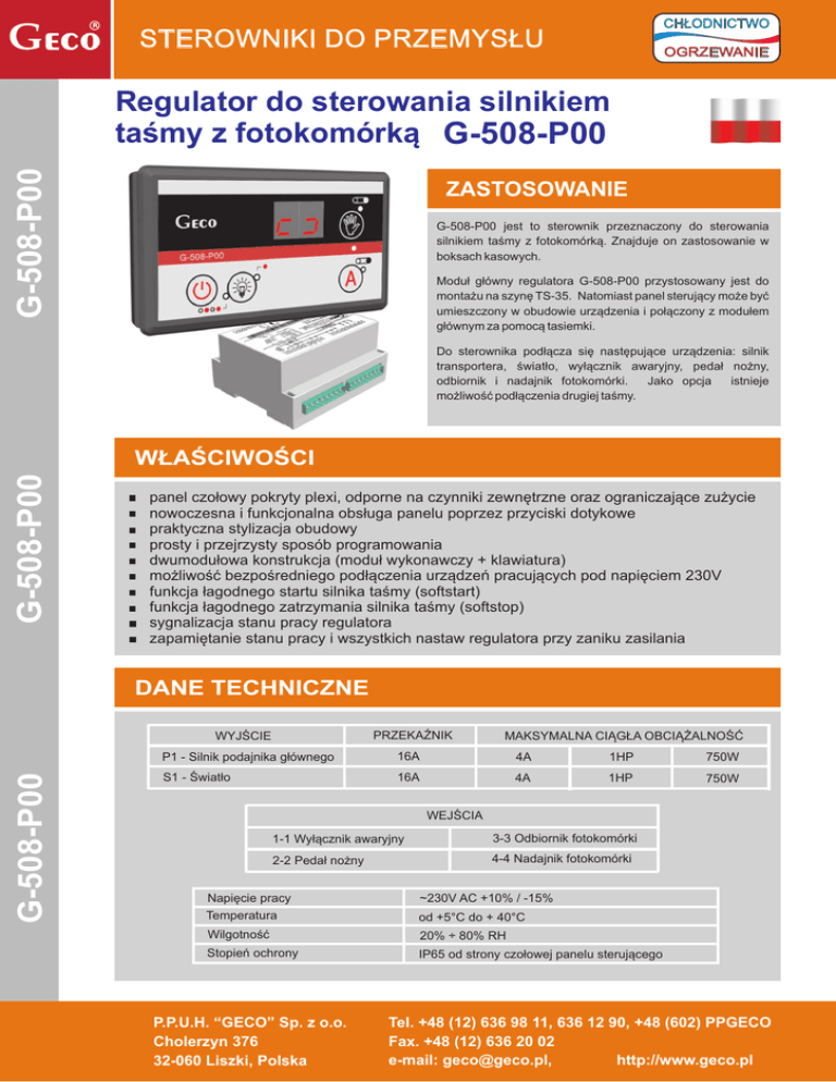 R CHŁODNICTWO STEROWNIKI DO PRZEMYSŁU OGRZEWANIE G-508-P00 Regulator do sterowania silnikiem taśmy z fotokomórką G-508-P00 ZASTOSOWANIE G-508-P00 jest to sterownik przeznaczony do sterowania silnikiem taśmy z fotokomórką. Znajduje on zastosowanie w boksach kasowych. Moduł główny regulatora G-508-P00 przystosowany jest do montażu na szynę TS-35. Natomiast panel sterujący może być umieszczony w obudowie urządzenia i połączony z modułem głównym za pomocą tasiemki. Do sterownika podłącza się następujące urządzenia: silnik transportera, światło, wyłącznik awaryjny, pedał nożny, odbiornik i nadajnik fotokomórki. Jako opcja istnieje możliwość podłączenia drugiej taśmy. G-508-P00 WŁAŚCIWOŚCI panel czołowy pokryty plexi, odporne na czynniki zewnętrzne oraz ograniczające zużycie nowoczesna i funkcjonalna obsługa panelu poprzez przyciski dotykowe praktyczna stylizacja obudowy prosty i przejrzysty sposób programowania dwumodułowa konstrukcja (moduł wykonawczy + klawiatura) możliwość bezpośredniego podłączenia urządzeń pracujących pod napięciem 230V funkcja łagodnego startu silnika taśmy (softstart) funkcja łagodnego zatrzymania silnika taśmy (softstop) sygnalizacja stanu pracy regulatora zapamiętanie stanu pracy i wszystkich nastaw regulatora przy zaniku zasilania DANE TECHNICZNE PRZEKAŹNIK G-508-P00 WYJŚCIE MAKSYMALNA CIĄGŁA OBCIĄŻALNOŚĆ P1 - Silnik podajnika głównego 16A 4A 1HP 750W S1 - Światło 16A 4A 1HP 750W WEJŚCIA 1-1 Wyłącznik awaryjny 3-3 Odbiornik fotokomórki 2-2 Pedał nożny 4-4 Nadajnik fotokomórki Napięcie pracy Temperatura od +5°C do + 40°C Wilgotność 20% ÷ 80% RH Stopień ochrony IP65 od strony czołowej panelu sterującego P.P.U.H. “GECO” Sp. z o.o. Cholerzyn 376 32-060 Liszki, Polska ~230V AC +10% / -15% Tel. +48 (12) 636 98 11, 636 12 90, +48 (602) PPGECO Fax. +48 (12) 636 20 02 e-mail: [email protected], http://www.geco.pl SCHEMAT POŁĄCZEŃ Zasilanie 220-230 VAC Podajnik Główny Światło SKŁAD ZESTAWU Wyposażenie podstawowe: N N N S1 N N N P1 N F 3,15A 5X20 R STER. F 3,15A/250V PPUH GECO Sp. z o.o. Cholerzyn 376, 32-060 Liszki tel. +48 (12) 6369811 fax 6362002 www.geco.pl e-mail: [email protected] Model: MG-508-P00 Ns:0000 Data Prod.: 10-11 Un = 220-230 V Imax = 10A P1 - podajnik główny S1 - światło 1-1 - wył. awaryjny 2-2 - pedał nożny 3-3 - odb. fotokom. 4-4 - nad. fotokom. biały - minus czerwony - plus 1. Moduł wykonawczy MG-508-P00 2. Klawiatura PG-508-P00 SCHEMAT POŁĄCZEŃ 3. Tasiemka łącząca moduł wykonawczy z panelem 4. Czujnik fotokomórki Made in Poland Złącze Tasiemki Wyłącznik Awaryjny 1 Pedał Nożny 1 2 2 + 3 -+ 3 4 Odbiornik Fotokomórki 4 Nadajnik Fotokomórki Tabela parametrów serwisowych stosowanych do ustawienia wymaganej pracy sterownika. Opis parametru Zakres zmian Nastawa fabryczna 2÷99 s 20 s Czas wydłużenia pracy silnika po przejściu do automatu lub po załączeniu pedałem lub fotokomórką C1 Czas załączenia żarówki w trybie migania (16=1 sek) 8÷48 16(1s) C2 Czas wyłączenia żarówki w trybie migania (16=1sek) 8÷48 16(1s) C3 Parametr do konfiguracji stanu aktywnego wyłącznika awaryjnego: 0 - wyłącznik normalnie rozwarty 1 - wyłącznik normalnie zwarty 0÷1 0 C4 Parametr do konfiguracji stanu aktywnego pedału zdalnego sterowania: 0 - wyłącznik normalnie rozwarty 1 - wyłącznik normalnie zwarty 0÷1 0 C5 Czułość fotokomórki (gdy 0 to brak sygnału fotokomórki również w pracy automatycznej) 0÷50 10 C6 Czas softstartu (gdy 0 to brak płynnego startu silnika) 0÷10 4(1s) C7 Obroty minimalne silnika podajnika głównego 25÷50 30 C8 Czas softstopu (gdy 0 to brak płynnego zatrzymania silnika) 0÷10 4(1s) C9 Obroty maksymalne silnika podajnika głównego (wartość 99 oznacza pełną prędkość silnika) 51÷99 99 D4 Filtr fotokomórki 1÷19 1 G-508-P00 C0 G-508-P00 OZNACZENIA PARAMETRÓW Parametr G-508-P00 L Bezp.