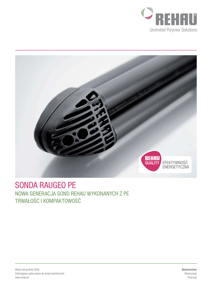 EFEKTYWNOŚĆ ENERGETYCZNA SONDA RAUGEO PE NOWA GENERACJA SOND REHAU WYKONANYCH Z PE TRWAŁOŚĆ I KOMPAKTOWOŚĆ Ważny od grudnia 2008 Zastrzegamy sobie prawo do zmian technicznych www.rehau.pl Budownictwo Motoryzacja Przemysł SONDA RAUGEO PE NOWA GENERACJA SOND REHAU WYKONANYCH Z PE TRWAŁOŚĆ I KOMPAKTOWOŚĆ W rosnącym na całym świecie rynku sond geotermalnych stawia się coraz wyższe wymagania komponentom stosowanym w systemach geotermalnych. Trudne warunki montażowe, większe głębokości odwiertów oraz nowe wymagania jakościowe ze strony projektantów, producentów pomp ciepła i odbiorców końcowych wymagają nowych rozwiązań technicznych. Aby sprostać tym wymaganiom, firma REHAU, oferująca innowacyjne rozwiązania systemowe, stworzyła nową generację sond z PE. Nowa sonda geotermalna RAUGEO wykonana z PE 100 przekonuje swoją trwałością, kompaktową budową i łatwością montażu. Program dostawy Sondy o wymiarach 32 x 2,9 oraz 40 x 3,7 jako sondy podwójne są dostępne w następujących długościach: 32 x 2,9 40 x 3,7 Numer artykułu Długość sondy Numer artykułu Długość sondy 136156-060 60 136296-060 60 136166-070 70 136306-070 70 136176-080 80 136316-080 80 136186-090 90 136326-090 90 136196-100 100 136336-102 102 136206-110 110 136346-127 127 136226-125 125 136356-140 140 136246-140 140 136366-152 152 136256-150 150 136376-165 165 136386-175 175 136396-185 185 136406-200 200 136416-225 225 136426-250 250 136436-275 275 136446-300* 300 Długości specjalne na zapytanie * Produkowane na zlecenie Zapewnienie jakości Głowica sondy RAUGEO PE jest spawana w fabryce i poddawana próbom ciśnieniowym, co daje pewność o szczelności spawu. Cały proces produkcji jest kontrolowany przez Południowoniemieckie Centrum Tworzyw Sztucznych SKZ. 2 SONDA RAUGEO PE NOWA GENERACJA SOND REHAU WYKONANYCH Z PE TRWAŁOŚĆ I KOMPAKTOWOŚĆ Najważniejsze zalety sondy RAUGEO PE: Bezpieczeństwo podczas montażu - pionowe użebrowania w celu ochrony głowicy sondy przy montażu - ochrona spawu rury i głowicy poprzez rozszerzoną konstrukcję głowicy sondy zabezpiecza przed mechanicznymi uszkodzeniami - ułatwione wsuwanie sondy do otworu wiertniczego dzięki konstrukcji stożkowej głowicy sondy oraz pionowego użebrowania Kompaktowa budowa Mała średnica głowicy sondy umożliwia zmniejszenie średnicy odwiertu i kosztów montażowych: Średnica dla sondy pojedynczej DN 32: 80 mm Średnica dla sondy podwójnej DN 32: 96 mm Średnica dla sondy pojedynczej DN 40: 98 mm Średnica dla sondy podwójnej DN 40: 118 mm Łatwy montaż - stabilne i łatwe skręcenie zestawu obciążnika z głowicą sondy - szybki i pewny montaż obciążnika - modułowa budowa obciążnika – w modułach 12,5 kg - specjalny płaskownik do montażu obciążnika na sondzie pojedynczej Nawrót instalacji korzystny pod względem przepływu - minimalna strata ciśnienia dzięki zastosowaniu korzystnego dla przepływu kolana 180° (strata miejscowa ζ = 0,34) Nowa sonda RAUGEO jest uzupełnieniem systemu wykorzystywania energii geotermalnej REHAU, który obejmuje wszystkie komponenty począwszy od sond geotermalnych włącznie z osprzętem poprzez rozdzielacze, studnie i przewody przyłączeniowe aż po instalację w budynku. 3 4 6 9 5 1 8 3 2 7 EFEKTYWNOŚĆ ENERGETYCZNA 1 2 3 4 5 6 7 8 9 systemy kanalizacji deszczowej i sanitarnej AWADUKT systemy drenarskie i rozsączające systemy zagospodarowania wody deszczowej RAUSIKKO geosyntetyki system szczelnych przyłączy AWADOCK system rur preizolowanych RAUTHERMEX do sieci niskotemperaturowych sonda geotermalna RAUGEO kolektor geotermalny RAUGEO gruntowy powietrzny wymiennik ciepła AWADUKT Thermo systemy do renowacji bezwykopowej RAULINER Niniejszy dokument jest chroniony przez prawo autorskie. Powstałe w ten sposób prawa, w szczególności prawo do tłumaczenia, przedruku, pobierania rysunków, przesyłania drogą radiową, powielania na drodze fotomechanicznej lub podobnej, a także zapisywania danych w formie elektronicznej są zastrzeżone. Biura Handlowo-Techniczne REHAU Gdynia: 81-547 Gdynia - ul. Popiela 26 - tel. 0-58 66 85 960 - fax 0-58 66 85 961 - [email protected] Gliwice: 44-109 Gliwice - ul. Jana Gutenberga 24 - tel. 0-32 77 55 100 - fax 0-32 77 55 101 - [email protected] Poznań: 62-081 Przeźmierowo k. Poznania - Baranowo, ul. Poznańska 1 A - tel. 0-61 84 98 400 - fax 0-61 84 98 401 - [email protected] Warszawa: 03-244 Warszawa - ul. Wenecka 12 - tel. 0-22 20 56 300 - fax 0-22 20 56 301 - [email protected] REHAU Sp. z o.o. - NIP 781-00-16-806 - Sąd Rejonowy Poznań - Nowe Miasto i Wilda w Poznaniu, VIII Wydział Gospodarczy Krajowego Rejestru Sądowego; nr KRS 0000049439 - Kapitał zakładowy: 46 500 000,00 zł www.rehau.pl 12.2008