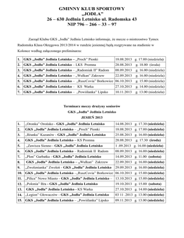 GMINNY KLUB SPORTOWY „JODŁA” 26 – 630 Jedlnia Letnisko ul. Radomska 43 NIP 796 – 266 – 33 – 97 Zarząd Klubu GKS „Jodła” Jedlnia Letnisko informuje, że mecze o mistrzostwo Tymex Radomska Klasa Okręgowa 2013/2014 w rundzie jesiennej będą rozgrywane na stadionie w Kolonce według załączonego preliminarza: 1. GKS „Jodła” Jedlnia Letnisko – „Proch” Pionki 18.08.2013 g. 17.00 (niedziela) 2. GKS „Jodła” Jedlnia Letnisko – LKS Promna 28.08.2013 g. 18.00 (środa) 3. GKS „Jodła” Jedlnia Letnisko – „Radomiak II” Radom 08.09.2013 g. 16.00 (niedziela) 4. GKS „Jodła” Jedlnia Letnisko – „Wulkan” Zakrzew 22.09.2013 g. 16.00 (niedziela) 5. GKS „Jodła” Jedlnia Letnisko – „RuszCovia” Borkowice 06.10.2013 g. 15.00 (niedziela) 6. GKS „Jodła” Jedlnia Letnisko – KS Warka 27.10.2013 g. 14.00 (niedziela) 7. GKS „Jodła” Jedlnia Letnisko – „Powiślanka” Lipsko 10.11.2013 g. 13.00 (niedziela) Terminarz meczy drużyny seniorów GKS „Jodła” Jedlnia Letnisko JESIEŃ 2013 1. „Oronka” Orońsko - GKS „Jodła” Jedlnia Letnisko 14.08.2013 g. 17.30 (niedziela) 2. GKS „Jodła” Jedlnia Letnisko – „Proch” Pionki 18.08.2013 g. 17.00 (niedziela) 3. „Iłżanka” Kazanów - GKS „Jodła” Jedlnia Letnisko 25.08.2013 g. 16.00 (niedziela) 4. GKS „Jodła” Jedlnia Letnisko – KS Promna 28.08.2013 5. „Zawisza Sienno - GKS „Jodła” Jedlnia Letnisko 1 .09.2013 g. 16.00 (niedziela) 6. GKS „Jodła” Jedlnia Letnisko – Radomiak II Radom 08.09.2013 g. 16.00 (niedziela) 7. „Plon” Garbatka - GKS „Jodła” Jedlnia Letnisko 14.09.2013 g. 11.00 (sobota) 8. GKS „Jodła” Jedlnia Letnisko – „Wulkan” Zakrzew 22.09.2013 g. 16.00 (niedziela) 9. „Zwolenianka” Zwoleń - GKS „Jodła” Jedlnia Letnisko 29.09.2013 g. 16.00 (niedziela) g. 17.30 (środa) 10. GKS „Jodła” Jedlnia Letnisko –„RuszCovia” Borkowice 06.10.2013 g. 15.00 (niedziela) 11. „Pilica” Nowe Miasto - GKS „Jodła” Jedlnia Letnisko – 13.10.2013 g. 15.00 (niedziela) 12. „Polonia” Iłża - GKS „Jodła” Jedlnia Letnisko 13. GKS „Jodła” Jedlnia Letnisko - KS Warka 19.10.2013 g. 15.00 (sobota) 27.10.2013 g. 14.00 (niedziela) 14. „Legion” Głowaczów - GKS „Jodła” Jedlnia Letnisko 03 11 .2013 g. 13.00 (niedziela) 15. GKS „Jodła” Jedlnia Letnisko – „Powiślanka” Lipsko 09.11.2013 g. 13.00 (niedziela)