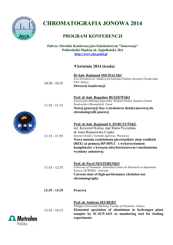 CHROMATOGRAFIA JONOWA 2014 PROGRAM KONFERENCJI Zabrze, Ośrodek Konferencyjno-Szkoleniowym "Innowacja" Politechniki Śląskiej ul. Jagiellońska 38A http://www.oks.polsl.pl 9 kwietnia 2014 (środa) Dr hab. Rajmund MICHALSKI 10:30 - 10:35 Z-ca Dyrektora ds. Naukowych Instytutu Podstaw Inżynierii Środowiska PAN, Zabrze Otwarcie konferencji Prof. dr hab. Bogusław BUSZEWSKI 11:35 - 11:15 Uniwersytet Mikołaja Kopernika, Wydział Chemii, Katedra Chemii Środowiska i Bioanalityki, Toruń Nowej generacji fazy o strukturze dendrymerowej do chromatografii jonowej Prof. dr hab. Rajmund S. DYBCZYŃSKI, inż. Krzysztof Kulisa, mgr Marta Pyszyńska, dr Anna Bojanowska-Czajka 11:15 - 11:55 Instytut Chemii i Techniki Jądrowej, Warszawa Nowa metoda rozdzielania pierwiastków ziem rzadkich (REE) za pomocą RP-HPLC z wykorzystaniem kompleksów z kwasem nitrylotrioctowym i mechanizmu wymiany anionowej Prof. dr Pavel NESTERENKO 11:55 - 12:35 University of Tasmania, Australian Centre for Research on Separation Science (ACROSS), Australia Current state of high-performance chelation ion chromatography 12:35 - 13:35 Przerwa Prof. dr Andreas SEUBERT Philipps-Universität Marburg, Faculty of Chemistry, Niemcy 13:35 - 14:15 Elemental speciation of aluminium in hydrangea plant samples by IC-ICP-AES as monitoring tool for feeding experiments 14:15 - 14:55 Prof. dr Hartmut HERMANN TROPOS - Leibniz Institute for Tropospheric Research Lipsk, Niemcy Ion analytics in atmospheric chemistry research Mgr inż. Karolina MACIEJEWSKAa, mgr inż. Kamil Żukowskia, prof. dr hab. inż. Artur Dybkoa, inż. Dawid Kapicab, prof. dr hab. Inż. Maria Balcerzakb 14:55 - 15:15 Politechnika Warszawska, Wydział Chemiczny, Warszawa a Zakład Mikrobioanalityki, bKatedra Chemii Analitycznej Miniaturowy detektor konduktometryczny do zastosowań w chromatografii jonowej Dr hab. Marcin FRANKOWSKI, dr Anetta Zioła-Frankowska 15:15 - 15:35 Uniwersytet A. Mickiewicza, Wydział Chemii, Zakład Analizy Wody i Gruntów, Poznań Oznaczanie nieorganicznych i organicznych kompleksów glinu, specjacja i modelowanie Dr hab. Leonard BOSZKE, mgr inż. Wiesław Orlikowski, mgr inż. Justyna Śliwińska, mgr inż. Joanna Paczkowska 15:35 - 15:55 Uniwersytet Technologiczno-Przyrodniczy im. J.J. Śniadeckich, Wydział Budownictwa, Architektury i Inżynierii Środowiska, Katedra Inżynierii Sanitarnej i Wodnej, Bydgoszcz Zawartość wybranych jonów w wodzie z Zatoki Puckiej w trakcie zrzutu solanki z budowanych podziemnych magazynów gazu w Kosakowie 15:55-16:00 Podsumowanie pierwszego dnia konferencji 10:00 - 16:00 I sesja posterowa 16:00 Wyjazd autobusami z Zabrza do kopalni srebra w Tarnowskich Górach(http://www.kopalniasrebra.pl) i uroczysta kolacja 23:00 Powrót autobusami do Zabrza 10 kwietnia 2014 (czwartek) Dr Jay GANDHI 9:00 - 9:40 Regulatory Affairs Manager, Metrohm, USA Applied ion analysis of various water matrices in hydraulic fracturing process Prof. Wolfgang FRENZEL 9:40 - 10:20 Technical University of Berlin, Department of Environmental Technology, Berlin, Niemcy In-line sample preparation for selectivity and sensitivity enhancement in ion chromatography Dr hab. Marek Gryta, mgr inż. Justyna BASTRZYK, mgr inż. Michał Bogacki 10:20 - 10:40 Zachodniopomorski Uniwersytet Technologiczny w Szczecinie, Wydział Technologii i Inżynierii Chemicznej, Instytut Technologii Chemicznej Nieorganicznej i Inżynierii Środowiska, Szczecin Zastosowanie chromatografii jonowej w badaniach procesu nanofiltracji 10:40 - 11:00 Dr Magdalena JABŁOŃSKA-CZAPLA, mgr inż. Sebastian Szopa, dr hab. Rajmund Michalski, mgr inż. Aleksandra Łyko Instytut Podstaw Inżynierii Środowiska PAN, Zabrze Zagrożenia środowiskowe związane z występowaniem form specjacyjnych arsenu, antymonu oraz chromu w zbiorniku wodnym poddanym antropopresji termicznej Mgr inż. Marcin WIKLAK 11:00:11:15 Metrom Polska Wystąpienie promocyjne 11:15 - 11:45 Przerwa Dr Katarzyna POKAJEWICZ 11:45 – 12:00 Sigma-Aldrich Polska Wystąpienie promocyjne Dr Franz SCHMITZ 12:00 - 12:30 Hesse State Laboratory, Wiesbaden, Niemcy Development of IC standards: State of the art, Present projects, Proposed projects Dr Gabriele ZIERFELS 12:30 - 13:00 Metrohm International Headquarters, Herisau, Szwajcaria Food analysis with ion chromatography 13:00 - 13:20 Dr inż. Joanna POKORNY Katedra Botaniki i Ekologii Roślin, Uniwersytet Przyrodniczy we Wrocławiu Wykorzystanie metod elektroferezy białek w badaniach nad zagrożonymi i ginącymi gatunkami storczyków (Orchidaceae) Dr inż. Sylwia MAGIERA 13:20 - 13:40 13:40 - 14:00 Politechnika Śląska, Wydział Chemiczny, Katedra Chemii Nieorganicznej, Analitycznej i Elektrochemii, Gliwice Rozwiązania metodyczne do izolacji leków i ich metabolitów z płynów biologicznych Dr hab. Rajmund MICHALSKI Instytut Podstaw Inżynierii Środowiska PAN, Zabrze X lat konferencji “Chromatografia jonowa 14:00 - 14:15 Podsumowanie konferencji 8:00 - 14:00 II sesja posterowa W imieniu Komitetu Organizacyjnego Konferencji dr hab. Rajmund Michalski, prof. IPIŚ PAN Sponsorzy konferencji SPONSOR GŁÓWNY http://www.metrohm.pl/ http://www.sigmaaldrich.com/poland http://www.hlpolska.pl/ Patroni medialni konferencji: www.laboratorium.elamed.pl http://www.miesiecznikchemik.pl