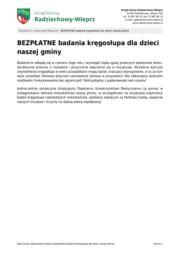Urząd Gminy Radziechowy-Wieprz 34-381 Radziechowy, Wieprz 700 tel. 33 867 66 10, fax. 33 867 66 13 e-mail: [email protected] www.radziechowy-wieprz.pl Współpraca › Uniwersytet Medyczny › BEZPŁATNE badania kręgosłupa dla dzieci naszej gminy BEZPŁATNE badania kręgosłupa dla dzieci naszej gminy Badania te odbędą się w czerwcu tego roku i wymagać będą zgody prawnych opiekunów dzieci. Serdecznie prosimy o rozważne i przychylne włączenie się w inicjatywę. Wcześnie wykryte zwyrodnienia kręgosłupa w wielu przypadkach mogą zostać znacząco skorygowane, a co za tym idzie umożliwić Państwa dzieciom zachowanie zdrowia w przyszłości! Nie odbierajmy dzieciom możliwości funkcjonowania bez ograniczeń! Skorzystajmy z podarowanej nam szansy! Jednocześnie serdecznie dziękujemy Śląskiemu Uniwersytetowi Medycznemu za pomoc w pielęgnowaniu zdrowia mieszkańców naszej gminy, w szczególności za inicjatywę organizacji badań kręgosłupa najmłodszych mieszkańców. Jesteśmy wdzięczni za Państwa troskę, wsparcie naszych inicjatyw i liczymy na dalszą dobrą współpracę! http://www.radziechowy-wieprz.pl/bezplatne-badania-kregoslupa-dla-dzieci-naszej-gminy Strona 1