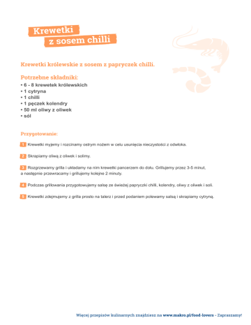 Krewetki z sosem chilli Krewetki królewskie z sosem z papryczek chilli. Potrzebne składniki: • 6 - 8 krewetek królewskich • 1 cytryna • 1 chilli • 1 pęczek kolendry • 50 ml oliwy z oliwek • sól Przygotowanie: 1 Krewetki myjemy i rozcinamy ostrym nożem w celu usunięcia nieczystości z odwłoka. 2 Skrapiamy oliwą z oliwek i solimy. 3 Rozgrzewamy grilla i układamy na nim krewetki pancerzem do dołu. Grillujemy przez 3-5 minut, a następnie przewracamy i grillujemy kolejne 2 minuty. 4 Podczas grillowania przygotowujemy salsę ze świeżej papryczki chilli, kolendry, oliwy z oliwek i soli. 5 Krewetki zdejmujemy z grilla prosto na talerz i przed podaniem polewamy salsą i skrapiamy cytryną. Więcej przepisów kulinarnych znajdziesz na www.makro.pl/food-lovers - Zapraszamy!