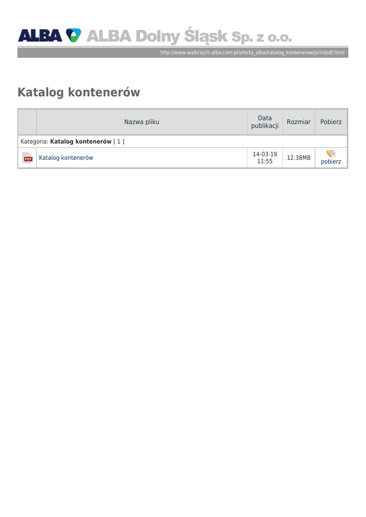 http://www.walbrzych.alba.com.pl/oferta_alba/katalog_kontenerow/printpdf.html Katalog kontenerów Nazwa pliku Data publikacji Rozmiar 14-03-19 11:55 12.38MB Pobierz Kategoria: Katalog kontenerów [ 1 ] Katalog kontenerów pobierz