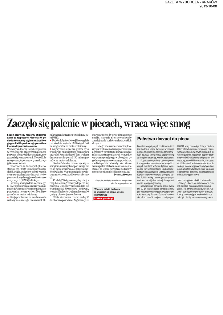GAZETA WYBORCZA - KRAKÓW 2013-10-08 I Zaczęło się palenie w piecach, wraca więc smog Sezon grzewczy możemy oficjalnie uznać za rozpoczęty. Niestety! W po niedziałek normy stężenia szkodliwe go pyłu PM10 przekroczyły ponaddwukrotnie dopuszczalne normy. Wszyscy ci, którzy liczyli, że jeszcze w tym sezonie grzewczym zobaczą pierwsze efekty walki ze smogiem, mo gą czuć się rozczarowani. Nie dość, że smog wraca, to jeszcze wtym roku wy jątkowo wcześnie. To oznacza, że do naszych płuc do staje się pyl PM10. To zabójczy koktajl siarki, węgla, związków azotu, wapnia oraz trujących rakotwórczych wielo pierścieniowych węglowodorów aro matycznych (WWA) i dioksyn. Wczoraj w ciągu dnia stężenie py łu PM10 przekraczało normy co naj mniej dwukrotnie. Przypomnijmy do puszczalna norma wynosi 50 mikrogramów na metr sześcienny. • Stacja pomiarowa na Kurdwanowie wskazywała w ciągu dnia nawet 100 mikrogramów na metr sześcienny py łu PM10. • Podobnie było w Nowej Hucie, gdzie po południu stężenie PM10 sięgało 140 mikrogramów na metr sześcienny. • Najwyższe stężenie pyłów było w centrum miasta (stacja pomiarowa przy alei Krasińskiego). Tam w ciągu dnia wynosiło ponad 150 mikrogra mów na metr sześcienny. To dowód na to, że mierząc się ze smogiem, musimy brać pod uwagę nie tylko piece węglowe, ale także samo chody, które wypuszczają do powie trza mnóstwo szkodliwych substan cji. Co dalej? Dalej, niestety będzie go rzej, bo sezon grzewczy dopiero się zaczyna. Choć w tym roku udało się wymienić już 800 pieców i kotłowni, wciąż w Krakowie truje nas kolejne 30 tysięcy pieców (szacunkowo). Także kierowców trudno zachęcić do dbania o powietrze. Argumenty że stare samochody produkują szereg spalin, na razie nie spowodowały zmniej szenia korków na krakowskich drogach. Dlatego wielu mieszkańców, któ rzyjuż w płucach odczuli pierwsze dni z pyłami w powietrzu, liczy, że władze miasta zaczną realizować wszystkie wytyczne przyjętego w ubiegłym ty godniu programu ochrony powietrza, a wlistopadzie uchwalą zakaz stoso wania paliw stałych. Jeśli tak się nie stanie, na lepsze powietrze będziemy czekać co najmniej kilkadziesiąt lat. DOMINIKA WAŃTUCH O tym, ile pieniędzy Kraków ma na wymianę piecówwęglowych-s. 4 Więcej o batalii Krakowa ze smogiem na naszej stronie internetowej Państwo dorzuci do pieca Powietrze w największych polskich miastach jest fatalne, a unijne dyrektywy wymagają od nas zmniejszenia stężenia zanieczysz czeń do 2020 r. Inne miasta dopiero walkę ze smogiem zaczynają, Krakówjestliderem. Dopuszczalne poziomy pyłów w powie trzu są przekroczone niemal we wszystkich dużych miastach w Polsce. Fatalnie wypa da pod tym względem Górny Śląsk, ale rów nież Wrocław, Warszawa, Łódź czy Rzeszów. Kraków - niekwestionowana smogowa sto lica Polski - walkę z zanieczyszczonym po wietrzem zaczął już wcześniej, dlatego jest do niej lepiej przygotowany. Najważniejszą przyczyną emisji pyłów PM 10 czy rakotwórczego benzo (a) pirenu jest opalanie domów węglem. Dlatego w tym roku Narodowy Fundusz Ochrony Środowi ska i Gospodarki Wodnej uruchomił program KAWKA, który przewiduje dotacje dla tych, którzy zdecydują się na rezygnację z ogrze wania węglowego. W innych miastach o lik widacji palenisk węglowych dopiero zaczy na się mówić, w Krakowie taki program pro wadzony jest od kilkunastu lat, a w ostat nich kilku latach wniosków o dotacje na lik widację pieców węglowych przybywa lawi nowo. Wkrótce w Krakowie może tez zacząć obowiązywać całkowity zakaz ogrzewania mieszkań węglem.o PCG Jutro na ogólnopolskich stronach „Gazety" ukaże się informator o tym, jak polskie miasta walczą ze smo giem. Na stronach krakowskich „Ga zety" zamieścimy poradnik dla tych, którzy mieszkają w Krakowie i chcą zdobyć pieniądze na wymianę pieca.
