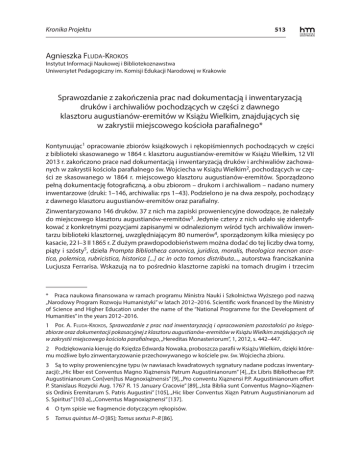 Kronika Projektu 513 Agnieszka Fluda-Krokos Instytut Informacji Naukowej i Bibliotekoznawstwa Uniwersytet Pedagogiczny im. Komisji Edukacji Narodowej w Krakowie Sprawozdanie z zakończenia prac nad dokumentacją i inwentaryzacją druków i archiwaliów pochodzących w części z dawnego klasztoru augustianów-eremitów w Książu Wielkim, znajdujących się w zakrystii miejscowego kościoła parafialnego* Kontynuując1 opracowanie zbiorów książkowych i rękopiśmiennych pochodzących w części z biblioteki skasowanego w 1864 r. klasztoru augustianów-eremitów w Książu Wielkim, 12 VII 2013 r. zakończono prace nad dokumentacją i inwentaryzacją druków i archiwaliów zachowanych w zakrystii kościoła parafialnego św. Wojciecha w Książu Wielkim2, pochodzących w części ze skasowanego w 1864 r. miejscowego klasztoru augustianów-eremitów. Sporządzono pełną dokumentację fotograficzną, a obu zbiorom – drukom i archiwaliom – nadano numery inwentarzowe (druki: 1–146, archiwalia: rps 1–43). Podzielono je na dwa zespoły, pochodzący z dawnego klasztoru augustianów-eremitów oraz parafialny. Zinwentaryzowano 146 druków. 37 z nich ma zapiski proweniencyjne dowodzące, że należały do miejscowego klasztoru augustianów-eremitów3. Jedynie cztery z nich udało się zidentyfikować z konkretnymi pozycjami zapisanymi w odnalezionym wśród tych archiwaliów inwentarzu biblioteki klasztornej, uwzględniającym 80 numerów4, sporządzonym kilka miesięcy po kasacie, 22 I–3 II 1865 r. Z dużym prawdopodobieństwem można dodać do tej liczby dwa tomy, piąty i szósty5, dzieła Prompta Bibliotheca canonica, juridica, moralis, theologica necnon ascetica, polemica, rubricistica, historica [...] ac in octo tomos distributa..., autorstwa franciszkanina Lucjusza Ferrarisa. Wskazują na to pośrednio klasztorne zapiski na tomach drugim i trzecim * Praca naukowa finansowana w ramach programu Ministra Nauki i Szkolnictwa Wyższego pod nazwą „Narodowy Program Rozwoju Humanistyki” w latach 2012–2016. Scientific work financed by the Ministry of Science and Higher Education under the name of the “National Programme for the Development of Humanities” in the years 2012–2016. 1 Por. A. Fluda-Krokos, Sprawozdanie z prac nad inwentaryzacją i opracowaniem pozostałości po księgozbiorze oraz dokumentacji pokasacyjnej z klasztoru augustianów-eremitów w Książu Wielkim znajdujących się w zakrystii miejscowego kościoła parafialnego, „Hereditas Monasteriorum”, 1, 2012, s. 442–447. 2 Podziękowania kieruję do Księdza Edwarda Nowaka, proboszcza parafii w Książu Wielkim, dzięki któremu możliwe było zinwentaryzowanie przechowywanego w kościele pw. św. Wojciecha zbioru. 3 Są to wpisy proweniencyjne typu (w nawiasach kwadratowych sygnatury nadane podczas inwentaryzacji): „Hic liber est Conventus Magno Xiążnensis Patrum Augustinianorum” [4], „Ex Libris Bibliothecae P.P. Augustinianorum Con[ven]tus Magnoxiążnensis” [9], „Pro conventu Xiąznensi P.P. Augustinianorum offert P. Stanislaus Rozycki Aug. 1767 R. 15 January Cracovie” [89], „Ista Biblia sunt Conventus Magno=Xiąznensis Ordinis Eremitarum S. Patris Augustini” [105], „Hic liber Conventus Xiązn Patrum Augustinianorum ad S. Spiritus” [103 a], „Conventus Magnoxiąznensi” [137]. 4 O tym spisie we fragmencie dotyczącym rękopisów. 5 Tomus quintus M–O [85]; Tomus sextus P–R [86]. 514 Kronika Projektu tegoż dzieła6, pochodzące z tegoż ośmiotomowego wydania. Za pochodzące z dawnej biblioteki klasztornej uznać można także osiem innych druków bez proweniencji, których tytuły pojawiają się we wspomnianym inwentarzu biblioteki. W sumie w miarę pewne pochodzenie z książnicy klasztornej można przypisać 47 drukom. W kościele parafialnym św. Wojciecha istniała biblioteczka z księgozbiorem o charakterze religijnym, zgromadzonym głównie dzięki staraniom ks. Adama Brachmana, miejscowego proboszcza w latach 1763–17827. Wiemy też, że na początku XX w. księgozbiorem parafialnym interesował się prof. Józef Kallenbach8. 24 druki noszą datowane w większości na lata 1918–1920 noty nieznanego bliżej ks. Stanisława Kańskiego, przy czym jeden z nich nosi poza tym notę proweniencyjną Antoniego Śliwińskiego († 24 VIII 1894 r.), ostatniego augustianina-eremity, który po kasacie administrował pozostałościami po klasztorze9, oraz wspomnianego ks. Kańskiego10. Szukając innych pozostałości biblioteki klasztornej, przeprowadzono kwerendę w katalogu proweniencji Biblioteki Jagiellońskiej, w której wyniku zidentyfikowano następujące druki11: Artemidorus Daldianus, Janus Cornarius, De Somniorum interpretatione libri quinque, Lugduni 1546 (wpis na stronie tytułowej: „Pro Conventu Xiąznesi”, sygn. Aug. 5080-5081)12; Hieronymo Roman, Constitutiones ordinis eremitarum Sancti Augustini cum additionibus et notis R.F.M. Hieronymi Romani, Coloniae Agrippinae 1627 (wpis na karcie czwartej: „Pro Conventu Xiązn”, sygn. Aug. 5790); planowane są dalsze kwerendy. Zinwentaryzowano także 43 rękopisy. 36 z nich pochodzi z archiwum parafialnego. Są to m.in.: Liber mortuorum Parochiae in Magna Xiąż ab Anno 1846 (do 1853 r.) [rps 10], Raptularz urodzonych 1797–1806 [rps 12], Xięga do zapisu zapowiedzi przedślubnych w Parafii Xiąż Wielki Diecezyi Krakowskiey Powiecie Obwodu Miechowskiego (od 1826 r.) [rps 17], Raptularz urodzonych, zaślubionych i zmarłych (1916–1921) [rps 39]. Pozostałe siedem (sygn. rps 1, 3, 4, 14, 15, 25, 28) to archiwalia poklasztorne, w tym wspomniany wyżej inwentarz biblioteki klasztornej [rps 3]. Tworzony naprędce, zawiera lakoniczne opisy druków składające się ze skrótu tytułu, danych autora lub, rzadko, danych liczbowych, które jednak można odczytać dwojako – jako liczbę posiadanych tomów oraz liczbę egzemplarzy tego samego dzieła. Trzy z 86 numerów w spisie to ogólne stwierdzenia, w żaden sposób