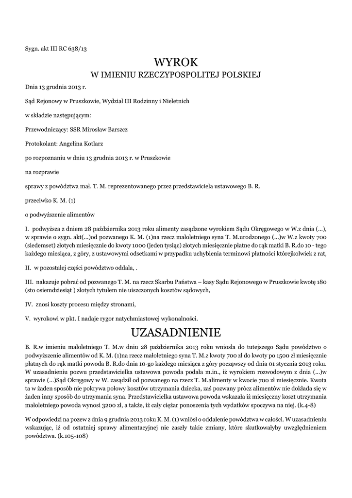 Sygn. akt III RC 638/13 WYROK W IMIENIU RZECZYPOSPOLITEJ POLSKIEJ Dnia 13 grudnia 2013 r. Sąd Rejonowy w Pruszkowie, Wydział III Rodzinny i Nieletnich w składzie następującym: Przewodniczący: SSR Mirosław Barszcz Protokolant: Angelina Kotlarz po rozpoznaniu w dniu 13 grudnia 2013 r. w Pruszkowie na rozprawie sprawy z powództwa mał. T. M. reprezentowanego przez przedstawiciela ustawowego B. R. przeciwko K. M. (1) o podwyższenie alimentów I. podwyższa z dniem 28 października 2013 roku alimenty zasądzone wyrokiem Sądu Okręgowego w W.z dnia (...), w sprawie o sygn. akt(...)od pozwanego K. M. (1)na rzecz małoletniego syna T. M.urodzonego (...)w W.z kwoty 700 (siedemset) złotych miesięcznie do kwoty 1000 (jeden tysiąc) złotych miesięcznie płatne do rąk matki B. R.do 10 - tego każdego miesiąca, z góry, z ustawowymi odsetkami w przypadku uchybienia terminowi płatności którejkolwiek z rat, II. w pozostałej części powództwo oddala, . III. nakazuje pobrać od pozwanego T. M. na rzecz Skarbu Państwa – kasy Sądu Rejonowego w Pruszkowie kwotę 180 (sto osiemdziesiąt ) złotych tytułem nie uiszczonych kosztów sądowych, IV. znosi koszty procesu między stronami, V. wyrokowi w pkt. I nadaje rygor natychmiastowej wykonalności. UZASADNIENIE B. R.w imieniu małoletniego T. M.w dniu 28 października 2013 roku wniosła do tutejszego Sądu powództwo o podwyższenie alimentów od K. M. (1)na rzecz małoletniego syna T. M.z kwoty 700 zł do kwoty po 1500 zł miesięcznie płatnych do rąk matki powoda B. R.do dnia 10-go każdego miesiąca z góry począwszy od dnia 01 stycznia 2013 roku. W uzasadnieniu pozwu przedstawicielka ustawowa powoda podała m.in., iż wyrokiem rozwodowym z dnia (...)w sprawie (...)Sąd Okręgowy w W. zasądził od pozwanego na rzecz T. M.alimenty w kwocie 700 zł miesięcznie. Kwota ta w żaden sposób nie pokrywa połowy kosztów utrzymania dziecka, zaś pozwany prócz alimentów nie dokłada się w żaden inny sposób do utrzymania syna. Przedstawicielka ustawowa powoda wskazała iż miesięczny koszt utrzymania małoletniego powoda wynosi 3200 zł, a także, iż cały ciężar ponoszenia tych wydatków spoczywa na niej. (k.4-8) W odpowiedzi na pozew z dnia 9 grudnia 2013 roku K. M. (1) wniósł o oddalenie powództwa w całości. W uzasadnieniu wskazując, iż od ostatniej sprawy alimentacyjnej nie zaszły takie zmiany, które skutkowałyby uwzględnieniem powództwa. (k.105-108) Na rozprawie w dniu 13 grudnia 2013 roku pełnomocnik strony powodowej popierał powództwo, zaś pełnomocnik pozwanego wnosił jak w odpowiedzi na pozew. (k.132) Sąd Rejonowy ustalił następujący stan faktyczny: Małoletni T. M.urodzony dnia (...)w W.pochodzi ze związku małżeńskiego K. M. (1)i B. M., nazwisko rodowe K., rozwiązanego przez rozwód. Alimenty od K. M. (1)na rzecz małoletniego syna zostały zasądzone wyrokiem rozwodowym Sądu Okręgowego w W.w dniu (...)roku w sprawie (...)na kwotę 700 zł miesięcznie. Wyrok ten uprawomocnił się z dniem 8 stycznia 2013r. Alimenty zostały ustalone w powyższej wysokości przez Sąd Okręgowy z uwagi na ustalenie w tym zakresie pomiędzy stronami postępowania rozwodowego wysokości obowiązku alimentacyjnego K. M. (1). B. R.przyznała w trakcie postępowania rozwodowego, iż alimenty w wysokości 700 zł były niewystarczające, ale zgodziła się na nie. Małoletni T. M. w dacie orzekania w poprzedniej sprawie ustalającej wysokość alimentów mieszkał razem z matką i jej obecnym mężem w P.. Mieszkanie w którym mieszkali było wynajmowane i z tego tytułu uiszczana była opłata w wysokości 1600 zł miesięcznie. Małoletni uczęszczał do szkoły podstawowej w P.. Od początkowych lat życia małoletni pozostawał pod opieką opiekunki, która zajmowała się nim podczas, gdy rodzice małoletniego wykonywali obowiązki zawodowe, czy załatwiali sprawy osobiste. Z tego tytułu uiszczana była stała odpłatność, w poprzednim okresie w wysokości 1150 zł miesięcznie. Poza szkołą małoletni chodził także na zajęcia z piłki nożnej, odpłatne w kwocie ok. 60 zł miesięcznie. W chwili obecnej małoletni T. M. zamieszkuje wraz z matką oraz jej obecnym mężem w P. przy ul. (...). Mieszkanie to zostało nabyte za pomocą kredytu zaciągniętego przez B. R. i R. R. (1). Małoletni T. ma dobry kontakt z ojcem, z którym spędził tydzień wakacji na działce, a także spędza z nim czas po szkole w poniedziałki oraz niektóre weekendy oraz zawozi i przywodzi z zajęć piłkarskich we środy. Małoletnim w dalszym ciągu zajmuje się opiekunka, która obecnie pobiera 1200 zł miesięcznie. Opiekunka zabiera go po lekcjach do siebie, przygotowuje posiłki. Pozostałe potrzeby małoletniego są w zasadzie analogiczne, jak w okresie poprzednim. Nastąpił zauważalny wzrost całościowy potrzeb małoletniego z uwagi na rozwój dziecka, wzrost opłat związanych ze szkołą oraz z uwagi na ogólny wzrost cen w przeciągu roku czasu. Wzrost ten nie powinien jednak przekraczać kwoty 50-100 zł miesięcznie. Małoletni uczęszcza na obiady szkolne, na piłkę nożną, korzysta z leczenia stomatologicznego. W wakacje 2013r. małoletni był na obozie sportowym, którego koszt wynosił 1000 zł. i został pokryty przez matkę małoletniego. Był również z matką tydzień czasu na wyjeździe na M.. Koszty wszystkich opłat szkolnych i wyprawki pokryła B. R.. B. R.(poprzednio M.) w chwili orzekania w poprzedniej sprawie ustalającej wysokość alimentów miała 32 lata. Wraz ze swoim synem wyprowadziła się od męża i w momencie orzekania w sprawie rozwodowej mieszkała ze swoim partnerem w wynajmowanym mieszkaniu. W maju 2013r. zawarła związek małżeński z R. R. (1), z którym obecnie mieszka w P.przy ul. (...)w mieszkaniu stanowiącym ich własność. Mieszkanie zostało nabyte przez małżonków na kredyt. W tego tytułu ponoszone są przez nich comiesięczne raty w wysokości ok. 1625 -1670