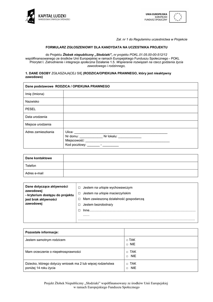 Zał. nr 1 do Regulaminu uczestnictwa w Projekcie FORMULARZ ZGŁOSZENIOWY DLA KANDYDATA NA UCZESTNIKA PROJEKTU do Projektu Żłobek niepubliczny „Słodziaki”, nr projektu POKL.01.05.00-00-512/12 współfinansowanego ze środków Unii Europejskiej w ramach Europejskiego Funduszu Społecznego - POKL Priorytet I. Zatrudnienie i integracja społeczna Działanie 1.5. Wspieranie rozwiązań na rzecz godzenia życia zawodowego i rodzinnego, 1. DANE OSOBY ZGŁASZAJĄCEJ SIĘ (RODZICA/OPIEKUNA PRAWNEGO, który jest nieaktywny zawodowo) Dane podstawowe RODZICA / OPIEKUNA PRAWNEGO Imię (Imiona) Nazwisko PESEL Data urodzenia Miejsce urodzenia Adres zamieszkania Ulica: ____________________________________________________ Nr domu: _____________ Nr lokalu: _____________ Miejscowość: _______________________________________________ Kod pocztowy: _______ - _________ Dane kontaktowe Telefon Adres e-mail Dane dotyczące aktywności zawodowej - kryterium dostępu do projektu jest brak aktywności zawodowej □ □ □ □ □ Jestem na urlopie wychowawczym Jestem na urlopie macierzyńskim Mam zawieszoną działalność gospodarczą Jestem bezrobotna/y Inne……………………………………………………………………………………… …… ………………………………………………………………………………………………. Pozostałe informacje: Jestem samotnym rodzicem □ TAK □ NIE Mam orzeczenie o niepełnosprawności □ TAK □ NIE Dziecko, którego dotyczy wniosek ma 2 lub więcej rodzeństwa poniżej 14 roku życia □ TAK □ NIE Projekt Żłobek Niepubliczny „Słodziaki” współfinansowany ze środków Unii Europejskiej w ramach Europejskiego Funduszu Społecznego 2. DANE DZIECKA (jeśli dzieci jest więcej proszę wpisywać dane obok siebie) Dane podstawowe DZIECKA Imię (Imiona) Nazwisko PESEL Data urodzenia Miejsce urodzenia Adres zamieszkania Ulica: _____________________________________________________ Nr domu: _____________ Nr lokalu: _____________ Miejscowość: _______________________________________________ Kod pocztowy: _______ - ____________ Inne informacje Stopień niepełnosprawności dziecka zgodny z zaświadczeniem lekarskim □ □ □ □ Nie dotyczy Lekki Umiarkowany Znaczy Dziecko jest na liście oczekujących na miejsce do żłobka w Warszawie: □ TAK – proszę podać nr żłobka □ NIE Jestem zainteresowana/y: - całodzienną opieką (10 godzin) - pobytem częściowym (5 godzin) (proszę wpisać TAK/NIE poniżej) □ ………………. □ …………………. Proszę zaznaczyć preferowane godziny otwarcia żłobka (preferencja będzie brana pod uwagę przy ustaleniu godzin otwarcia) A) 7.00 – 17.00 B) 7.30 – 17.30 C) 8.00 – 18.00 (proszę wybrać od 1 do 3) □ TAK (A) □ TAK (B) □ TAK (C) Ja, niżej podpisany/na, pouczony/na o odpowiedzialności karnej przewidzianej w art. 233 §1 Kodeksu Karnego1 oświadczam, że przedłożone przeze mnie w niniejszej deklaracji informacje są zgodne ze stanem faktycznym oraz, że zapoznałem/am się z Regulaminem uczestnictwa w projekcie Żłobek Niepubliczny „Słodziaki”. …................................................................ miejscowość i data …................................................................ podpis rodzica/opiekuna prawnego zgłaszającego się 1 Art. 233 §1: Kto składa zeznania mające służyć za dowód w postępowaniu sądowym lub innym postępowaniu prowadzonym na podstawie ustawy, zeznaje nieprawdę lub zataja prawdę, podlega karze pozbawienia wolności do lat 3. §2: Warunkiem odpowiedzialności jest, aby przyjmujący zeznanie, działając w zakresie swych uprawnień, uprzedził zeznającego o odpowiedzialności karnej za fałszywe zeznania lub odebrał od niego przyrzeczenie. Projekt Żłobek Niepubliczny „Słodziaki” współfinansowany ze środków Unii Europejskiej w ramach Europejskiego Funduszu Społecznego