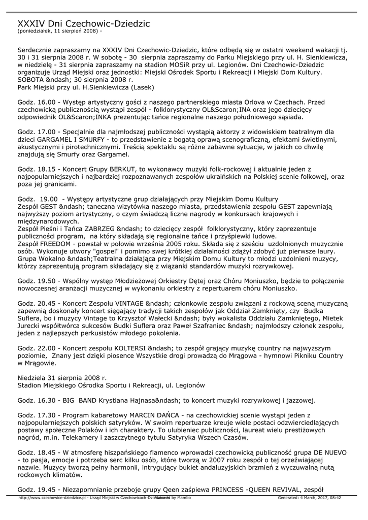 XXXIV Dni Czechowic-Dziedzic (poniedziałek, 11 sierpień 2008) - Serdecznie zapraszamy na XXXIV Dni Czechowic-Dziedzic, które odbędą się w ostatni weekend wakacji tj. 30 i 31 sierpnia 2008 r. W sobotę - 30 sierpnia zapraszamy do Parku Miejskiego przy ul. H. Sienkiewicza, w niedzielę - 31 sierpnia zapraszamy na stadion MOSiR przy ul. Legionów. Dni Czechowic-Dziedzic organizuje Urząd Miejski oraz jednostki: Miejski Ośrodek Sportu i Rekreacji i Miejski Dom Kultury. SOBOTA – 30 sierpnia 2008 r. Park Miejski przy ul. H.Sienkiewicza (Lasek) Godz. 16.00 - Występ artystyczny gości z naszego partnerskiego miasta Orlova w Czechach. Przed czechowicką publicznością wystąpi zespół - folklorystyczny OLŠINA oraz jego dziecięcy odpowiednik OLŠINKA prezentując tańce regionalne naszego południowego sąsiada. Godz. 17.00 - Specjalnie dla najmłodszej publiczności wystąpią aktorzy z widowiskiem teatralnym dla dzieci GARGAMEL I SMURFY - to przedstawienie z bogatą oprawą scenograficzną, efektami świetlnymi, akustycznymi i pirotechnicznymi. Treścią spektaklu są różne zabawne sytuacje, w jakich co chwilę znajdują się Smurfy oraz Gargamel. Godz. 18.15 - Koncert Grupy BERKUT, to wykonawcy muzyki folk-rockowej i aktualnie jeden z najpopularniejszych i najbardziej rozpoznawanych zespołów ukraińskich na Polskiej scenie folkowej, oraz poza jej granicami. Godz. 19.00 - Występy artystyczne grup działających przy Miejskim Domu Kultury Zespół GEST – taneczna wizytówka naszego miasta, przedstawienia zespołu GEST zapewniają najwyższy poziom artystyczny, o czym świadczą liczne nagrody w konkursach krajowych i międzynarodowych. Zespół Pieśni i Tańca ZABRZEG – to dziecięcy zespół folklorystyczny, który zaprezentuje publiczności program, na który składają się regionalne tańce i przyśpiewki ludowe. Zespół FREEDOM - powstał w połowie września 2005 roku. Składa się z sześciu uzdolnionych muzycznie osób. Wykonuje utwory "gospel" i pomimo swej krótkiej działalności zdążył zdobyć już pierwsze laury. Grupa Wokalno –Teatralna działająca przy Miejskim Domu Kultury to młodzi uzdolnieni muzycy, którzy zaprezentują program składający się z wiązanki standardów muzyki rozrywkowej. Godz. 19.50 - Wspólny występ Młodzieżowej Orkiestry Dętej oraz Chóru Moniuszko, będzie to połączenie nowoczesnej aranżacji muzycznej w wykonaniu orkiestry z repertuarem chóru Moniuszko. Godz. 20.45 - Koncert Zespołu VINTAGE – członkowie zespołu związani z rockową sceną muzyczną zapewnią doskonały koncert sięgający tradycji takich zespołów jak Oddział Zamknięty, czy Budka Suflera, bo i muzycy Vintage to Krzysztof Wałecki – były wokalista Oddziału Zamkniętego, Mietek Jurecki współtwórca sukcesów Budki Suflera oraz Paweł Szafraniec – najmłodszy członek zespołu, jeden z najlepszych perkusistów młodego pokolenia. Godz. 22.00 - Koncert zespołu KOLTERSI – to zespół grający muzykę country na najwyższym poziomie, Znany jest dzięki piosence Wszystkie drogi prowadzą do Mrągowa - hymnowi Pikniku Country w Mrągowie. Niedziela 31 sierpnia 2008 r. Stadion Miejskiego Ośrodka Sportu i Rekreacji, ul. Legionów Godz. 16.30 - BIG BAND Krystiana Hajnasa– to koncert muzyki rozrywkowej i jazzowej. Godz. 17.30 - Program kabaretowy MARCIN DAŃCA - na czechowickiej scenie wystąpi jeden z najpopularniejszych polskich satyryków. W swoim repertuarze kreuje wiele postaci odzwierciedlających postawy społeczne Polaków i ich charaktery. To ulubieniec publiczności, laureat wielu prestiżowych nagród, m.in. Telekamery i zaszczytnego tytułu Satyryka Wszech Czasów. Godz. 18.45 - W atmosferę hiszpańskiego flamenco wprowadzi czechowicką publiczność grupa DE NUEVO - to pasja, emocje i potrzeba serc kilku osób, które tworzą w 2007 roku zespół o tej orzeźwiającej nazwie. Muzycy tworzą pełny harmonii, intrygujący bukiet andaluzyjskich brzmień z wyczuwalną nutą rockowych klimatów. Godz. 19.45 - Niezapomnianie przeboje grupy Qeen zaśpiewa PRINCESS -QUEEN REVIVAL, zespół http://www.czechowice-dziedzice.pl - Urząd Miejski w Czechowicach-Dziedzicach Powered by Mambo Generated: 4 March, 2017, 08:42 pochodzący z Czech, który jest wierną kopią brytyjskiego zespołu. Charyzmatyczny wokalista naśladuje Frediego Merkurego zarówno wyglądem, jak i samym śpiewem, wprowadzając publiczność w atmosferę prawdziwego koncertu legendarnej grupy. Godz. 21.15 - Koncert PATRYCJI KOSIARKIEWICZ - W roku 1998 otrzymała nominację do Nagród Akademii Fonograficznej Fryderyki w kategorii "Fonograficzny debiut roku". Po blisko 7 latach przerwy nagrała płytę Rocznik`72. Muzycznie wykorzystane zostały tu brzmienia lat siedemdziesiątych, muzyki klubowej, etno, jak i wpływy rythm & bluesa. Godz. 22.15 - Koncert gwiazdy wieczoru zespołu FEEL - zespół zadebiutował na listach przebojów w 2007 roku dzięki przebojowemu singlowi "Jest już ciemno". Utwór ten dostał się do wyścigu o nagrodę Bursztynowego Słowika podczas międzynarodowego festiwalu piosenki w Sopocie. Oprócz Bursztynowego Słowika Feel zdobył także nagrodę publiczności. Po koncercie gwiazdy wieczoru około godz. 23.00 – pokaz sztucznych ogni http://www.czechowice-dziedzice.pl - Urząd Miejski w Czechowicach-Dziedzicach Powered by Mambo Generated: 4 March, 2017, 08:42