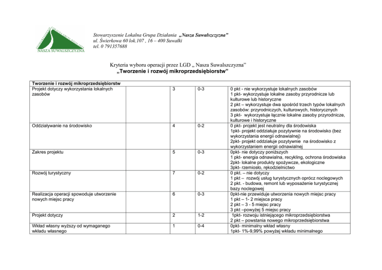 Stowarzyszenie Lokalna Grupa Działania „Nasza Suwalszczyzna” ul. Świerkowa 60 lok.107 , 16 – 400 Suwałki tel. 0 791357688 Kryteria wyboru operacji przez LGD „ Nasza Suwalszczyzna” „Tworzenie i rozwój mikroprzedsiębiorstw” Tworzenie i rozwój mikroprzedsiębiorstw Projekt dotyczy wykorzystania lokalnych zasobów 3 0-3 Oddziaływanie na środowisko 4 0-2 Zakres projektu 5 0-3 Rozwój turystyczny 7 0-2 Realizacja operacji spowoduje utworzenie nowych miejsc pracy 6 0-3 Projekt dotyczy 2 1-2 Wkład własny wyższy od wymaganego wkładu własnego 1 0-4 0 pkt - nie wykorzystuje lokalnych zasobów 1 pkt- wykorzystuje lokalne zasoby przyrodnicze lub kulturowe lub historyczne 2 pkt – wykorzystuje dwa spośród trzech typów lokalnych zasobów: przyrodniczych, kulturowych, historycznych 3 pkt- wykorzystuje łącznie lokalne zasoby przyrodnicze, kulturowe i historyczne 0 pkt- projekt jest neutralny dla środowiska 1pkt- projekt oddziałuje pozytywnie na środowisko (bez wykorzystania energii odnawialnej) 2pkt- projekt oddziałuje pozytywnie na środowisko z wykorzystaniem energii odnawialnej 0pkt- nie dotyczy poniższych 1 pkt- energia odnawialna, recykling, ochrona środowiska 2pkt- lokalne produkty spożywcze, ekologiczne 3pkt- rzemiosło, rękodzielnictwo 0 pkt. – nie dotyczy 1 pkt – rozwój usług turystycznych oprócz noclegowych 2 pkt. - budowa, remont lub wyposażenie turystycznej bazy noclegowej 0pkt-nie przewiduje utworzenia nowych miejsc pracy 1 pkt – 1- 2 miejsca pracy 2 pkt – 3 - 5 miejsc pracy 3 pkt –powyżej 5 miejsc pracy 1pkt- rozwoju istniejącego mikroprzedsiębiorstwa 2 pkt – powstania nowego mikroprzedsiębiorstwa 0pkt- minimalny wkład własny 1pkt- 1%-9,99% powyżej wkładu minimalnego 2 pkt- 10%-19,99% powyżej wkładu minimalnego 3 pkt- 20%-29,99% powyżej wkładu minimalnego 4 pkt- powyżej 30% powyżej wkładu minimalnego Projekt realizowany w partnerstwie, w którego skład wchodzą 4 0-3 Innowacyjność projektu 4 0-4 0pkt-brak partnerstwa 1 pkt- dwa podmioty 2 pkt- trzy podmioty 3pkt- powyżej trzech podmiotów 0pkt- brak innowacyjności 1pkt-formy niewymienione poniżej 2pkt- nowy rodzaj produkcji lub usługi na terenie LSR dodatkowo 2 pkt za nowatorski sposób wykorzystania lokalnych zasobów