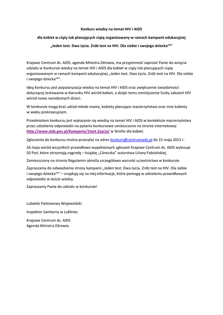 Konkurs wiedzy na temat HIV i AIDS dla kobiet w ciąży lub planujących ciążę organizowany w ramach kampanii edukacyjnej „Jeden test. Dwa życia. Zrób test na HIV. Dla siebie i swojego dziecka™” Krajowe Centrum ds. AIDS, agenda Ministra Zdrowia, ma przyjemność zaprosić Panie do wzięcia udziału w Konkursie wiedzy na temat HIV i AIDS dla kobiet w ciąży lub planujących ciążę organizowanym w ramach kampanii edukacyjnej „Jeden test. Dwa życia. Zrób test na HIV. Dla siebie i swojego dziecka™”. Ideą Konkursu jest popularyzacja wiedzy na temat HIV i AIDS oraz zwiększenie świadomości dotyczącej testowania w kierunku HIV wśród kobiet, a dzięki temu zmniejszenie liczby zakażeń HIV wśród nowo narodzonych dzieci. W konkursie mogą brać udział młode mamy, kobiety planujące macierzyństwo oraz inne kobiety w wieku prokreacyjnym. Przedmiotem konkursu jest wykazanie się wiedzą na temat HIV i AIDS w kontekście macierzyństwa przez udzielenie odpowiedzi na pytania konkursowe umieszczone na stronie internetowej http://www.aids.gov.pl/kampanie/1test.2zycia/ w Strefie dla kobiet. Zgłoszenia do konkursu można przesyłać na adres [email protected] do 22 maja 2015 r. 26 maja wśród wszystkich prawidłowo wypełnionych zgłoszeń Krajowe Centrum ds. AIDS wylosuje 50 Pań, które otrzymają nagrodę – książkę „Córeczka” autorstwa Liliany Fabisińskiej. Zamieszczony na stronie Regulamin określa szczegółowo warunki uczestnictwa w konkursie. Zapraszamy do odwiedzenia strony kampanii „Jeden test. Dwa życia. Zrób test na HIV. Dla siebie i swojego dziecka™” – znajdują się na niej informacje, które pomogą w udzieleniu prawidłowych odpowiedzi w teście wiedzy. Zapraszamy Panie do udziału w konkursie! Lubelski Państwowy Wojewódzki Inspektor Sanitarny w Lublinie; Krajowe Centrum ds. AIDS Agenda Ministra Zdrowia.