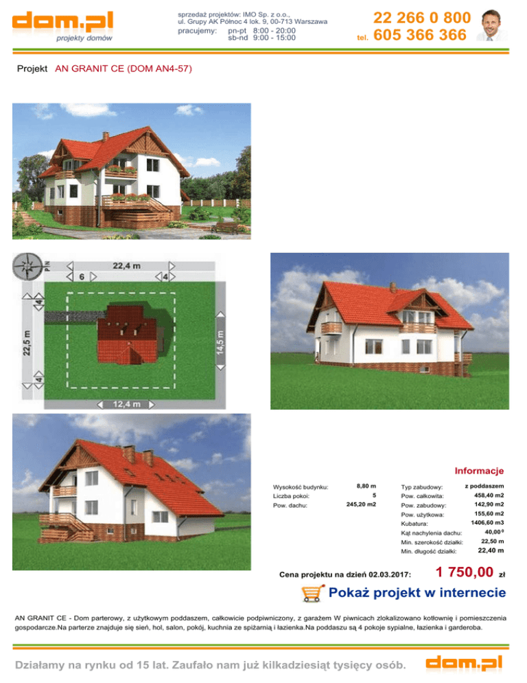 sprzedaż projektów: IMO Sp. z o.o., ul. Grupy AK Północ 4 lok. 9, 00-713 Warszawa pracujemy: pn-pt 8:00 - 20:00 sb-nd 9:00 - 15:00 22 266 0 800 tel. 605 366 366 Projekt AN GRANIT CE (DOM AN4-57) Informacje Wysokość budynku: Liczba pokoi: Pow. dachu: 8,80 m Typ zabudowy: z poddaszem 5 Pow. całkowita: 458,40 m2 Pow. zabudowy: 142,90 m2 245,20 m2 Pow. użytkowa: 155,60 m2 1406,60 m3 Kubatura: Kąt nachylenia dachu: 40,00 0 Min. szerokość działki: 22,50 m Min. długość działki: Cena projektu na dzień 02.03.2017: 22,40 m 1 750,00 zł Pokaż projekt w internecie AN GRANIT CE - Dom parterowy, z użytkowym poddaszem, całkowicie podpiwniczony, z garażem W piwnicach zlokalizowano kotłownię i pomieszczenia gospodarcze.Na parterze znajduje się sień, hol, salon, pokój, kuchnia ze spiżarnią i łazienka.Na poddaszu są 4 pokoje sypialne, łazienka i garderoba. Działamy na rynku od 15 lat. Zaufało nam już kilkadziesiąt tysięcy osób.