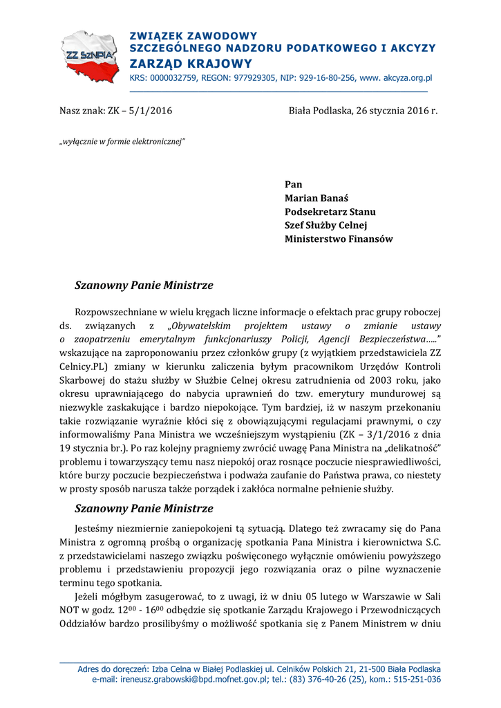 ZWIĄZEK ZAWODOWY SZCZEGÓLNEGO NADZORU PODATKOWEGO I AKCYZY ZARZĄD KRAJOWY KRS: 0000032759, REGON: 977929305, NIP: 929-16-80-256, www. akcyza.org.pl _________________________________________________________________ Nasz znak: ZK – 5/1/2016 Biała Podlaska, 26 stycznia 2016 r. „wyłącznie w formie elektronicznej” Pan Marian Banaś Podsekretarz Stanu Szef Służby Celnej Ministerstwo Finansów Szanowny Panie Ministrze Rozpowszechniane w wielu kręgach liczne informacje o efektach prac grupy roboczej ds. związanych z „Obywatelskim projektem ustawy o zmianie ustawy o zaopatrzeniu emerytalnym funkcjonariuszy Policji, Agencji Bezpieczeństwa…..” wskazujące na zaproponowaniu przez członków grupy (z wyjątkiem przedstawiciela ZZ Celnicy.PL) zmiany w kierunku zaliczenia byłym pracownikom Urzędów Kontroli Skarbowej do stażu służby w Służbie Celnej okresu zatrudnienia od 2003 roku, jako okresu uprawniającego do nabycia uprawnień do tzw. emerytury mundurowej są niezwykle zaskakujące i bardzo niepokojące. Tym bardziej, iż w naszym przekonaniu takie rozwiązanie wyraźnie kłóci się z obowiązującymi regulacjami prawnymi, o czy informowaliśmy Pana Ministra we wcześniejszym wystąpieniu (ZK – 3/1/2016 z dnia 19 stycznia br.). Po raz kolejny pragniemy zwrócić uwagę Pana Ministra na „delikatność” problemu i towarzyszący temu nasz niepokój oraz rosnące poczucie niesprawiedliwości, które burzy poczucie bezpieczeństwa i podważa zaufanie do Państwa prawa, co niestety w prosty sposób narusza także porządek i zakłóca normalne pełnienie służby. Szanowny Panie Ministrze Jesteśmy niezmiernie zaniepokojeni tą sytuacją. Dlatego też zwracamy się do Pana Ministra z ogromną prośbą o organizację spotkania Pana Ministra i kierownictwa S.C. z przedstawicielami naszego związku poświęconego wyłącznie omówieniu powyższego problemu i przedstawieniu propozycji jego rozwiązania oraz o pilne wyznaczenie terminu tego spotkania. Jeżeli mógłbym zasugerować, to z uwagi, iż w dniu 05 lutego w Warszawie w Sali NOT w godz. 1200 - 1600 odbędzie się spotkanie Zarządu Krajowego i Przewodniczących Oddziałów bardzo prosilibyśmy o możliwość spotkania się z Panem Ministrem w dniu ___________________________________________________________________________________ Adres do doręczeń: Izba Celna w Białej Podlaskiej ul. Celników Polskich 21, 21-500 Biała Podlaska e-mail: [email protected]; tel.: (83) 376-40-26 (25), kom.: 515-251-036 poprzedzającym ww. spotkanie, tj. w dniu 04 lutego br. albo w dniu 05 lutego bezpośrednio przed spotkaniem Zarządu. Za zrozumienie i przychylność do naszej prośby oraz spraw związkowych serdecznie dziękuję. Z wyrazami szacunku Przewodniczący Zarządu /-/ Ireneusz Grabowski Otrzymują: 1. Adresat 2. a/a 2/2