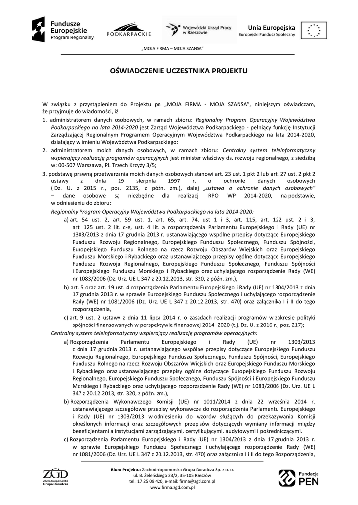 „MOJA FIRMA – MOJA SZANSA” OŚWIADCZENIE UCZESTNIKA PROJEKTU W związku z przystąpieniem do Projektu pn „MOJA FIRMA - MOJA SZANSA”, niniejszym oświadczam, że przyjmuje do wiadomości, iż: 1. administratorem danych osobowych, w ramach zbioru: Regionalny Program Operacyjny Województwa Podkarpackiego na lata 2014-2020 jest Zarząd Województwa Podkarpackiego - pełniący funkcję Instytucji Zarządzającej Regionalnym Programem Operacyjnym Województwa Podkarpackiego na lata 2014-2020, działający w imieniu Województwa Podkarpackiego; 2. administratorem moich danych osobowych, w ramach zbioru: Centralny system teleinformatyczny wspierający realizację programów operacyjnych jest minister właściwy ds. rozwoju regionalnego, z siedzibą w: 00-507 Warszawa, Pl. Trzech Krzyży 3/5; 3. podstawę prawną przetwarzania moich danych osobowych stanowi art. 23 ust. 1 pkt 2 lub art. 27 ust. 2 pkt 2 ustawy z dnia 29 sierpnia 1997 r. o ochronie danych osobowych ( Dz. U. z 2015 r., poz. 2135, z późn. zm.), dalej „ustawa o ochronie danych osobowych” – dane osobowe są niezbędne dla realizacji RPO WP 2014-2020, na podstawie, w odniesieniu do zbioru: Regionalny Program Operacyjny Województwa Podkarpackiego na lata 2014-2020: a) art. 54 ust. 2, art. 59 ust. 1, art. 65, art. 74. ust 1 i 3, art. 115, art. 122 ust. 2 i 3, art. 125 ust. 2 lit. c-e, ust. 4 lit. a rozporządzenia Parlamentu Europejskiego i Rady (UE) nr 1303/2013 z dnia 17 grudnia 2013 r. ustanawiającego wspólne przepisy dotyczące Europejskiego Funduszu Rozwoju Regionalnego, Europejskiego Funduszu Społecznego, Funduszu Spójności, Europejskiego Funduszu Rolnego na rzecz Rozwoju Obszarów Wiejskich oraz Europejskiego Funduszu Morskiego i Rybackiego oraz ustanawiającego przepisy ogólne dotyczące Europejskiego Funduszu Rozwoju Regionalnego, Europejskiego Funduszu Społecznego, Funduszu Spójności i Europejskiego Funduszu Morskiego i Rybackiego oraz uchylającego rozporządzenie Rady (WE) nr 1083/2006 (Dz. Urz. UE L 347 z 20.12.2013, str. 320, z późn. zm.), b) art. 5 oraz art. 19 ust. 4 rozporządzenia Parlamentu Europejskiego i Rady (UE) nr 1304/2013 z dnia 17 grudnia 2013 r. w sprawie Europejskiego Funduszu Społecznego i uchylającego rozporządzenie Rady (WE) nr 1081/2006 (Dz. Urz. UE L 347 z 20.12.2013, str. 470) oraz załącznika I i II do tego rozporządzenia, c) art. 9 ust. 2 ustawy z dnia 11 lipca 2014 r. o zasadach realizacji programów w zakresie polityki spójności finansowanych w perspektywie finansowej 2014–2020 (t.j. Dz. U. z 2016 r., poz. 217); Centralny system teleinformatyczny wspierający realizację programów operacyjnych: a) Rozporządzenia Parlamentu Europejskiego i Rady (UE) nr 1303/2013 z dnia 17 grudnia 2013 r. ustanawiającego wspólne przepisy dotyczące Europejskiego Funduszu Rozwoju Regionalnego, Europejskiego Funduszu Społecznego, Funduszu Spójności, Europejskiego Funduszu Rolnego na rzecz Rozwoju Obszarów Wiejskich oraz Europejskiego Funduszu Morskiego i Rybackiego oraz ustanawiającego przepisy ogólne dotyczące Europejskiego Funduszu Rozwoju Regionalnego, Europejskiego Funduszu Społecznego, Funduszu Spójności i Europejskiego Funduszu Morskiego i Rybackiego oraz uchylającego rozporządzenie Rady (WE) nr 1083/2006 (Dz. Urz. UE L 347 z 20.12.2013, str. 320, z późn. zm.), b) Rozporządzenia Wykonawczego Komisji (UE) nr 1011/2014 z dnia 22 września 2014 r. ustanawiającego szczegółowe przepisy wykonawcze do rozporządzenia Parlamentu Europejskiego i Rady (UE) nr 1303/2013 w odniesieniu do wzorów służących do przekazywania Komisji określonych informacji oraz szczegółowych przepisów dotyczących wymiany informacji między beneficjentami a instytucjami zarządzającymi, certyfikującymi, audytowymi i pośredniczącymi, c) Rozporządzenia Parlamentu Europejskiego i Rady (UE) nr 1304/2013 z dnia 17 grudnia 2013 r. w sprawie Europejskiego Funduszu Społecznego i uchylającego rozporządzenie Rady (WE) nr 1081/2006 (Dz. Urz. UE L 347 z 20.12.2013, str. 470) oraz załącznika I i II do tego Rozporządzenia, Biuro Projektu: Zachodniopomorska Grupa Doradcza Sp. z o. o. ul. B. Żeleńskiego 23/2, 35-105 Rzeszów tel. 17 25 09 420, e-mail: [email protected] www.firma.zgd.com.pl „MOJA FIRMA – MOJA SZANSA” d) Ustawy z dnia 11 lipca 2014 r. o zasadach realizacji programów w zakresie polityki spójności finansowanych w perspektywie finansowej 2014–2020 (t.j. Dz. U. z 2016 r., poz. 217); 4. moje dane osobowe będą przetwarzane wyłącznie w celu realizacji Projektu pn. „MOJA FIRMA - MOJA SZANSA”, w szczególności, w odniesieniu do zbioru: Regionalny Program Operacyjny Województwa Podkarpackiego na lata 2014-2020, w zakresie: a) aplikowania o środki unijne i realizacji projektów, w szczególności potwierdzania kwalifikowalności wydatków, udzielania wsparcia uczestnikom projektów, ewaluacji, monitoringu, kontroli, audytu, sprawozdawczości oraz działań informacyjno-promocyjnych w ramach RPO WP 2014-2020, b) zapewnienia realizacji obowiązku informacyjnego dotyczącego przekazywania do publicznej wiadomości informacji o podmiotach uzyskujących wsparcie z RPO WP 2014-2020; Centralny system teleinformatyczny wspierający realizację programów operacyjnych, w zakresie: a) zarządzania, kontroli, audytu, ewaluacji, sprawozdawczości i raportowania w ramach RPO WP 2014-2020, b) zapewnienia realizacji obowiązku informacyjnego dotyczącego przekazywania do publicznej wiadomości informacji o podmiotach uzyskujących wsparcie z funduszy polityki spójności w ramach RPO WP 2014-2020; 5. moje dane osobowe zostały powierzone do przetwarzania Instytucji Pośredniczącej – Wojewódzkiemu Urzędowi Pracy w Rzeszowie, z siedziba: 35-025 Rzeszów, ul. płk. Leopolda Lisa-Kuli 20, Beneficjentowi realizującemu Projekt Zachodniopomorskiej Grupie Doradczej Sp. z o. o., al. Powstańców Wielkopolskich 33, 70-111 Szczecin, podmiotom świadczącym usługi na rzecz Ben