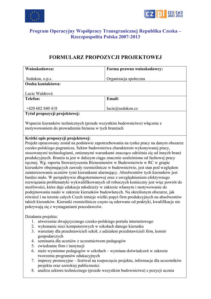 Program Operacyjny Współpracy Transgranicznej Republika Czeska – Rzeczpospolita Polska 2007-2013 FORMULARZ PROPOZYCJI PROJEKTOWEJ Wnioskodawca: Forma prawna wnioskodawcy: Sedukon, o.p.s. Osoba kontaktowa: Organizacja społeczna Lucie Waldrová Telefon: +420 602 840 418 Tytuł propozycji projektowej: Email: [email protected] Wsparcie kierunków technicznych (przede wszystkim budownictwo) włącznie z motywowaniem do prowadzenia biznesu w tych branżach Krótki opis propozycji projektowej: Projekt opracowany został na podstawie zapotrzebowania na rynku pracy na danym obszarze czesko-polskiego pogranicza. Sektor budownictwa charakterem wykonywanej pracy, stosowanymi technologiami, zmiennymi warunkami znacząco odróżnia się od innych branż produkcyjnych. Branża ta jest w dalszym ciągu znacznie uzależniona od fachowej pracy ręcznej. Wg. raportu Stowarzyszenia Biznesmenów w Budownictwie w RC w grupie kierunków obejmujących zawody rzemieślnicze w budownictwie, jest stan pod względem zainteresowania uczniów tymi kierunkami alarmujący. Absolwentów tych kierunków jest bardzo mało. W perspektywie długoterminowej oraz z uwzględnieniem efektywnego rozwiązania problematyki wykwalifikowanych sił roboczych konieczny jest więc powrót do możliwości, które daje edukacja młodzieży w zakresie własnym i motywowanie do podejmowania nauki w zakresie kierunków budowlanych. Na określonym obszarze, jak również i na terenie całych Czech istnieje wielki popyt firm produkcyjnych na absolwentów takich kierunków. Kierunki rzemieślnicze często są oderwane od praktyki, kwalifikacje nie pokrywają się z wymaganiami pracodawców. Działania projektu: 1. utworzenie dwujęzycznego czesko-polskiego portalu internetowego 2. wykonanie sieci komputerowych w szkołach danego kierunku 3. warsztaty dla przedstawicieli szkół, z udziałem przedstawicieli firm, komór gospodarczych 4. seminaria dla uczniów z uczestnictwem pedagogów 5. zwiedzanie firm i instytucji 6. staże wymienne pedagogów w szkołach – wymiana doświadczeń w zakresie tworzenia programów edukacyjnych 7. imprezy promocyjne – festiwal na rozpoczęcie projektu, informacje dla uczestników projektu oraz szerokiej publiczności 8. analiza sektoru technicznego (przede wszystkim budownictwa) z pozycji ucznia Miejsce realizacji projektu: Województwo : Moravskoslezský, Opolski, Rybnicko-jastrzębski, Bielsko-Bialski Partner: Spółka Sedukon poszukuje partnera do wspólnej realizacji projektu. Planowany zakres współpracy z zagranicznym partnerem: Planowany zakres współpracy będzie w zupełności zgodny z 4 zasadami: - wspólne przygotowanie projektu - wspólna realizacja projektu - wspólny personel - wspólne finansowanie Partner projektu będzie aktywnie uczestniczył we wszystkich istotnych działaniach projektu. Cele i efekty projektu: Celem projektu jest zwiększenie atrakcyjności technicznych, przede wszystkim budowlanych kierunków kształcenia na pograniczu czesko-polskim oraz motywowania uczniów SzP do podejmowania nauki na tych kierunkach. Równocześnie także połącznie teorii i praktyki nauczanej w średnich szkołach zawodowych za pośrednictwem współpracy zakładów produkcyjnych ze szkołami średnimi. Dlatego naszym celem jest skupienie się na wzajemnym połączeniu systemu SzŚ-firma, kiedy podczas spotkań na poszczególnych warsztatach dla uczniów dojdzie do połączenia teorii i praktyki. Efektem projektu będzie czesko-polski portal internetowy zawierający kompleksową informację na temat poszczególnych kierunków technicznych (informacje dla uczniów SzP, SZ, informacje o możliwościach biznesowych, o danym segmencie rynku pracy, możliwościach zatrudnienia się, informacje o kursach edukacyjnych itp. – w celu zacieśnienia czesko-polskiej współpracy). Wstępny szacunek kosztów: 200 000 EUR Stan przygotowania projektu: Faza przygotowawcza