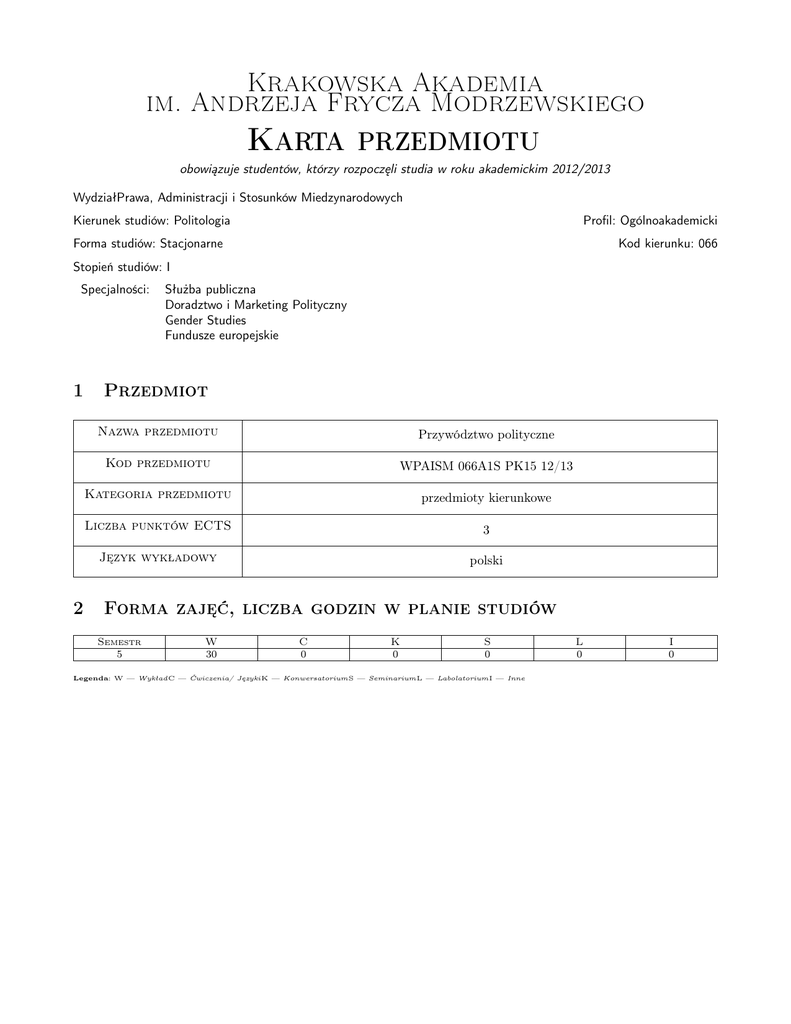 Karta przedmiotu - Krakowska Akademia im Andrzeja Frycza
