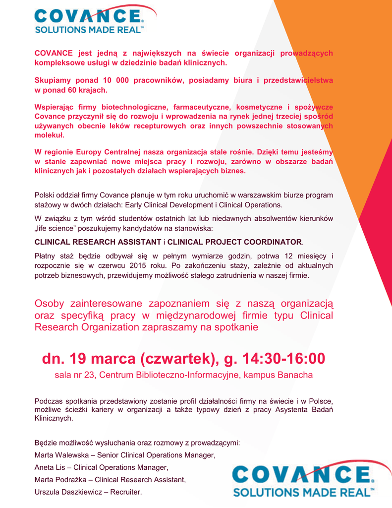 COVANCE jest jedną z najwi największych na świecie wiecie organizacji prowadzących prowadz kompleksowe usługi w dziedzinie bada badań klinicznych. Skupiamy ponad 10 000 pracowników, posiadamy biura i przedstawicielstwa w ponad 60 krajach. Wspierając firmy biotechnologiczne, logiczne, farmaceutyczne, kosmetyczne i spoŜywcze spo Covance przyczynił się do rozwoju i wprowadzenia na rynek jednej trzeciej spośród spo uŜywanych ywanych obecnie leków recepturowych oraz innych powszechnie stosowanych molekuł. organizacja stale rośnie. Dzięki ki temu jesteśmy jeste W regionie Europy Centralnej nasza organi w stanie zapewniać nowe miejsca pracy i rozwoju, zarówno w obszarze badań bada klinicznych jak i pozostałych działach wspieraj wspierających biznes. Polski oddział firmy Covance planuje w tym roku uruchomi uruchomić w warszawskim biurze program staŜowy owy w dwóch działach: Early Clinical Development i Clinical Operations. W związku z tym wśród ród studentów ostatnich lat lub niedawnych absolwentów kierunków „life science” poszukujemy kandydatów na stanowiska: CLINICAL RESEARCH RCH ASSISTANT i CLINICAL PROJECT COORDINATOR. Płatny staŜ będzie dzie odbywał się w pełnym wymiarze godzin, potrwa 12 miesięcy miesi i rozpocznie się w czerwcu 2015 roku. Po zako zakończeniu staŜy, zaleŜnie nie od aktualnych potrzeb biznesowych, przewidujemy mo moŜliwość stałego zatrudnienia w naszej firmie. Osoby zainteresowane zapoznaniem si się z naszą organizacją organizacj oraz specyfiką pracy w mi międzynarodowej dzynarodowej firmie typu Clinical Research Organization zapraszamy na spotkanie dn. 19 marca (czwartek), g. 14:30 14:30-16:00 16:00 sala nr 23, Centrum Biblioteczno Biblioteczno-Informacyjne, kampus Banacha Podczas spotkania przedstawiony zostanie profil działalno działalności firmy na świecie wiecie i w Polsce, moŜliwe ścieŜki ki kariery w organizacji a tak takŜe typowy dzień z pracy Asystenta Badań Bada Klinicznych. Będzie moŜliwość wysłuchania ia oraz rozmowy z prowadz prowadzącymi: Marta Walewska – Senior Clinical Operations Manager, Aneta Lis – Clinical Operations Manager, Marta PodraŜka – Clinical Research Assistant, Urszula Daszkiewicz – Recruiter.
