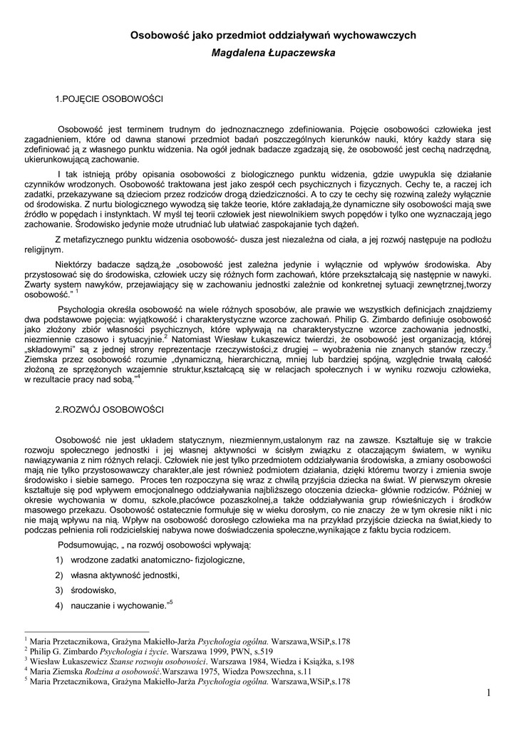 Osobowość jako przedmiot oddziaływań wychowawczych Magdalena Łupaczewska 1.POJĘCIE OSOBOWOŚCI Osobowość jest terminem trudnym do jednoznacznego zdefiniowania. Pojęcie osobowości człowieka jest zagadnieniem, które od dawna stanowi przedmiot badań poszczególnych kierunków nauki, który każdy stara się zdefiniować ją z własnego punktu widzenia. Na ogół jednak badacze zgadzają się, że osobowość jest cechą nadrzędną, ukierunkowującą zachowanie. I tak istnieją próby opisania osobowości z biologicznego punktu widzenia, gdzie uwypukla się działanie czynników wrodzonych. Osobowość traktowana jest jako zespół cech psychicznych i fizycznych. Cechy te, a raczej ich zadatki, przekazywane są dzieciom przez rodziców drogą dziedziczności. A to czy te cechy się rozwiną zależy wyłącznie od środowiska. Z nurtu biologicznego wywodzą się także teorie, które zakładają,że dynamiczne siły osobowości mają swe źródło w popędach i instynktach. W myśl tej teorii człowiek jest niewolnikiem swych popędów i tylko one wyznaczają jego zachowanie. Środowisko jedynie może utrudniać lub ułatwiać zaspokajanie tych dążeń. Z metafizycznego punktu widzenia osobowość- dusza jest niezależna od ciała, a jej rozwój następuje na podłożu religijnym. Niektórzy badacze sądzą,że „osobowość jest zależna jedynie i wyłącznie od wpływów środowiska. Aby przystosować się do środowiska, człowiek uczy się różnych form zachowań, które przekształcają się następnie w nawyki. Zwarty system nawyków, przejawiający się w zachowaniu jednostki zależnie od konkretnej sytuacji zewnętrznej,tworzy osobowość.” 1 Psychologia określa osobowość na wiele różnych sposobów, ale prawie we wszystkich definicjach znajdziemy dwa podstawowe pojęcia: wyjątkowość i charakterystyczne wzorce zachowań. Philip G. Zimbardo definiuje osobowość jako złożony zbiór własności psychicznych, które wpływają na charakterystyczne wzorce zachowania jednostki, niezmiennie czasowo i sytuacyjnie.2 Natomiast Wiesław Łukaszewicz twierdzi, że osobowość jest organizacją, której „składowymi” są z jednej strony reprezentacje rzeczywistości,z drugiej – wyobrażenia nie znanych stanów rzeczy.3 Ziemska przez osobowość rozumie „dynamiczną, hierarchiczną, mniej lub bardziej spójną, względnie trwałą całość złożoną ze sprzężonych wzajemnie struktur,kształcącą się w relacjach społecznych i w wyniku rozwoju człowieka, w rezultacie pracy nad sobą.”4 2.ROZWÓJ OSOBOWOŚCI Osobowość nie jest układem statycznym, niezmiennym,ustalonym raz na zawsze. Kształtuje się w trakcie rozwoju społecznego jednostki i jej własnej aktywności w ścisłym związku z otaczającym światem, w wyniku nawiązywania z nim różnych relacji. Człowiek nie jest tylko przedmiotem oddziaływania środowiska, a zmiany osobowości mają nie tylko przystosowawczy charakter,ale jest również podmiotem działania, dzięki któremu tworzy i zmienia swoje środowisko i siebie samego. Proces ten rozpoczyna się wraz z chwilą przyjścia dziecka na świat. W pierwszym okresie kształtuje się pod wpływem emocjonalnego oddziaływania najbliższego otoczenia dziecka- głównie rodziców. Później w okresie wychowania w domu, szkole,placówce pozaszkolnej,a także oddziaływania grup rówieśniczych i środków masowego przekazu. Osobowość ostatecznie formułuje się w wieku dorosłym, co nie znaczy że w tym okresie nikt i nic nie mają wpływu na nią. Wpływ na osobowość dorosłego człowieka ma na przykład przyjście dziecka na świat,kiedy to podczas pełnienia roli rodzicielskiej nabywa nowe doświadczenia społeczne,wynikające z faktu bycia rodzicem. Podsumowując, „ na rozwój osobowości wpływają: 1) wrodzone zadatki anatomiczno- fizjologiczne, 2) własna aktywność jednostki, 3) środowisko, 4) nauczanie i wychowanie.”5 1 Maria Przetacznikowa, Grażyna Makiełło-Jarża Psychologia ogólna. Warszawa,WSiP,s.178 Philip G. Zimbardo Psychologia i życie. Warszawa 1999, PWN, s.519 3 Wiesław Łukaszewicz Szanse rozwoju osobowości. Warszawa 1984, Wiedza i Książka, s.198 4 Maria Ziemska Rodzina a osobowość.Warszawa 1975, Wiedza Powszechna, s.11 5 Maria Przetacznikowa, Grażyna Makiełło-Jarża Psychologia ogólna. Warszawa,WSiP,s.178 2 1 3.ZEWNĘTRZNE CZYNNIKI ROZWOJU OSOBOWOŚCI Na rozwój osobowości w dużej mierze ma wpływ środowisko,w którym żyje dziecko. Każdy człowiek od momentu narodzin żyje w określonej formacji historycznej i określonej kulturze. Zawsze wchodzi w skład jakiejś grupy społecznej,jest elementem rodziny. Każda grupa społeczna posiada swoje tradycje, reguły postępowania obowiązujące jej członków. Reguły te powstawały na przestrzeni wieków. Kształtowały się wraz z rozwojem ludzkości. Człowiek przyswaja sobie te reguły w oparciu o różne doświadczenia społeczne. Każdy z nas pełni w społeczeństwie określone role społeczne. Z podjęciem danej roli wiąże się system wartości, reguł postępowania przypisanych danej roli społecznej. Innego zachowania oczekuje się od kobiety,innego od mężczyzny, od ucznia, nauczyciela, starca czy dziecka. Określona kultura, w której żyje człowiek wymaga określonego sposobu pełnienia tych ról społecznych. Inne wymagania w stosunku do kobiety ma kultura europejska inne kultura muzułmańska. Niektóre role społeczne narzucane są nam w chwili przyjścia na świat. Związane są one płcią,wiekiem. Pełnimy również role, które sobie sami wybierzemy. Jest to zawód, członkostwo w jakiejś organizacji czy też przyjaciel. Jednak człowiek nie zawsze przyjmuje rolę społeczną,którą narzuca mu społeczeństwo. Odrzucanie roli wiąże się często z brakiem właściwych wzorów postępowania. Na przykład dziecko wychowane w domu dziecka lub w rodzinie patologicznej odrzuca rolę ojca czy matki jaką wyznacza mu społeczeń