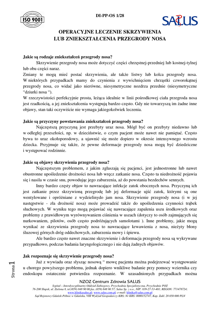 DI-PP-OS 1/28 OPERACYJNE LECZENIE SKRZYWIENIA LUB ZNIEKSZTAŁCENIA PRZEGRODY NOSA Jakie są rodzaje zniekształceń przegrody nosa? Skrzywienie przegrody nosa może dotyczyć części chrzęstnej-przedniej lub kostnej-tylnej lub obu części naraz. Zmiany te mogą mieć postać skrzywienia, ale także listwy lub kolca przegrody nosa. W niektórych przypadkach mamy do czynienia z wywichnięciem chrząstki czworokątnej przegrody nosa, co widać jako nierówne, niesymetryczne nozdrza przednie (niesymetryczne “dziurki nosa “). W rzeczywistości perfekcyjnie prosta, leżąca idealnie w linii pośrodkowej ciała przegroda nosa jest rzadkością, a jej zniekształcenia występują bardzo często. Gdy nie towarzyszą im żadne inne objawy, stan taki oczywiście nie wymaga jakiegokolwiek leczenia. Jakie są przyczyny powstawania zniekształceń przegrody nosa? Najczęstszą przyczyną jest przebyty uraz nosa. Mógł być on przebyty niedawno lub w odległej przeszłości, np. w dzieciństwie, o czym pacjent może nawet nie pamiętać. Często bywa to uraz okołoporodowy, a ujawnić się może dopiero w okresie intensywnego wzrostu dziecka. Przyjmuje się także, że pewne deformacje przegrody nosa mogą być dziedziczne i występować rodzinnie. Strona 1 Jakie są objawy skrzywienia przegrody nosa? Najczęstszym problemem, z jakim zgłaszają się pacjenci, jest jednostronne lub nawet obustronne upośledzenie drożności nosa lub wręcz zatkanie nosa. Często ta niedrożność pojawia się i nasila w czasie snu, powodując jego zaburzenia, aż do powstania bezdechów sennych. Inny bardzo częsty objaw to nawracające infekcje zatok obocznych nosa. Przyczyną ich jest zatkanie przez skrzywioną przegrodę lub jej deformacje ujść zatok, którymi są one wentylowane i opróżniane z wydzielinydo jam nosa. Skrzywienie przegrody nosa (i w jej następstwie - zła drożność nosa) może prowadzić także do upośledzenia czynności trąbek słuchowych. W wyniku tego mogą pojawiać się nawracające zapalenia uszu środkowych oraz problemy z prawidłowym wyrównywaniem ciśnienia w uszach (dotyczy to osób zajmujących się nurkowaniem, pilotów, osób często podróżujących samolotami ). Inne problemy, jakie mogą wynikać ze skrzywienia przegrody nosa to nawracające krwawienia z nosa, nieżyty błony śluzowej górnych dróg oddechowych, zaburzenia mowy i śpiewu. Ale bardzo często nawet znaczne skrzywienie i deformacja przegrody nosa są wykrywane przypadkowo, podczas badania laryngologicznego i nie dają żadnych objawów. Jak rozpoznaje się skrzywienie przegrody nosa? Już z wywiadu oraz słysząc nosową “ mowę pacjenta można podejrzewać występowanie u chorego powyższego problemu, jednak dopiero wnikliwe badanie przy pomocy wziernika czy endoskopu ostatecznie potwierdza rozpoznanie. W uzasadnionych przypadkach można NZOZ Centrum Zdrowia SALUS Szpital – Interdyscyplinarny Oddział Zabiegowy, Przychodnia Specjalistyczna, Przychodnie POZ 76-200 Słupsk, ul. Zielona 8, tel./059) 848 90 00,fax. (059) 848 90 57; Salus Sp. z o.o., NIP: 839-27-53-401; REGON: 771478724; www.klinikasalus.pl; www.salus.com.pl; e-mail: [email protected] Sąd Rejonowy Gdańsk-Północ w Gdańsku, VIII Wydział Gospodarczy KRS; Nr KRS: 0000152747, Kap. Zakł. 28 050 000 PLN DI-PP-OS 1/28 deformację przegrody nosa dobrze uwidocznić, wykonując RTG zatok lub jeszcze lepiej tomografię komputerową nosa i zatok. Jak się leczy deformację przegrody nosa? Oczywiście przypadki bezobjawowe nie wymagają żadnego leczenia, także te, które tylko okresowo dają upośledzenie drożności nosa, np. skojarzone z alergią -należy leczyć je zachowawczo. W przypadku nasilonych, niepodatnych na leczenie zachowawcze zaburzeń drożności nosa wynikających z deformacji przegrody nosa leczeniem z wyboru jest leczenie operacyjne. Jakie są wskazania do operacji? • upośledzony lub niedrożny całkowicie nos, zarówno jedno, jak i obustronnie. • nawracające zapalenie zatok obocznych nosa , ktore moga wynikać z deformacji przegrody nosa • nawracające krwawienia z nosa • względy kosmetyczne wynikające z bardzo widocznego zwichnienia chrząstki przegrody nosa U małych dzieci i osób w wieku podeszłym wskazania do zabiegu są bardzo ściśle ograniczone i należy je rozważyć jedynie w przypadkach głęboko uzasadnionych. Strona 2 Czy są przeciwwskazania do operacji przegrody nosa? Tak. Operacji korekcyjnych przegrody nosa nie należy wykonywać w przypadkach zaawansowanych zmian zanikowych błony śluzowej nosa. Nie operuje się także chorych w czasie ostrych stanów zapalnych błony śluzowej nosa i zatok. Istnieją także przeciwwskazania wynikające z rodzaju zastosowanego znieczulenia, np.: uczulenie na leki znieczulające miejscowo, ogólny zły stan chorego czy schorzenia, które są przeciwwskazaniem do znieczulenia ogólnego chorego. Na czym polega zabieg korekcji przegrody nosa? Istota zabiegu polega na eliminacji skrzywienia przegrody nosa i ustawieniu jej w linii pośrodkowej ciała. Można tego dokonać, wykonując podśluzówkową resekcję przegrody nosa lub septoplastykę ( plastykę przegrody nosa ). Pierwszy zabieg polega na tym, że w znieczuleniu ogólnym wykonuje się na przegrodzie nacięcie w odległości ok. 1cm od przedniej krawędzi chrząstki przegrody nosa i przecinając błonę śluzową z ochrzęstną odpreparowuje się ją od chrząstki i kości przegrody nosa, unosząc ją ponad chrząstką. To samo robi się z drugiej strony przegrody, następnie usuwa się skrzywiony fragment chrząstki i kości przegrody nosa. Po zszyciu rany w przedsionku nosa zakłada się opatrunek stabilizujący przegrodę (tamponada przednia z odpowiednio przygotowanej gąbki). Usuwa się ten opatrunek po ok. 24 godzinach , a szwy zdejmuje sie ok. 7 dnia po zabiegu. Na zewnątrz nosa nie są widoczne jakiekolwiek ślady czy blizny po operacji. Drugi typ zabiegu- septoplastyka nosa-jest początkowo 