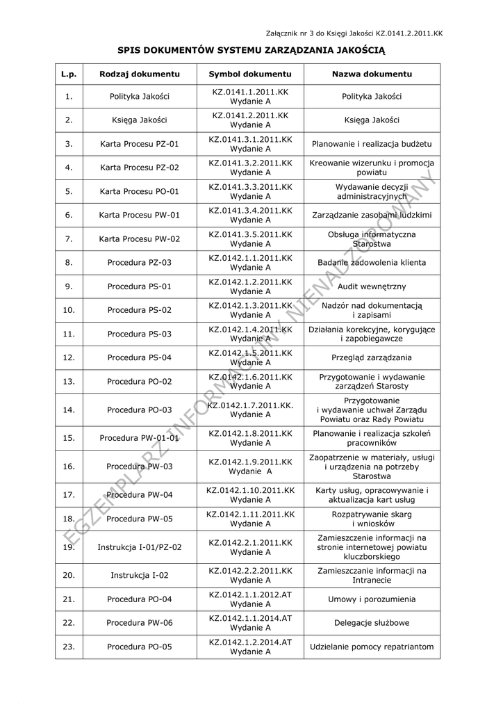 Załącznik nr 3 do Księgi Jakości KZ.0141.2.2011.KK SPIS DOKUMENTÓW SYSTEMU ZARZĄDZANIA JAKOŚCIĄ L.p. Rodzaj dokumentu Symbol dokumentu Nazwa dokumentu 1. Polityka Jakości KZ.0141.1.2011.KK Wydanie A Polityka Jakości 2. Księga Jakości KZ.0141.2.2011.KK Wydanie A Księga Jakości 3. Karta Procesu PZ-01 KZ.0141.3.1.2011.KK Wydanie A Planowanie i realizacja budżetu 4. Karta Procesu PZ-02 KZ.0141.3.2.2011.KK Wydanie A Kreowanie wizerunku i promocja powiatu 5. Karta Procesu PO-01 KZ.0141.3.3.2011.KK Wydanie A Wydawanie decyzji administracyjnych 6. Karta Procesu PW-01 KZ.0141.3.4.2011.KK Wydanie A Zarządzanie zasobami ludzkimi 7. Karta Procesu PW-02 KZ.0141.3.5.2011.KK Wydanie A Obsługa informatyczna Starostwa 8. Procedura PZ-03 KZ.0142.1.1.2011.KK Wydanie A Badanie zadowolenia klienta 9. Procedura PS-01 KZ.0142.1.2.2011.KK Wydanie A Audit wewnętrzny 10. Procedura PS-02 KZ.0142.1.3.2011.KK Wydanie A Nadzór nad dokumentacją i zapisami 11. Procedura PS-03 KZ.0142.1.4.2011.KK Wydanie A Działania korekcyjne, korygujące i zapobiegawcze 12. Procedura PS-04 KZ.0142.1.5.2011.KK Wydanie A Przegląd zarządzania 13. Procedura PO-02 KZ.0142.1.6.2011.KK Wydanie A Przygotowanie i wydawanie zarządzeń Starosty 14. Procedura PO-03 KZ.0142.1.7.2011.KK. Wydanie A Przygotowanie i wydawanie uchwał Zarządu Powiatu oraz Rady Powiatu 15. Procedura PW-01-01 KZ.0142.1.8.2011.KK Wydanie A Planowanie i realizacja szkoleń pracowników 16. Procedura PW-03 KZ.0142.1.9.2011.KK Wydanie A Zaopatrzenie w materiały, usługi i urządzenia na potrzeby Starostwa 17. Procedura PW-04 KZ.0142.1.10.2011.KK Wydanie A Karty usług, opracowywanie i aktualizacja kart usług 18. Procedura PW-05 KZ.0142.1.11.2011.KK Wydanie A Rozpatrywanie skarg i wniosków 19. Instrukcja I-01/PZ-02 KZ.0142.2.1.2011.KK Wydanie A Zamieszczenie informacji na stronie internetowej powiatu kluczborskiego 20. Instrukcja I-02 KZ.0142.2.2.2011.KK Wydanie A Zamieszczanie informacji na Intranecie 21. Procedura PO-04 KZ.0142.1.1.2012.AT Wydanie A Umowy i porozumienia 22. Procedura PW-06 KZ.0142.1.1.2014.AT Wydanie A Delegacje służbowe 23. Procedura PO-05 KZ.0142.1.2.2014.AT Wydanie A Udzielanie pomocy repatriantom