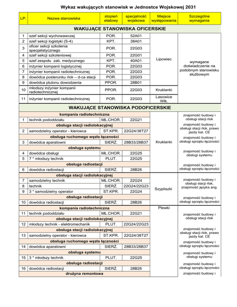 Wykaz wakujących stanowisk w Jednostce Wojskowej 2031 LP. Nazwa stanowiska stopień etatowy specjalność wojskowa Miejsce występowania Szczególne wymagania WAKUJĄCE STANOWISKA OFICERSKIE 1 2 szef sekcji wychowawczej szef sekcji logistyki (S-4) oficer sekcji szkolenia 3 specjalistycznego 4 szef sekcji szkoleniowej 5 szef zespołu zab. medycznego 6 inżynier kompanii logistycznej 7 inżynier kompanii radiotechnicznej 8 dowódca posterunku rlok – d-ca stacji 9 dowódca plutonu dowodzenia młodszy inżynier kompanii 10 radiotechnicznej 11 inżynier kompanii radiotechnicznej POR. KPT. 52A01 38A01 POR. 22G03 POR. KPT. POR. POR. POR. PPOR. 22G01 40A01 22G03 22G03 22G03 28B01 PPOR. 22G03 Kruklanki POR. 22G03 Lasowice Wlk. Lipowiec wymagane doświadczenie na podobnym stanowisku służbowym WAKUJĄCE STANOWISKA PODOFICERSKIE 1 2 3 4 5 6 kompania radiotechniczna technik pododdziału MŁ.CHOR. obsługa stacji radiolokacyjnej samodzielny operator - kierowca ST.KPR. 22G21 znajomość budowy i obsługi stacji rlok 22G24/38T27 znajomość budowy i obsługi stacji rlok, prawo jazdy kat. CE obsługa ruchomego węzła łączności dowódca aparatowni SIERŻ. 28B33/28B37 obsługa systemu dowódca obsługi MŁ.CHOR. 22G25 7 * młodszy technik PLUT. 22G25 obsługa radiostacji dowódca radiostacji SIERŻ. 28B26 obsługa stacji radiolokacyjnej samodzielny technik MŁ.CHOR. 22G24 technik SIERŻ. 22G24/22G23 3 * samodzielny operator ST.KPR. 22G24 obsługa radiostacji 10 dowódca radiostacji SIERŻ. 28B26 7 8 9 kompania radiotechniczna 11 technik pododdziału MŁ.CHOR. 22G21 obsługa stacji radiolokacyjnej 12 młodszy technik - elektromechanik PLUT. 22G24/22G23 obsługa stacji radiolokacyjnej 13 samodzielny operator - kierowca ST.KPR. obsługa ruchomego węzła łączności 14 dowódca aparatowni SIERŻ. obsługa systemu 15 3 * młodszy technik PLUT. obsługa radiostacji 16 dowódca radiostacji SIERŻ. drużyna remontowa Kruklanki znajomość budowy i obsługi sprzętu łączności znajomość budowy i obsługi systemu znajomość budowy i obsługi sprzętu łączności Szypliszki znajomość budowy i obsługi stacji rlok, znajomość języka ang. znajomość budowy i obsługi sprzętu łączności Plewki znajomość budowy i obsługi stacji rlok 22G24/38T27 znajomość budowy i obsługi stacji rlok, prawo jazdy kat. CE 28B33/28B37 znajomość budowy i obsługi sprzętu łączności 22G25 znajomość budowy i obsługi systemu 28B26 znajomość budowy i obsługi sprzętu łączności znajomość budowy i LP. Nazwa stanowiska 17 dowódca drużyny - dowódca obsługi stopień etatowy specjalność wojskowa SIERŻ. 22G24 obsługa stacji radiolokacyjnej 18 2 * młodszy technik PLUT. 19 2 * samodzielny operator ST.KPR. obsługa stacji radiolokacyjnej 20 samodzielny operator - kierowca ST.KPR. obsługa stacji radiolokacyjnej 21 samodzielny operator - kierowca ST.KPR. 22 starszy operator - kierowca KPR. 22G24/22G23 22G24 ST.KPR. Roskosz znajomość budowy i obsługi stacji rlok, znajomość języka ang Dębina znajomość budowy i obsługi stacji rlok, prawo jazdy kat. CE 22G24/38T27 22G24/38T27 22G24 Chruściel obsługa stacji radiolokacyjnej 24 młodszy technik - elektromechanik PLUT. 22G24/22G23 obsługa stacji radiolokacyjnej 25 starszy operator - kierowca KPR. 22G24/38T27 obsługa systemu 26 2 * młodszy technik Lasowice Wlk. znajomość budowy i obsługi stacji rlok, znajomość języka ang. znajomość budowy i obsługi stacji radiolokacyjnej znajomość budowy i obsługi stacji rlok, prawo jazdy kat. CE PLUT. 22G25 znajomość budowy i obsługi systemu SIERŻ. 28B26 znajomość budowy i obsługi sprzętu łączności obsługa radiostacji 27 dowódca radiostacji Szczególne wymagania obsługi stacji rlok 22G24/38T27 obsługa stacji radiolokacyjnej 23 3 * samodzielny operator Miejsce występowania UWALNIANE STANOWISKA SZEREGOWYCH obsługa stacji radiolokacyjnej 1 operator kierowca SZER. 22G61/38T65 Kruklanki obsługa stacji radiolokacyjnej 2 operator kierowca SZER. 22G61/38T65 3 elektromechanik SZER 22G61 Lasowice Wlk. znajomość budowy i obsługi stacji rlok, prawo jazdy kat. CE znajomość budowy i obsługi stacji rlok, prawo jazdy kat. CE znajomość budowy i obsługi stacji rlok i zesp. prądotwórczych Wykaz wakujących stanowisk aktualny na dzień 23.12.2013r. Wszelkie informacje w tym zakresie można uzyskać pod nr telefonów: tel. 89 67 43 171 , tel. 89 67 43 250