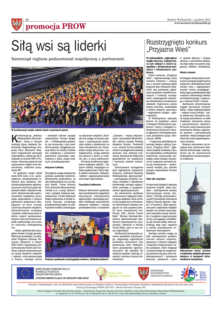 14 Monitor Wielkopolski | grudzień 2014 www.monitorwielkopolski.pl promocja PROW Samorząd regionu podsumował współpracę z partnerami. W wielkopolskim, regionalnym etapie konkursu, wnioski można było składać w dwóch kategoriach – infrastruktura techniczna i infrastruktura społeczna. Celem konkursu „Przyjazna Wieś”, organizowanego przez ministra rolnictwa i rozwoju wsi, w ramach realizacji zadań Krajowej Sieci Obszarów Wiejskich, jest pokazanie najlepszych projektów współfinansowanych z funduszy europejskich, wspierających rozbudowę infrastruktury na obszarach wiejskich. Tegoroczna, szósta edycja konkursu, przebiegała w dwóch etapach: pierwszym – regionalnym i drugim – ogólnopolskim. W Wielkopolsce wpłynęło łącznie 12 projektów: osiem w kategorii infrastruktura społeczna i cztery w kategorii infrastruktura techniczna. Wyniki ogłoszono 19 listopada podczas posiedzenia grupy roboczej ds. KSOW. – Z ogromną satysfakcją obserwuję kolejne odsłony konkursu „Przyjazna Wieś”. Zgłaszane projekty świadczą o tym, że województwo wielkopolskie znakomicie wykorzystuje pieniądze unijne służące rozwojowi wsi i poprawie warunków życia jej mieszkańców – podsumował werdykt jury członek zarządu województwa Tomasz Bugajski. W konferencji wzięło udział około sześciuset gości. K onferencja pn. „Kobieca Wielkopolska Obywatelska”, którą w ramach realizacji planu działania Sekretariatu Regionalnego Krajowej Sieci Obszarów Wiejskich zorganizował samorząd województwa, odbyła się 26 listopada na terenie MTP w Poznaniu. Honorowy patronat nad wydarzeniem objęła Anna Komorowska, małżonka prezydenta RP. W spotkaniu wzięło udział około 600 osób, m.in. samorządowcy, przedstawiciele lokalnych grup działania, właściciele gospodarstw agroturystycznych oraz liczna grupa aktywnych kobiet z obszarów wiejskich. Wydarzenie było podsumowaniem współpracy samorządu województwa z różnymi partnerami społecznymi działającymi na rzecz rozwoju i promocji obszarów wiejskich. Zaprezentowano inicjatywy i projekty realizowane przez liderów małych społeczności, których celem jest budowa kapitału społecznego oraz zmiana wizerunku wielkopolskiej wsi. – Nasze spotkanie jest szczególne również z innego powodu. Można już powiedzieć, że wdrażanie Programu Rozwoju Obszarów Wiejskich w latach 2007-2013, największej w dotychczasowej historii puli funduszy unijnych przeznaczonych na rozwój obszarów wiejskich i sektora rolno-spożywczego w Polsce, dobiega końca – stwierdził członek zarządu województwa Tomasz Bugajski. – A Wielkopolska pokazała, jak skutecznie z tych środków korzystać. Osiągnięcie pozycji lidera nie byłoby możliwe bez współpracy z państwem: partnerami samorządu województwa w wielu, często trudnych, przedsięwzięciach. Aktywne kobiety Szczególną uwagę poświęcono podczas spotkania kobietom. Wielokrotnie podkreślano, że siłą wielkopolskiej wsi są wiejskie liderki. Trener biznesu Anna Sarowska-Gierasimowicz mówiła m.in. o pasji, determinacji i potędze kobiecej indywidualności. Z kolei Katarzyna Hełpa-Liszkowska ze Szkoły Liderek Rozwoju Lokalnego przedstawiła jej wpływ na wielkopolskie kobiety mieszkające na obszarach wiejskich. Zwróciła też uwagę na korzyści płynące z wykorzystania potencjału kobiet w działalności na rzecz mieszkańców wsi. Panie, dzięki swojej aktywności i zaangażowaniu, mogą spełniać się zarówno w domu, w rodzinie, jak i w życiu publicznym. W trakcie konferencji nagrodzono najlepsze sołtyski – aktywne kobiety integrujące lokalne społeczności, które wzięły udział w konkursie „Sołtyska-Liderka”, organizowanym przez samorząd województwa. Turystyka kulinarna Ważnym elementem spotkania było przedstawienie zagadnień dotyczących wielkopolskiej agroturystyki, stanowiącej przykład mobilizacji mieszkańców obszarów wiejskich i rozwoju przedsiębiorczości. O projekcie Podczas spotkania rozstrzygnięto konkurs „Sołtyska-Liderka”. „Culinaria – impuls aktywizacyjny” opowiedział Witold Wróbel, członek zarządu Polskiej Akademii Smaku. Podkreślił m.in. wartość kuchni polskiej, mówił o propagowaniu polskiej żywności oraz edukacji kulinarnej. Zachęcał też właścicieli gospodarstw do współpracy i tworzenia szlaków kulinarnych. Zwieńczeniem wystąpienia było nagrodzenie zwycięzców konkursu „Kulinarne Rarytasy Wielkopolskiej Agroturystyki” – promującego produkty i potrawy czerpiące z dziedzictwa kulinarnego naszego regionu, które powstają w gospodarstwach agroturystycznych. Na zakończenie spotkania uhonorowano najlepsze lokalne grupy działania, które od kilku lat są głównymi animatorami różnorodnych inicjatyw mających na celu poprawę jakości życia mieszkańców wsi. Prezes LGD „Kraina Trzech Rzek” Renata Gembiak-Binkiewicz zaprezentowała działalność stowarzyszenia w prezentacji „Aktywnie w Krainie Trzech Rzek, czyli co nas cieszy najbardziej”. Konferencji towarzyszyła wystawa rękodzieła artystycznego, degustacja regionalnych produktów kulinarnych oraz prezentacja ofert wielkopolskich gospodarstw agroturystycznych. Nie zabrakło też okazji do spotkań, dyskusji, inspiracji i wymiany cennych doświadczeń. w sposób aktywny i służący zdrowiu, w atmosferze zabawy, ma duży wpływ na poziom osiąganych efektów rehabilitacji. Wieża ciśnień W kategorii infrastruktura techniczna zwyciężył projekt gminy Łobżenica „Rewitalizacja wieży ciśnień wraz z zagospodarowaniem terenu przyległego”. Istotą tego przedsięwzięcia było ocalenie unikatowego obiektu architektonicznego, związanego z historią Polski i miasta. Zachowano dotychczasowy wygląd zewnętrzny budowli, której – dzięki realizacji projektu – nadano nową funkcję – wieży widokowej. Zewnętrze ściany kopuły przeszklono, co dało możliwość stworzenia tarasu z panoramiczn