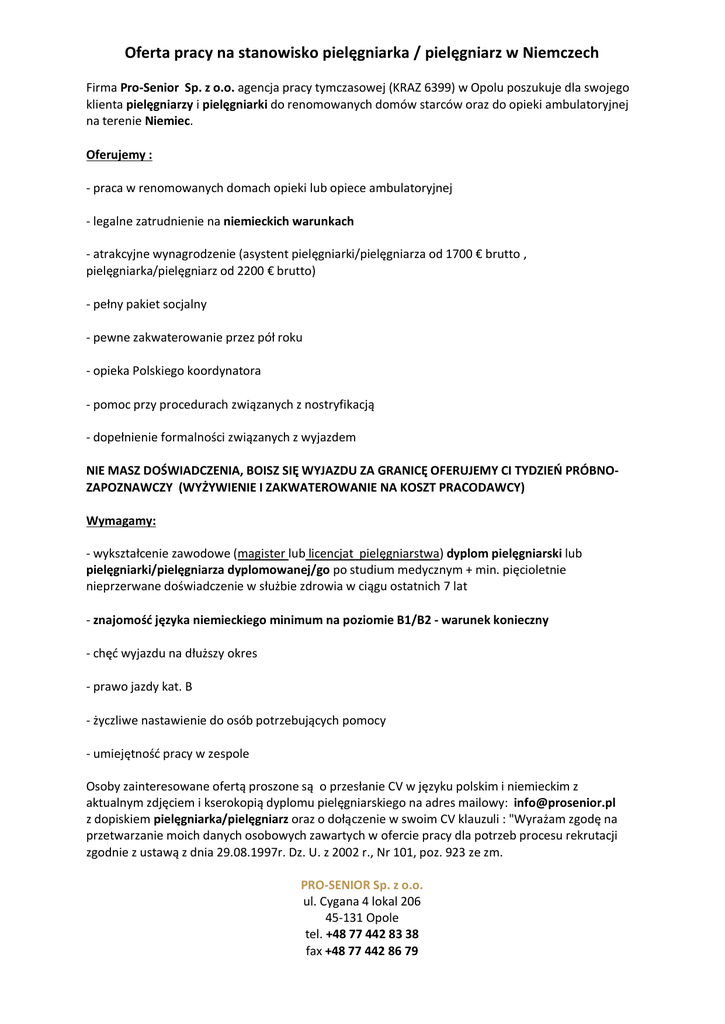 Oferta pracy na stanowisko pielęgniarka / pielęgniarz w Niemczech Firma Pro-Senior Sp. z o.o. agencja pracy tymczasowej (KRAZ 6399) w Opolu poszukuje dla swojego klienta pielęgniarzy i pielęgniarki do renomowanych domów starców oraz do opieki ambulatoryjnej na terenie Niemiec. Oferujemy : - praca w renomowanych domach opieki lub opiece ambulatoryjnej - legalne zatrudnienie na niemieckich warunkach - atrakcyjne wynagrodzenie (asystent pielęgniarki/pielęgniarza od 1700 € brutto , pielęgniarka/pielęgniarz od 2200 € brutto) - pełny pakiet socjalny - pewne zakwaterowanie przez pół roku - opieka Polskiego koordynatora - pomoc przy procedurach związanych z nostryfikacją - dopełnienie formalności związanych z wyjazdem NIE MASZ DOŚWIADCZENIA, BOISZ SIĘ WYJAZDU ZA GRANICĘ OFERUJEMY CI TYDZIEŃ PRÓBNOZAPOZNAWCZY (WYŻYWIENIE I ZAKWATEROWANIE NA KOSZT PRACODAWCY) Wymagamy: - wykształcenie zawodowe (magister lub licencjat pielęgniarstwa) dyplom pielęgniarski lub pielęgniarki/pielęgniarza dyplomowanej/go po studium medycznym + min. pięcioletnie nieprzerwane doświadczenie w służbie zdrowia w ciągu ostatnich 7 lat - znajomość języka niemieckiego minimum na poziomie B1/B2 - warunek konieczny - chęć wyjazdu na dłuższy okres - prawo jazdy kat. B - życzliwe nastawienie do osób potrzebujących pomocy - umiejętność pracy w zespole Osoby zainteresowane ofertą proszone są o przesłanie CV w języku polskim i niemieckim z aktualnym zdjęciem i kserokopią dyplomu pielęgniarskiego na adres mailowy: [email protected] z dopiskiem pielęgniarka/pielęgniarz oraz o dołączenie w swoim CV klauzuli : "Wyrażam zgodę na przetwarzanie moich danych osobowych zawartych w ofercie pracy dla potrzeb procesu rekrutacji zgodnie z ustawą z dnia 29.08.1997r. Dz. U. z 2002 r., Nr 101, poz. 923 ze zm. PRO-SENIOR Sp. z o.o. ul. Cygana 4 lokal 206 45-131 Opole tel. +48 77 442 83 38 fax +48 77 442 86 79