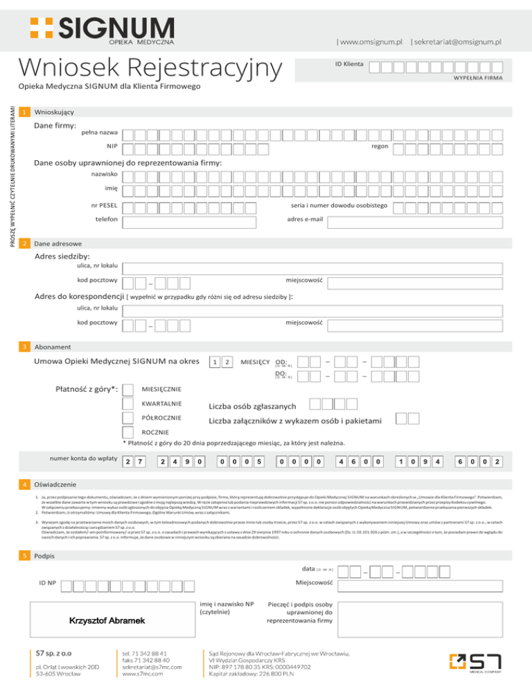 Wniosek Rejestracyjny ID Klienta WYPEŁNIA FIRMA PROSZĘ WYPEŁNIĆ CZYTELNIE DRUKOWANYMI LITERAMI Opieka Medyczna SIGNUM dla Klienta Firmowego 1 Wnioskujący Dane firmy: pełna nazwa NIP regon Dane osoby uprawnionej do reprezentowania firmy: nazwisko imię nr PESEL seria i numer dowodu osobistego adres e-mail telefon 2 Dane adresowe Adres siedziby: ulica, nr lokalu kod pocztowy miejscowość Adres do korespondencji [ wypełnić w przypadku gdy różni się od adresu siedziby ]: ulica, nr lokalu kod pocztowy 3 miejscowość Abonament Umowa Opieki Medycznej SIGNUM na okres 1 2 MIESIĘCY [OD: D-M-R] DO: [D-M-R] Płatność z góry*: MIESIĘCZNIE KWARTALNIE Liczba osób zgłaszanych PÓŁROCZNIE Liczba załączników z wykazem osób i pakietami ROCZNIE * Płatność z góry do 20 dnia poprzedzającego miesiąc, za który jest należna. numer konta do wpłaty 4 Oświadczenie 1. Ja, przez podpisanie tego dokumentu, oświadczam, że z dniem wymienionym poniżej przy podpisie, firma, którą reprezentuję dobrowolnie przystępuje do Opieki Medycznej SIGNUM na warunkach określonych w „Umowie dla Klienta Firmowego”. Potwierdzam, że wszelkie dane zawarte w tym wniosku są prawdziwe i zgodne z moją najlepszą wiedzą. W razie zatajenia lub podania nieprawdziwych informacji S7 sp. z o.o. nie ponosi odpowiedzialności na warunkach przewidzianych przez przepisy Kodeksu cywilnego. W załączeniu przekazujemy: imienny wykaz osób zgłoszonych do objęcia Opieką Medyczną SIGNUM wraz z wariantami i rozliczeniem składek, wypełnione deklaracje osób objętych Opieką Medyczna SIGNUM, potwierdzenie przekazania pierwszych składek. 2. Potwierdzam, iż otrzymaliśmy: Umowę dla Klienta Firmowego, Ogólne Warunki Umów, wraz z załącznikami. 3. Wyrażam zgodę na przetwarzanie moich danych osobowych, w tym teleadresowych podanych dobrowolnie przeze mnie lub osoby trzecie, przez S7 sp. z o.o. w celach związanych z wykonywaniem niniejszej Umowy oraz umów z partnerami S7 sp. z o.o., w celach związanych z działalnością i zarządzaniem S7 sp. z o.o. Oświadczam, że zostałem/-am poinformowany/-a przez S7 sp. z o.o. o zasadach i prawach wynikających z ustawy z dnia 29 sierpnia 1997 roku o ochronie danych osobowych (Dz. U. 02.101.926 z późn. zm.), a w szczególności o tym, że posiadam prawo do wglądu do swoich danych i ich poprawiania. S7 sp. z o.o. informuje, że dane osobowe w niniejszym wniosku są zbierane na zasadzie dobrowolności. 5 Podpis data [ D - M - R ] Miejscowość ID NP Krzysztof Abramek imię i nazwisko NP (czytelnie) Pieczęć i podpis osoby uprawnionej do reprezentowania firmy Umowa Opieka Medyczna SIGNUM dla Klienta Firmowego Zawarta pomiędzy: S7 sp. z o.o. z siedzibą we Wrocławiu, pl. Orląt Lwowskich 20D, wpisana do rejestru przedsiębiorców prowadzonego przez Sąd Rejonowy dla Wrocławia-Fabrycznej VI Wydział Gospodarczy pod nr KRS 0000449702, NIP 8971788035, kapitał zakładowy: 226.800 PLN zwanym dalej Zleceniobiorcą a stroną określoną w pkt 1, 2 Wniosku Rejestracyjnego, Zwaną dalej Zleceniodawcą Zwane dalej łącznie Stronami. Wniosek Rejestracyjny stanowi integralną cześć Umowy. §1 Przedmiotem niniejszej Umowy jest określenie wzajemnych praw i obowiązków Stron a także regulacja realizacji świadczeń zdrowotnych. §2 Zleceniobiorca zobowiązuje się do świadczenia na rzecz Zleceniodawcy usług opieki medycznej zgodnie z zakresem opisanym w Załączniku nr 1 do Umowy, w miejscach wskazanych w Załączniku nr 2 do Umowy lub zobowiązuje się do zapewnienia świadczenia takich usług przez inne podmioty. §3 1. Strony ustalają, że osobami uprawnionymi do otrzymywania świadczeń na podstawie Umowy mogą być: a) Pracownik Zleceniodawcy zwany Pacjentem b) Członek Rodziny Pacjenta: •partner życiow y Pacjenta: współmałżonek/konkubent/konkubina, bez względu na płeć,mieszkający na stałe z Pacjentem we wspólnym gospodarstwie domowym, • dzieci: własne, przysposobione lub przyjęte na wychowanie dzieci Pacjenta lub partnera życiowego mieszkających na stałe we wspólnym gospodarstwie domowym Pacjenta i będących na jego utrzymaniu do ukończenia 18 roku życia, a w przypadku gdy dzieci się uczą lub studiują w trybie dziennym do 25 roku życia. 2. Dostępność danego Pakietu medycznego uzależniona jest od wieku Pacjenta, który jest określony w Załączniku nr 1 do niniejszej Umowy. §4 1. Zleceniobiorca wyda Zleceniodawcy egzemplarze Kart Pacjenta w liczbie odpowiadającej liczbie osób, o których mowa we Wniosku Rejestracyjnym. Karty Pacjenta przesyłane są w ciągu 30 dni roboczych od dnia aktywacji usług medycznych (wyboru Pakietu) na adres korespondencyjny wskazany przez Zleceniodawcę. 2. Do czasu otrzymania Karty Pacjenta, Pacjent może korzystać z usług medycznych, za uprzednią rejestracją telefoniczną, na postawie wpisu w systemie informatycznym za okazaniem dowodu tożsamości ze zdjęciem. 3. Karta Pacjenta okazana wraz z dowodem tożsamości ze zdjęciem (dowód osobisty, paszport, prawo jazdy) potwierdza prawo do otrzymywania świadczeń udzielanych przez Zleceniobiorcę w zakresie opisanym w załączniku nr 1 do niniejszej Umowy. 4. Karta Pacjenta jest indywidualną kartą wydawaną dla każdej Osoby Uprawnionej. Posługiwać się nią może wyłącznie Osoba Uprawniona wskazana przez Zleceniodawcę, której została wydana. 5. W razie zagubienia/utracenia Karty Pacjenta jej dotychczasowy posiadacz zobowiązany jest do niezwłocznego zawiadomienia o tym fakcie Zleceniobiorcy. W miejsce zagubionej lub utraconej Karty Zleceniobiorca wyda odpłatnie duplikat Karty. Opłata za wydanie duplikatu Karty Pacjenta została określona w załączniku nr 1 do niniejszej Umowy. 6. Osoba uprawniona nie może dokonać przelewu swoich praw wynikających z Umowy na osobę trzecią. 7. Po rozwiązaniu lub wygaśnięciu umowy Karta Pacjenta traci swoją ważność. §5 Zleceniobiorca: 1. Oświadcza, że posiada niezbędną wiedz