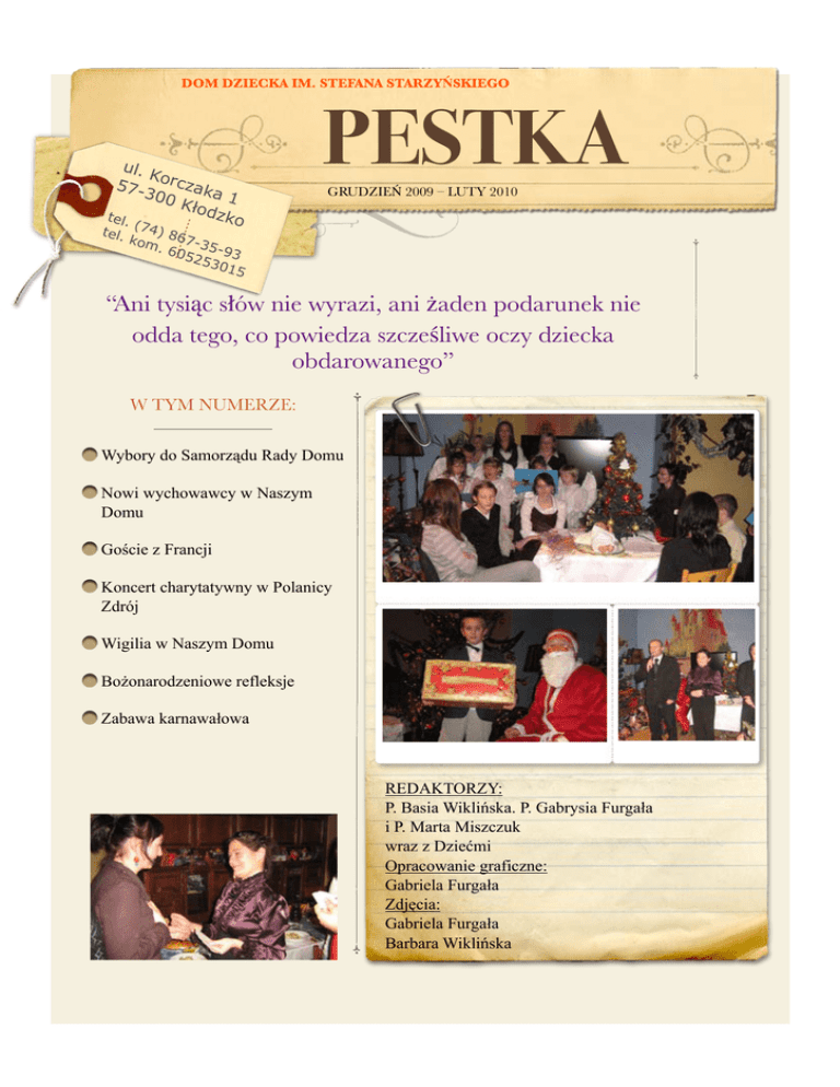 DOM DZIECKA IM. STEFANA STARZYŃSKIEGO ul. K 57- orczak a 300 Kłod 1 zko tel. (7 tel. PESTKA GRUDZIEŃ 2009 – LUTY 2010 4) kom 867-3 5. 60 525 93 301 5 “Ani tysiąc słów nie wyrazi, ani żaden podarunek nie odda tego, co powiedza szcześliwe oczy dziecka obdarowanego” W TYM NUMERZE: Wybory do Samorządu Rady Domu Nowi wychowawcy w Naszym Domu Goście z Francji Koncert charytatywny w Polanicy Zdrój Wigilia w Naszym Domu Bożonarodzeniowe refleksje Zabawa karnawałowa REDAKTORZY: P. Basia Wiklińska. P. Gabrysia Furgała i P. Marta Miszczuk wraz z Dziećmi Opracowanie graficzne: Gabriela Furgała Zdjęcia: Gabriela Furgała Barbara Wiklińska PESTKA! STRONA 2 Wyboru do Samorządu Rady Domu W dniu 30 listopada 2009 r. odbyły się wybory do Rady Domu i opiekuna Rady Domu. W tych wyborach największą ilość głosów otrzymali: • Damian Kurpiński • Joanna Drogoś • Joanna Kuczaj • Katarzyna Leszczyńska •Sandra Gadomska •Damian Le śniewski Wśród kandydatów na Opiekuna Rady Domu najwięcej głosów otrzymała p. Kasia Kusznir. Na pierwszym spotkaniu tj. 01.12.2010 r. nowych członków Rady Domu poprzez głosowanie dokonano wyboru: Przewodniczącego Rady Domu, jego Zastępcy i Sekretarza. Swoje funkcje przyjęli: Damian Kurpiński - Przewodniczący Rady Domu Joanna Drogoś - Zastępca Rady Domu Sandra Gadomska - Sekretarz Rady Domu Pozostali członkowie: Joanna Kuczaj Katarzyna Leszczyńska Damian Leśniewski Ustalono również, że w roku szkolnym 2009/2010 będą działać następujące sekcje: •sportowo - turystyczna - odpowiedzialni: Damian Kurpiński i Damian Leśniewski •rozrywkowo- muzyczna - odpowiedzialni: Sandra Gadomska i Damian Kurpiński • Dekoracyjno - Informacyjna - odpowiedzialne: Joanna Drogoś, Joanna Kuczaj, Kasia Leszczyńska Nowi wychowawcy w Domu Pan Łukasz Wdowiak Pani Karolina Olkiewicz PESTKA! STRONA 3 GOŚCIE Z FRANCJI W Naszym Domu gościliśmy gości z Francji. Są to nasi Przyjaciele, którzy o nas zawsze dbają i pamiętają. Czas oczekiwania na nich był pełen przygotowań i napięcia, ponieważ chcieliśmy, aby wszystko się udało. Przygotowaliśmy powitanie dla gości rozpoczynając je słowami Jana Pawła II „Człowiek jest wielki nie przez to, co posiada, lecz przez to, kim jest; nie przez to, co ma, lecz przez to, czym dzieli się z innymi”. Goście zostali obdarowani przez nas kwiatami oraz szopkami bożonarodzeniowymi wykonanymi z gipsu i malowanymi przez nas samych. Nasi Przyjaciele byli bardzo poruszeni tym powitaniem. Następnie pani Dyrektor oprowadziła gości po całym Naszym Domu. Wszyscy się ze sobą witali i uśmiechali. Później zaprosiliśmy naszych gości do stołu. Było pełno jedzenia! Smakołyki przygotowały dziewczyny z gr. IV i V oraz panie kucharki :) Wcześnie rozmów przy stole było bardzo wesoło, padło wiele pytań odnośnie Naszego Domu i Naszych Gości. Byliśmy bardzo ciekawi jak wyglądają Święta we Francji. Wszyscy się do siebie uśmiechali i było bardzo sympatycznie. Na zakończenie goście obdarowali nas kwiatami oraz ogromnym telewizorem, aby wszystkie dzieci oglądając filmy, mogły poczuć się jak w sali kinowej. Dostaliśmy również odtwarzacz DVD wraz z filmami edukacyjnymi. BARDZO DZIĘKUJEMY!!! PESTKA! STRONA 4 KONCERT CHARYTATYWNY W POLANICY ZDRÓJ 18 grudnia 2009r. w Teatrze Zdrojowym im. Mieczysławy Ćwiklińskiej w Polanicy-Zdroju zorganizowano wielki koncert charytatywny na rzecz dzieci z Domów Dziecka. Było to wydarzenie wyjątkowe. Starosta Kłodzki P. Krzysztof Baldy, wicestarosta P. Marek Bogdał oraz etatowy członek zarządu P. Maciej Awiżeń zaśpiewali i zagrali najbardziej ulubione kolędy oraz pastorałki wraz z dziećmi z Domów Dziecka z Kłodzka z Domaszkowa, Nowej Rudy, Gorzanowa oraz Krosnowic. Z naszej Placówki dzieci pod kierunkiem P. Marty Miszczuk, P. Barbary Wiklińskiej oraz P. Karoliny Olkiewicz przedstawili Spektakl Jasełkowy przeplatany kolędą pt. ,,Uciekali, uciekali…’’. ,,Nie ma w kalendarzu dni bardziej uroczystych, kiedy to tradycja łączy się ze współczesnością, a rodzinna przeszłość z teraźniejszością…. Gdy w pamięci odżywają zapamiętane z dzieciństwa świąteczne zwyczaje, rośnie pragnienie, by znowu ucieszyć się blaskiem Bożego Narodzenia. Przychodzi co roku i chociaż wielu z nas narzeka, że święta urządza się przede wszystkim ze względu na dzieci, choinki, czy by poczuć w ustach smak domowego makowca czy kutii, niecierpliwie rozwiązać wstążeczki prezentów... Tak naprawdę wszyscy dajemy się ponieść atmosferze pełnej duchowych wzruszeń, domowego ciepła i harmonii…’’ - mówiła Angelika Dębska. Na zakończenie przedstawienia wszyscy nasi aktorzy życzyli wszystkim zebranym w Sali Teatru: Zwykłego ludzkiego szczęścia! Święta to czas, kiedy Bóg się rodzi, kiedy moc truchleje, kiedy cały świat kochamy. Święta to czas, kiedy jedno serce podróżuje dla wszystkich; … dla smutnych, opuszczonych Pan się narodził w lichej stajence w cieple serc naszych jak siankiem okryty spokojnie śni. Po przedstawieniach Jasełkowych łamaliśmy się opłatkiem i składaliśmy sobie świąteczne życzenia na tle koncertu kolęd Chóru ,,Chór z Gór’’ z Bystrzycy Kłodzkiej. Wszyscy uczestnicy koncertu mogli kupić kartki świąteczne oraz piękne ozdoby świąteczne i choinkowe wykonane przez wychowanków Domów Dziecka. Prace były wykonane przez naszą młodzież pod kierunkiem P. Ani Nowożyckiej i P. Gabrieli Furgały, P. Marty Miszczuk i P. Czesławy Kasprolewicz. Pani Dyrektor Monika Ślak wraz z delegacją wychowanków podziękowała sponsorom Firmy Fackelmann za przekazany dar dla naszej Placówki. Będziemy czekać rok do następnego wspólnego Bożonarodzeniowego koncertu Domów Dziecka. Opr. Barbara Wiklińska PESTKA! STRONA 5 Bożonarodzeniowe refleksje... "Pan jest blisko!" (Flp. 4, 5) Kolejny raz w życiu prze ż ywali ś my Ś wi ę ta Tajemnicy Miłości B