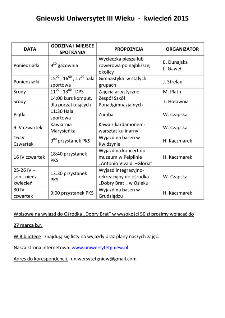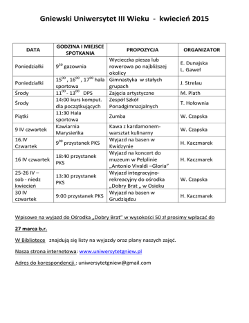 Gniewski Uniwersytet III Wieku - kwiecień 2015 DATA Poniedziałki Poniedziałki Środy Środy Piątki 9 IV czwartek 16.IV Czwartek 16 IV czwartek 25-26 IV – sob - niedz kwiecień 30 IV czwartek GODZINA I MIEJSCE SPOTKANIA PROPOZYCJA Wycieczka piesza lub 9 gazownia rowerowa po najbliższej okolicy 00 00 00 15 , 16 , 17 hala Gimnastyka w stałych sportowa grupach 00 00 11 - 13 DPS Zajęcia artystyczne 14:00 kurs komput. Zespół Szkół dla początkujących Ponadgimnazjalnych 11:30 Hala Zumba sportowa Kawiarnia Kawa z kardamonemMarysieńka warsztat kulinarny Wyjazd na basen w 900 przystanek PKS Kwidzynie Wyjazd na koncert do 18:40 przystanek muzeum w Pelplinie PKS „Antonio Vivaldi –Gloria” Wyjazd integracyjno13:30 przystanek rekreacyjny do ośrodka PKS „Dobry Brat „ w Osieku Wyjazd na basen w 9:00 przystanek PKS Grudziądzu 30 ORGANIZATOR E. Dunajska L. Gaweł J. Strelau M. Plath T. Hołownia W. Czapska W. Czapska H. Kaczmarek H. Kaczmarek W. Czapska H. Kaczmarek Wpisowe na wyjazd do Ośrodka „Dobry Brat” w wysokości 50 zł prosimy wpłacać do 27 marca b.r. W Bibliotece znajdują się listy na wyjazdy oraz plany naszych zajęć. Nasza strona internetowa: www.uniwersytetgniew.pl Adres do korespondencji.: [email protected]