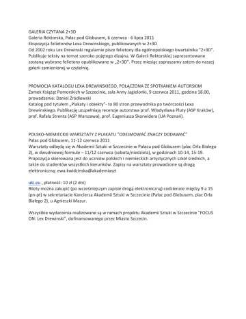 GALERIA CZYTANA 2+3D Galeria Rektorska, Pałac pod Globusem, 6 czerwca -‐ 6 lipca 2011 Ekspozycja felietonów Lexa Drewinskiego, publikowanych w 2+3D Od 2002 roku Lex Drewinski regularnie pisze felietony dla ogólnopolskiego kwartalnika "2+3D". Publikuje teksty na temat szeroko pojętego dizajnu. W Galerii Rektorskiej zaprezentowane zostaną wybrane felietony opublikowane w „2+3D”. Przez miesiąc zapraszamy zatem do naszej galerii zamienionej w czytelnię. PROMOCJA KATALOGU LEXA DREWINSKIEGO, POŁĄCZONA ZE SPOTKANIEM AUTORSKIM Zamek Książąt Pomorskich w Szczecinie, sala Anny Jagielonki, 9 czerwca 2011, godzina 18.00, prowadzenie: Daniel Źródlewski Katalog pod tytułem „Plakaty i obiekty”-‐ to 80 stron przewodnika po twórczości Lexa Drewinskiego. Publikację uzupełniają recenzje autorstwa prof. Władysława Pluty (ASP Kraków), prof. Rafała Strenta (ASP Warszawa), prof. Eugeniusza Skorwidera (UA Poznań). POLSKO-‐NIEMIECKIE WARSZTATY Z PLAKATU "ODEJMOWAĆ ZNACZY DODAWAĆ" Pałac pod Globusem, 11-‐12 czerwca 2011 Warsztaty odbędą się w Akademii Sztuki w Szczecinie w Pałacu pod Globusem (plac Orła Białego 2), w dwudniowej formule – 11/12 czerwca (sobota/niedziela), w godzinach 10-‐14, 15-‐19. Propozycja skierowana jest do uczniów polskich i niemieckich artystycznych szkół średnich, a także do studentów wszystkich kierunków. Zapisy na warsztaty prowadzone są drogą elektroniczną: ewa.kwidzinska@akademiaszt uki.eu , płatność: 10 zł (2 dni) Bilety można zakupić (po wcześniejszym zapisie drogą elektroniczną) codziennie między 9 a 15 (pn-‐pt) w sekretariacie Kanclerza Akademii Sztuki w Szczecinie (Pałac pod Globusem, plac Orła Białego 2), u Agnieszki Mazur. Wszystkie wydarzenia realizowane są w ramach projektu Akademii Sztuki w Szczecinie "FOCUS ON: Lex Drewinski", dofinansowanego przez Miasto Szczecin.