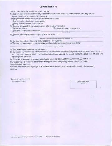 O6wiadczenie *) jakoZleceniobiorca ze: tej umowy, OSwiadczam, (bezwzglqduna podstawie umowyo pracelubr6wnorzgdnej na zatrudniony 1)njestemr6wnocze6nie pracyw kwociebruttowynosi: ze stosunku 2)wynagrodzenie wynagrodzenie, iejminimalne [co najmn ne wynagrodzenie, min imal ni2 lmniej jakoosobawykonujqca: ju2 ubezpieczony 3)njestemjednocze6nie lubagencyjnq, numowqzlecenie [pracg nakladcz4 z innychtytul6wni2w pkt1 i 2: 4)[jestemjuz ubezpieczony "'il't*iiie itpl 'jiiiirloi""iii'v, a'i"r"rnoe"i ivii,i-,tili,il,iil,"rl, i ktowyplaca) 5)njestememerytem Irencistq (nr6wiadczenia 26 lat i nieukoticzylem lub studentem ponadpodstawowej szkoly 6)njestemuczniem bezrobotnych, w rejestrze 4nnie pozostajg art.10ust.1 gospodarczej w rozumieniu dziatalno6ci nieprowadzi umowyzlecenia wykonywanej zakresie 0 nw r 1. z4 2, p0o0z0. 1 7 6 p k t . 3 u s t a w y z 2 6 l i p c a 1 r9.9o1p o d a t k u d o c h o d o w y m o d o s 6 b l i z y c z n y c h ( t j . Dr .zN. U zmianami.) z poZniejszymi gospodarczej iwystawig! rachunek,nfakturqVAT w ramachdzialalnoSci 9)numowgig wyt<onam upzedzq powy2szego o6wiadczenia treSci dotyczqcych zmianach Zeo wszelkich Oswiadczam, naPiSmie. Zleceniodawcg siq pokry6z wlasnych zobowi4zujq ze zmianytreScioSwiadczenia szkodyi kosztywynikajEce Wszelkie 5rodk6w. * Zaznaczy.,wlaSciwykwadrat ** niepotrzebne skreSlic Zleceniobiorca czytelnie IPS Informatycznego DrukowanepfogramemPrzedsiQbiorsiwa ips-infot'conpu http://www