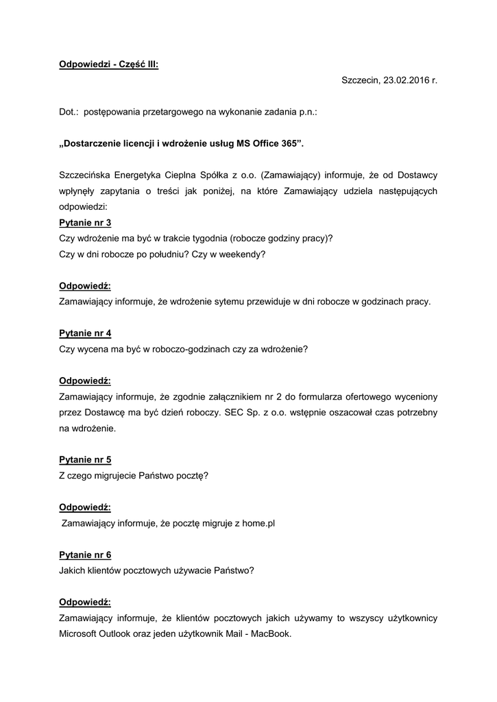 Odpowiedzi - Część III: Szczecin, 23.02.2016 r. Dot.: postępowania przetargowego na wykonanie zadania p.n.: „Dostarczenie licencji i wdrożenie usług MS Office 365”. Szczecińska Energetyka Cieplna Spółka z o.o. (Zamawiający) informuje, że od Dostawcy wpłynęły zapytania o treści jak poniżej, na które Zamawiający udziela następujących odpowiedzi: Pytanie nr 3 Czy wdrożenie ma być w trakcie tygodnia (robocze godziny pracy)? Czy w dni robocze po południu? Czy w weekendy? Odpowiedź: Zamawiający informuje, że wdrożenie sytemu przewiduje w dni robocze w godzinach pracy. Pytanie nr 4 Czy wycena ma być w roboczo-godzinach czy za wdrożenie? Odpowiedź: Zamawiający informuje, że zgodnie załącznikiem nr 2 do formularza ofertowego wyceniony przez Dostawcę ma być dzień roboczy. SEC Sp. z o.o. wstępnie oszacował czas potrzebny na wdrożenie. Pytanie nr 5 Z czego migrujecie Państwo pocztę? Odpowiedź: Zamawiający informuje, że pocztę migruje z home.pl Pytanie nr 6 Jakich klientów pocztowych używacie Państwo? Odpowiedź: Zamawiający informuje, że klientów pocztowych jakich używamy to wszyscy użytkownicy Microsoft Outlook oraz jeden użytkownik Mail - MacBook. Pytanie nr 7 Czy wsparcie obejmuje prace zdalne? Odpowiedź: Tak. Pytanie nr 8 Jakie dane i w jakiej ilości chcą Państwo posiadać w Intranecie? Czy ma być to dostęp przez przeglądarkę, czy wystarczy serwer plików, czyli One Drive? Odpowiedź: Zamawiający informuje, że w Intranecie posiadamy artykuły zawierające elementy graficzne, załączniki w postaci dokumentów; galerie zdjęć; baza kontaktów ze zdjęciami odzwierciedlająca strukturę organizacyjną spółek SEC; baza dokumentów. Dokumenty występują w następujących formatach: pliki MS Office, pliki graficzne, zdjęcia, pliki pdf. Baza dokumentów zawiera ok. 250 plików rozlokowanych w 30 folderach. Wszystkie pliki występują w liczbie ok. 1400, rozlokowane są w 90 folderach (nie licząc zdjęć pracowników). Wielkość ok. 600 MB. Baza kontaktów zawiera ponad 400 pracowników. Ponad 80% posiada załączone zdjęcie. Dostęp powinien odbywać się przez przeglądarkę. Pytanie nr 9 Jak duże skrzynki pocztowe Państwo posiadacie? Odpowiedź: Zamawiający informuje, że skrzynki pocztowe z jakich korzystamy mają różne pojemności od 50 MB do 12 GB. Standardowo przydzielone jest 50-400 MB na pracownika. Sumaryczna wielkość migrowanych skrzynek może wynieść ok 100 GB. Pytanie nr 10 Co miałoby wchodzić w zakres szkolenia? Odpowiedź: Zamawiający informuje, że szkolenia obejmuje: Zakres podstawowy dla administratorów z zakresu Exchange/ Sharepoint umożliwiający płynne przejście w pracy oraz poznanie nowych funkcjonalności w tym: Zarządzanie użytkownikami, grupami i licencjami Zarządzanie klientami Administracja Exchange o konfiguracja archiwizacji o konfiguracja kalendarzy o zarządzanie bezpieczeństwem o konfiguracja dodatkowych adresów mailowych dla użytkowników o tworzenie i zarządzanie zewnętrznymi kontaktami, zasobami i grupami Administracja SharePoint o tworzenie witryn o konfiguracja współdzielenia dla użytkowników zewnętrznych o konfiguracja funkcji społecznościowych i funkcji współpracy Monitorowanie Office 365 Zakres podstawowy dla użytkowników z Sharepoint Exchange/Outlook umożliwiający płynne przejście w pracy oraz poznanie nowych funkcjonalności w tym: Zrozumienie chmury i sposobu pracy w chmurze na aplikacjach pakietu Office 365 Nauka nawigacji w pakiecie Office 365 Zrozumienie komunikacji używając Skype for Business (czym jest skype, jak z niego korzystać). Zrozumienie pracy wspólnej przy użyciu OneDrive (czym jest OneDrive, jak połączyć Office z OneDrive oraz jak uzyskać dostęp do swoich plików oraz jak wspólnie pracować na nich) Ze szczególnym uwzględnieniem pracy z Outlook/Exchange: Kalendarze, udostępnianie, współdzielenie, zastępstwie Zadania Kontakty i ludzie Ustawienia autorespondera i zasad wspólne planowanie, praca w Sporządziła: Agnieszka Śmiechowska
