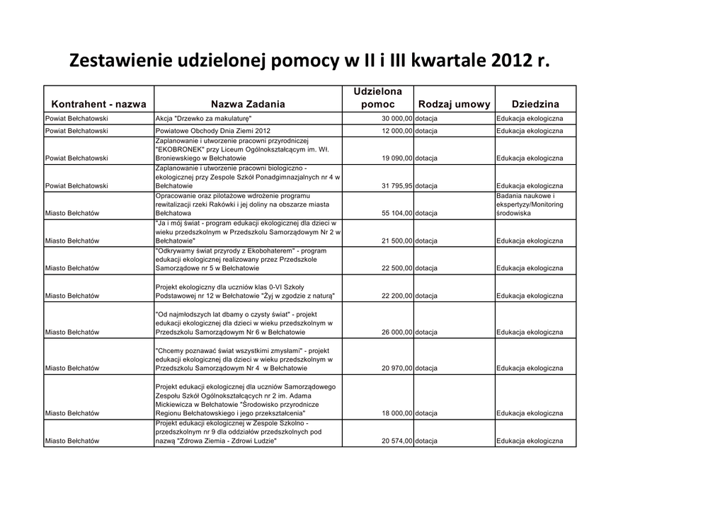 Zestawienie udzielonej pomocy w II i III kwartale 2012 r. Kontrahent - nazwa Nazwa Zadania Udzielona pomoc Rodzaj umowy Dziedzina Powiat Bełchatowski Akcja "Drzewko za makulaturę" 30 000,00 dotacja Edukacja ekologiczna Powiat Bełchatowski 12 000,00 dotacja Edukacja ekologiczna 19 090,00 dotacja Edukacja ekologiczna 31 795,95 dotacja 55 104,00 dotacja Edukacja ekologiczna Badania naukowe i ekspertyzy/Monitoring środowiska 21 500,00 dotacja Edukacja ekologiczna Miasto Bełchatów Powiatowe Obchody Dnia Ziemi 2012 Zaplanowanie i utworzenie pracowni przyrodniczej "EKOBRONEK" przy Liceum Ogólnokształcącym im. Wł. Broniewskiego w Bełchatowie Zaplanowanie i utworzenie pracowni biologiczno ekologicznej przy Zespole Szkół Ponadgimnazjalnych nr 4 w Bełchatowie Opracowanie oraz pilotażowe wdrożenie programu rewitalizacji rzeki Rakówki i jej doliny na obszarze miasta Bełchatowa "Ja i mój świat - program edukacji ekologicznej dla dzieci w wieku przedszkolnym w Przedszkolu Samorządowym Nr 2 w Bełchatowie" "Odkrywamy świat przyrody z Ekobohaterem" - program edukacji ekologicznej realizowany przez Przedszkole Samorządowe nr 5 w Bełchatowie 22 500,00 dotacja Edukacja ekologiczna Miasto Bełchatów Projekt ekologiczny dla uczniów klas 0-VI Szkoły Podstawowej nr 12 w Bełchatowie "Żyj w zgodzie z naturą" 22 200,00 dotacja Edukacja ekologiczna Miasto Bełchatów "Od najmłodszych lat dbamy o czysty świat" - projekt edukacji ekologicznej dla dzieci w wieku przedszkolnym w Przedszkolu Samorządowym Nr 6 w Bełchatowie 26 000,00 dotacja Edukacja ekologiczna Miasto Bełchatów "Chcemy poznawać świat wszystkimi zmysłami" - projekt edukacji ekologicznej dla dzieci w wieku przedszkolnym w Przedszkolu Samorządowym Nr 4 w Bełchatowie 20 970,00 dotacja Edukacja ekologiczna 18 000,00 dotacja Edukacja ekologiczna 20 574,00 dotacja Edukacja ekologiczna Powiat Bełchatowski Powiat Bełchatowski Miasto Bełchatów Miasto Bełchatów Miasto Bełchatów Miasto Bełchatów Projekt edukacji ekologicznej dla uczniów Samorządowego Zespołu Szkół Ogólnokształcących nr 2 im. Adama Mickiewicza w Bełchatowie "Środowisko przyrodnicze Regionu Bełchatowskiego i jego przekształcenia" Projekt edukacji ekologicznej w Zespole Szkolno przedszkolnym nr 9 dla oddziałów przedszkolnych pod nazwą "Zdrowa Ziemia - Zdrowi Ludzie" Miasto Bełchatów Przedsiębiorstwo Energetyki Cieplnej Sp. z o.o. w Bełchatowie Gmina Bełchatów Gmina Bełchatów Gmina Bełchatów Lasy Państwowe Nadleśnictwo Bełchatów Ochotnicza Straż Pożarna w Dobrzelowie Gmina Bełchatów Utworzenie ogródka dydaktycznego "Zielony zakątek miejscem edukacji przyrodniczo - ekologicznej" przy Przedszkolu Samorządowym Nr 8 w Bełchatowie Przebudowa i modernizacja osiedlowych sieci ciepłowniczych w Bełchatowie Utworzenie ogródka dydaktycznego "Tajemniczy zakątek" przy Szkole Podstawowej w Kurnosie Drugim Utworzenie ogródka dydaktycznego "Zielona klasa" przy Szkole Podstawowej w Dobiecinie Zaplanowanie i utworzenie pracowni przyrodniczej "BIOECO" przy Gimnazjum Publicznym w Dobrzelowie Edukacja ekologiczna w Nadleśnictwie Bełchatów realizowana w 2012 roku Zakup średniego samochodu pożarniczego wraz z wyposażeniem Modernizacja oświetlenia ulicznego na terenie Gminy Bełchatów Gmina Drużbice Budowa wodociągu z odgałęzieniami oraz remont wodociągu w ciągu dróg powiatowych w Gminie Drużbice Prace pielęgnacyjne przy pomniku przyrody w Gminie Drużbice Gmina Drużbice Ochotnicza Straż Pożarna w Wadlewie Usuwanie i unieszkodliwianie wyrobów zawierających azbest z terenu Gminy Drużbice Zakup ciężkiego samochodu ratowniczo - gaśniczego dla OSP w Wadlewie z wyposażeniem standardowym Gmina Drużbice Gmina Drużbice Ochotnicza Straż Pożarna w Szczercowie Gmina Zelów Gmina Zelów Gmina Zelów Budowa wodociągu z odgałęzieniami oraz remont wodociągu w ciągu dróg powiatowych w Gminie Drużbice Zakup ciężkiego samochodu ratowniczo - gaśniczego wraz z wyposażeniem dla Ochotniczej Straży Pożarnej w Szczercowie Żyj z przyrodą w zgodzie - z ekologią na co dzień program edukacji ekologicznej w Przedszkolu Samorządowym nr 4 w Zelowie Przygoda z przyrodą - projekt realizowany w ramach programu edukacji ekologiczno-przyrodniczej w Szkole Podstawowej im. mjr. H. Sucharskiego w Bujnach Szlacheckich Zaplanowanie i utworzenie pracowni ekologicznoprzyrodniczej w Szkole Podstawowej im. Mjr. H. Sucharskiego w Bujnach Szlacheckich 31 000,00 dotacja 5 571 064,00 Pożyczka Pomostowa Edukacja ekologiczna Ochrona powietrza 26 340,00 dotacja Edukacja ekologiczna 29 030,00 dotacja Edukacja ekologiczna 33 460,00 dotacja Edukacja ekologiczna 173 000,00 dotacja 360 000,00 dotacja Edukacja ekologiczna Pozostałe zadania ochrony środowiska 271 978,00 pożyczka Ochrona powietrza 273 408,00 dotacja Ochrona Zasobów Wodnych Ochrona przyrody i krajobrazu Gospodarka odpadami i ochrona powierzchni Ziemi Pozostałe zadania ochrony środowiska 686 000,00 pożyczka Ochrona Zasobów Wodnych 285 120,00 dotacja Pozostałe zadania ochrony środowiska 457 333,00 dotacja 4 950,00 dotacja 11 627,55 dotacja 33 700,00 dotacja Edukacja ekologiczna 11 070,00 dotacja Edukacja ekologiczna 32 900,00 dotacja Edukacja ekologiczna Gmina Kutno Program Edukacji Ekologicznej dla dzieci i młodzieży Gminy Zelów Pejzaż Zelowski 2012 Poznaj przyrodę w ogródku dydaktycznym przy Szkole Podstawowej w Pleckiej Dąbrowie "Zaplanowanie i utworzenie pracowni przyrodniczej "EKO" przy Zespole Szkół nr 4 w Kutnie-Azorach" Budowa sieci kanalizacji sanitarnej z przykanalikami w sołectwie Bielawki i Malina gm. Kutno 531 646,00 dotacja Gmina Kutno Unieszkodliwienie odpadów niebezpiecznych zawierających azbest z terenu Gminy Kutno 41 538,42 dotacja Gmina Kutno Budowa zbiornika wyrównawczego wody pitnej na terenie Stacji Uzdatniania Wody w Żurawieńcu gm. Kutno Towarzystwo Szkolne Kociszew Gmina Bedlno Powiat Kutnowski Gmina Kutno Gmina Kutno Gmina Łanię