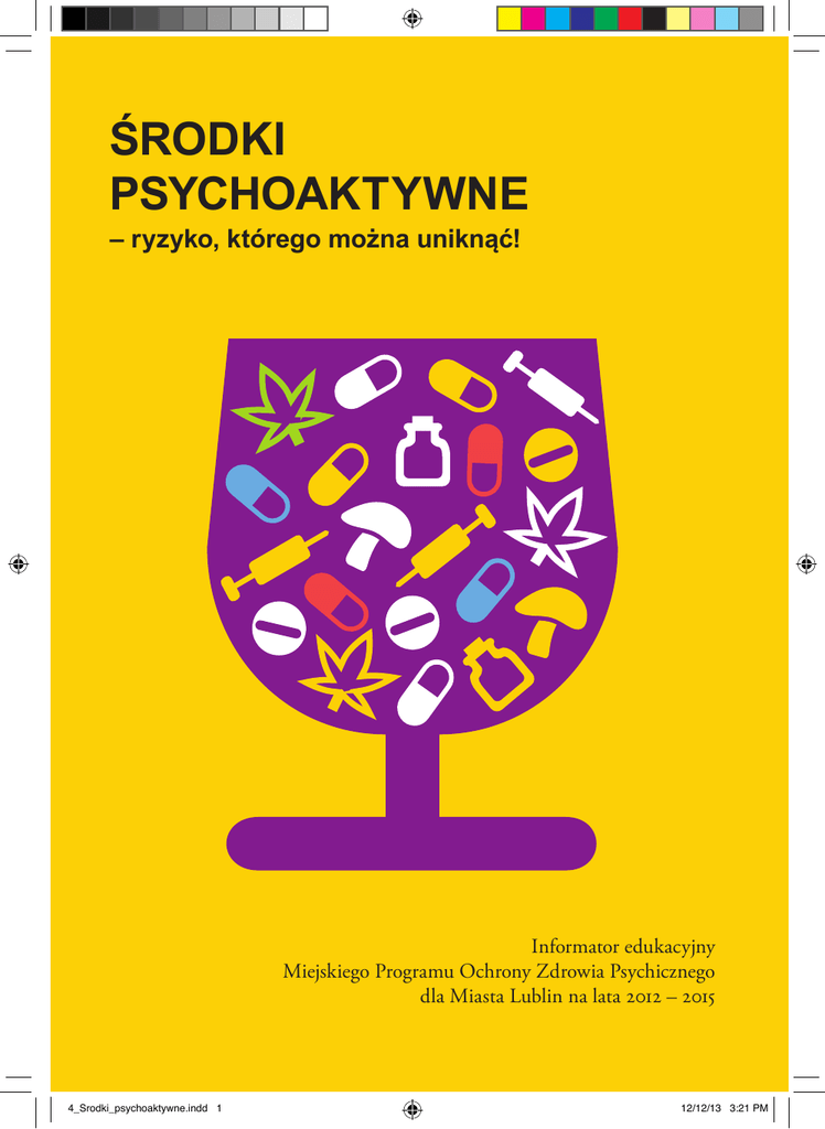 ŚRODKI PSYCHOAKTYWNE – ryzyko, którego można uniknąć! Informator edukacyjny Miejskiego Programu Ochrony Zdrowia Psychicznego dla Miasta Lublin na lata 2012 – 2015 4_Srodki_psychoaktywne.indd 1 12/12/13 3:21 PM 4_Srodki_psychoaktywne.indd 2 12/12/13 3:21 PM ŚRODKI PSYCHOAKTYWNE – ryzyko, którego można uniknąć! INFORMACJE O ŚRODKACH ODURZAJĄCYCH To warto wiedzieć Substancje psychoaktywne, czyli takie, które drogą neurochemiczną oddziałują na nastrój, myślenie i zachowanie, są dziś bardzo często obecne w życiu ludzi. Funkcjonują jako leki w neurologii i psychiatrii, są składnikami różnych używek, a także są zawarte w różnych nielegalnych substancjach służących ludziom do odurzania się. Spośród tych substancji najbardziej rozpowszechniony w naszej kulturze jest alkohol etylowy. Jest on dla wielu nieodłącznym składnikiem życia społecznego i niemal stałym elementem zabaw czy spotkań towarzyskich. Istnienie substancji zmieniających nastrój tak już spowszedniało, że niektórzy zapominają o niebezpiecznych skutkach zażywania takich środków. Nie chodzi tu jedynie o uzależnienie, ale o całą gamę innych problemów i zagrożeń. Zażywanie środków odurzających może bowiem trwale zaburzać funkcjonowanie osobowości, wpływać niekorzystnie na organizm czy prowadzić do poważnych skutków społecznych (zaburzenia relacji międzyludzkich, wypadki, choroby). 3 33 4_Srodki_psychoaktywne.indd 3 12/12/13 3:21 PM 44 SKUTKI PRZYJMOWANIA SUBSTANCJI ODURZAJĄCYCH Jeśli ktoś chce wpływać na swój nastrój i myślenie, np. pijąc alkohol – powinien wiedzieć, jakie mogą być tego konsekwencje. W ten sposób może zachować przynajmniej odpowiednią ostrożność. Alkohol jest szczególnie groźny dla młodych ludzi (przed 18 – 20 r.ż.) oraz kobiet w ciąży i ich nienarodzonych dzieci. Alkohol etylowy – oddziałuje tłumiąco Nawet niewielka dawka alkoholu może być bardzo niebezpieczna dla płodu. Dłuższe przyjmowanie alkoholu wywołuje uzależnienie fizyczne, a jednorazowe większe dawki (6-8 g na 1 kg masy ciała) prowadzą do śmierci. na układ nerwowy, dlatego może dawać uczucie rozluźnienia, odprężenia i prowadzić do rozhamowania poprzez osłabienie kontroli zachowania. Z przyjmowaniem i nadużywaniem alkoholu związanych jest bardzo wiele problemów społecznych i zdrowotnych, począwszy od wypadków spowodowanych przez nietrzeźwych kierowców, a skończywszy na marskości wątroby. 4_Srodki_psychoaktywne.indd 4 Kannabinole – to pochodne konopi indyjskich i konopi siewnych: marihuana, haszysz, olej cannabis. Główna substancja psychoaktywna to THC – tetrahydrokan- 12/12/13 3:21 PM nabinol. Wywołuje uczucie odprężenia i lekkiego podniecenia, zmniejsza samokontrolę, prowadzi do zaburzeń percepcji (czasu, przestrzeni, obrazu ciała, własnego ja). Może powodować uczucie wyostrzenia zmysłów, niekontrolowany śmiech, „filozofowanie”. Zażywanie THC osłabia koordynację wzrokowo-ruchową i czynności automatyczne (wyuczone odruchy) – dlatego jest niebezpieczne, np. dla kierowców oraz nierzadko stanowi przyczynę wypadków przy pracy. Długotrwałe zażywanie prowadzi z reguły do zespołu apatyczno-abulicznego (brak chęci do działania, skrajne osłabienie woli, zamykanie się w sobie). THC może silnie uzależniać psychicznie. Uzależnienie fizyczne jest słabo manifestowane, a objawy odstawienia są mało dotkliwe ze względu na długi okres półtrwania środka (ponad 20 godz.). Leki uspokajające i nasenne – należą do nich głównie barbiturany i benzodiazepiny: cyklobarbital, luminal, diazepam, oksazepam, relanium. Działają nasennie, przeciwdrgawkowo, przeciwlękowo, uspokajająco i znieczulająco. Silnie uzależniają fizycznie i psychicznie. Powinny być stosowane tylko zgodnie z zaleceniami lekarza. Wykorzystywane są także w usuwaniu objawów abstynencyjnych w chorobie alkoholowej, ale w połączeniu z alkoholem mogą prowadzić do śmierci. Wieloletnie przyjmowanie tych środków prowadzi do zaburzeń neurologicznych, hormonalnych, układu krążenia i oddechowego oraz chorób psychicznych, łącznie z zespołem otępiennym. Stymulanty – obejmują substancje pochodzenia roślinnego, jak i syntetyczne – np. kokaina, amfetamina, metaamfetamina, kath, metkatyna, metylfenidat, efedryna, kofeina, nikotyna. Powodują poprawę nastroju, euforię, usuwają zmęczenie, zmniejszają łaknienie, obniżają potrzebę snu, dają poczucie energii, zwiększają wydolność niektórych procesów psychicznych (uwaga, czujność, spostrzeganie), zwiększają pewność siebie. Używanie substancji stymulujących działających na ośrodkowy układ nerwowy, obok uzależnienia, może wywoływać nadciśnienie, bezsenność, drażliwość, agresywność, stany maniakalne i paranoidalne, a także prowadzić do skrajnego wyczerpania organizmu. Większe dawki kokainy i amfetaminy mogą prowadzić do śmierci (paraliż mięśni oddechowych, udar). Halucynogeny – należą do nich między innymi: psylocybina, meskalina, atropina, skopolamina, MDMA (exstasy), LSD. Większość substancji halucynogennych jest pochodzenia roślinnego. Wywołują głównie różnego rodzaju zmiany percepcji i pobudzenia: dają poczucie „poszerzenia świadomości”, „snu na jawie”, iluzje, halucynacje, urojenia, zaburzenia toku myśli, silne wahania nastroju, depersonalizację, stany psychotyczne. Halucynogeny wywołują nadwrażliwość na bodźce, spostrzeganie wielozmysłowe, zaburzenia czasu i przestrzeni, a w niektórych wypadkach mogą dawać doznania mistyczne. Nawet jednorazowe przyjęcie substancji halucynogennej może prowadzić do dramatycznych zachowań lub uszkodzenia układu nerwowego. 5 55 4_Srodki_psychoaktywne.indd 5 12/12/13 3:21 PM 66 Dłuższe odurzanie się i skrajne stany świadomości wywołane halucynogenami mogą prowadzić do dezintegracji osobowości. Inne substancje psychoaktywne – obo