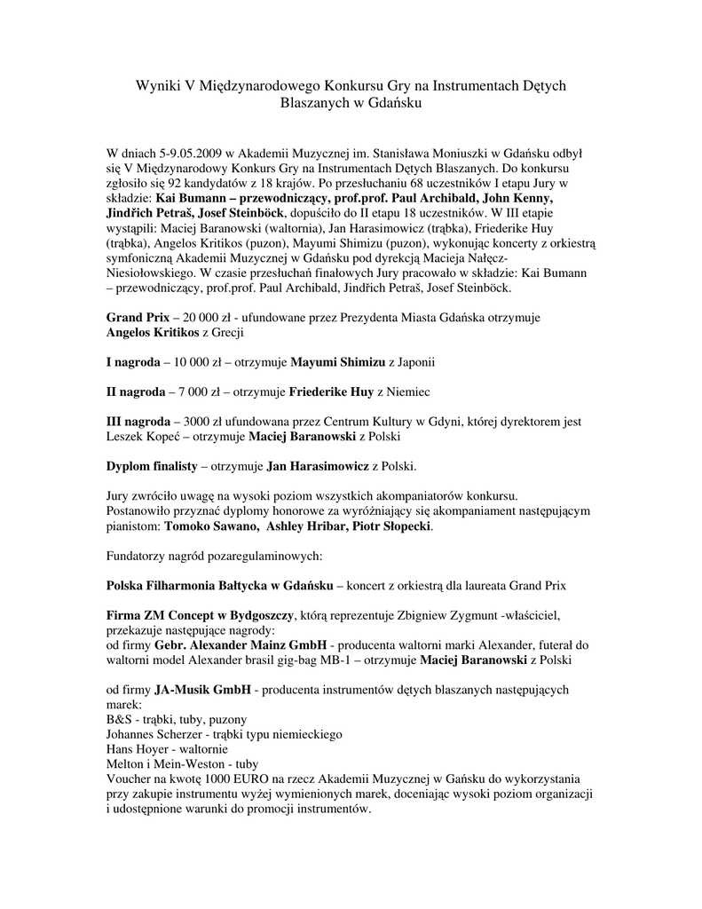 Wyniki V Międzynarodowego Konkursu Gry na Instrumentach Dętych Blaszanych w Gdańsku W dniach 5-9.05.2009 w Akademii Muzycznej im. Stanisława Moniuszki w Gdańsku odbył się V Międzynarodowy Konkurs Gry na Instrumentach Dętych Blaszanych. Do konkursu zgłosiło się 92 kandydatów z 18 krajów. Po przesłuchaniu 68 uczestników I etapu Jury w składzie: Kai Bumann – przewodniczący, prof.prof. Paul Archibald, John Kenny, Jindřich Petraš, Josef Steinböck, dopuściło do II etapu 18 uczestników. W III etapie wystąpili: Maciej Baranowski (waltornia), Jan Harasimowicz (trąbka), Friederike Huy (trąbka), Angelos Kritikos (puzon), Mayumi Shimizu (puzon), wykonując koncerty z orkiestrą symfoniczną Akademii Muzycznej w Gdańsku pod dyrekcją Macieja NałęczNiesiołowskiego. W czasie przesłuchań finałowych Jury pracowało w składzie: Kai Bumann – przewodniczący, prof.prof. Paul Archibald, Jindřich Petraš, Josef Steinböck. Grand Prix – 20 000 zł - ufundowane przez Prezydenta Miasta Gdańska otrzymuje Angelos Kritikos z Grecji I nagroda – 10 000 zł – otrzymuje Mayumi Shimizu z Japonii II nagroda – 7 000 zł – otrzymuje Friederike Huy z Niemiec III nagroda – 3000 zł ufundowana przez Centrum Kultury w Gdyni, której dyrektorem jest Leszek Kopeć – otrzymuje Maciej Baranowski z Polski Dyplom finalisty – otrzymuje Jan Harasimowicz z Polski. Jury zwróciło uwagę na wysoki poziom wszystkich akompaniatorów konkursu. Postanowiło przyznać dyplomy honorowe za wyróżniający się akompaniament następującym pianistom: Tomoko Sawano, Ashley Hribar, Piotr Słopecki. Fundatorzy nagród pozaregulaminowych: Polska Filharmonia Bałtycka w Gdańsku – koncert z orkiestrą dla laureata Grand Prix Firma ZM Concept w Bydgoszczy, którą reprezentuje Zbigniew Zygmunt -właściciel, przekazuje następujące nagrody: od firmy Gebr. Alexander Mainz GmbH - producenta waltorni marki Alexander, futerał do waltorni model Alexander brasil gig-bag MB-1 – otrzymuje Maciej Baranowski z Polski od firmy JA-Musik GmbH - producenta instrumentów dętych blaszanych następujących marek: B&S - trąbki, tuby, puzony Johannes Scherzer - trąbki typu niemieckiego Hans Hoyer - waltornie Melton i Mein-Weston - tuby Voucher na kwotę 1000 EURO na rzecz Akademii Muzycznej w Gańsku do wykorzystania przy zakupie instrumentu wyżej wymienionych marek, doceniając wysoki poziom organizacji i udostępnione warunki do promocji instrumentów. Firma Schagerl – trąbka Schagerl Academica model 1000L – dla najlepszego trębacza Konkursu – otrzymuje Friederike Huy z Niemiec Conn-Selmer Corp. poprzez firmę Brass Point z Poznania – trąbka Bach model Stradivarius 180MLV dla najmłodszego uczestnika konkursu – otrzymuje Aleksander Kobus z Warszawy Krakowska Fundacja Sztuki – zakupy na kwotę 500 zł w sklepie internetowym E-nuty dla najlepszego uczestnika z Akademii Muzycznej w Gdańsku – otrzymuje Jacek Bałka Firma Jarmuła Music – zestaw akcesoriów dla najwyżej sklasyfikowanego uczestnika II etapu, który nie wszedł do finału – otrzymuje Tomasz Stolarczyk z Polski Firma ZM Concept w Bydgoszczy, którą reprezentuje Zbigniew Zygmunt -właściciel, przekazuje od firmy Engelbert Schmid GmbH - producenta waltorni marki Engelbert Schmid, skrzynkę markowego hiszpańskiego czerwonego wina wytrawnego z własnej winnicy pana Engelberta Schmida – otrzymuje Maciej Baranowski z Polski Sponsorem koncertu kwartetu tubowego Miraphone Quartett jest firma Miraphone, którą reprezentuje Inter Mar z Gdańska .W dniu 07 maja 2009 roku od firmy Honiba s.a. - producenta trąbek i puzonów Stomvi, został przekazany na rzecz Akademii Muzycznej w Gdańsku profesjonalny puzon Stomvi model TITAN 5110 o wartości katalogowej 3660,00 Euro w podziękowaniu za udostępnienie wspaniałych warunków do promocji instrumentów oraz doceniając wysoki poziom przygotowania konkursu. Sekretarz Jury, Elżbieta Rosińska