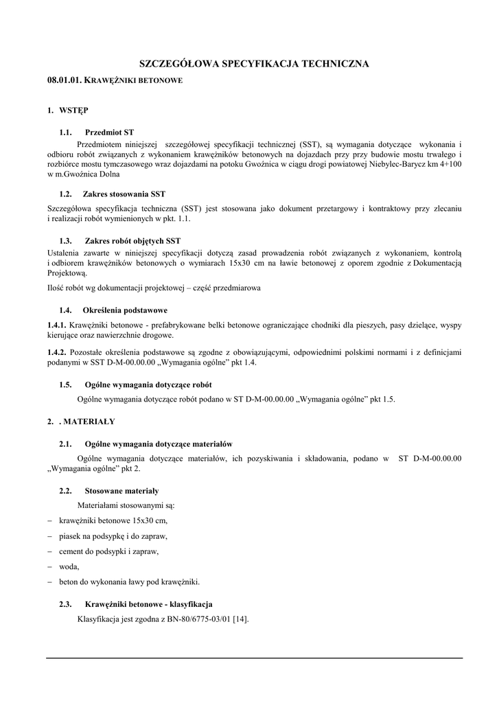 SZCZEGÓŁOWA SPECYFIKACJA TECHNICZNA 08.01.01. KRAWĘśNIKI BETONOWE 1. WSTĘP 1.1. Przedmiot ST Przedmiotem niniejszej szczegółowej specyfikacji technicznej (SST), są wymagania dotyczące wykonania i odbioru robót związanych z wykonaniem krawęŜników betonowych na dojazdach przy przy budowie mostu trwałego i rozbiórce mostu tymczasowego wraz dojazdami na potoku Gwoźnica w ciągu drogi powiatowej Niebylec-Barycz km 4+100 w m.Gwoźnica Dolna 1.2. Zakres stosowania SST Szczegółowa specyfikacja techniczna (SST) jest stosowana jako dokument przetargowy i kontraktowy przy zlecaniu i realizacji robót wymienionych w pkt. 1.1. 1.3. Zakres robót objętych SST Ustalenia zawarte w niniejszej specyfikacji dotyczą zasad prowadzenia robót związanych z wykonaniem, kontrolą i odbiorem krawęŜników betonowych o wymiarach 15x30 cm na ławie betonowej z oporem zgodnie z Dokumentacją Projektową. Ilość robót wg dokumentacji projektowej – część przedmiarowa 1.4. Określenia podstawowe 1.4.1. KrawęŜniki betonowe - prefabrykowane belki betonowe ograniczające chodniki dla pieszych, pasy dzielące, wyspy kierujące oraz nawierzchnie drogowe. 1.4.2. Pozostałe określenia podstawowe są zgodne z obowiązującymi, odpowiednimi polskimi normami i z definicjami podanymi w SST D-M-00.00.00 „Wymagania ogólne” pkt 1.4. 1.5. Ogólne wymagania dotyczące robót Ogólne wymagania dotyczące robót podano w ST D-M-00.00.00 „Wymagania ogólne” pkt 1.5. 2. . MATERIAŁY 2.1. Ogólne wymagania dotyczące materiałów Ogólne wymagania dotyczące materiałów, ich pozyskiwania i składowania, podano w „Wymagania ogólne” pkt 2. 2.2. Stosowane materiały Materiałami stosowanymi są: − krawęŜniki betonowe 15x30 cm, − piasek na podsypkę i do zapraw, − cement do podsypki i zapraw, − woda, − beton do wykonania ławy pod krawęŜniki. 2.3. KrawęŜniki betonowe - klasyfikacja Klasyfikacja jest zgodna z BN-80/6775-03/01 [14]. ST D-M-00.00.00 2.4. KrawęŜniki betonowe - wymagania techniczne 2.4.1. Kształt i wymiary Wymiary krawęŜników betonowych podano w tablicy 1. Dopuszczalne odchyłki wymiarów krawęŜników betonowych podano w tablicy 2. Rys. 1. Wymiarowanie krawęŜników a) krawęŜnik rodzaju „a” Tablica 1. Wymiary krawęŜników betonowych Typ Wymiary krawęŜników, cm Rodzaj krawęŜnika KrawęŜnika U l A 100 b h c d 20 30 min. 3 min. 12 max. 7 max. 15 15 r 1,0 Tablica 2. Dopuszczalne odchyłki wymiarów krawęŜników betonowych Rodzaj Dopuszczalna odchyłka, mm wymiaru Gatunek 1 Gatunek 2 l ±8 ± 12 b, h ±3 ±3 2.4.2. Dopuszczalne wady i uszkodzenia Powierzchnie krawęŜników betonowych powinny być bez rys, pęknięć i ubytków betonu, o fakturze z formy lub zatartej. Krawędzie elementów powinny być równe i proste. Dopuszczalne wady oraz uszkodzenia powierzchni i krawędzi elementów, zgodnie z BN-80/6775-03/01 [14], nie powinny przekraczać wartości podanych w tablicy 3. Tablica 3. Dopuszczalne wady i uszkodzenia krawęŜników betonowych Rodzaj wad i uszkodzeń Dopuszczalna wielkość wad i uszkodzeń Gatunek 1 Gatunek 2 Wklęsłość lub wypukłość powierzchni krawęŜników w mm 2 3 Szczerby i uszkodzenia ograniczających powierzchnie górne (ścieralne), mm krawędzi i naroŜy niedopuszczalne ograniczających pozostałe powierzchnie: - liczba max 2 2 - długość, mm, max 20 40 - głębokość, mm, max 6 10 2.4.3. Składowanie KrawęŜniki betonowe mogą być przechowywane na składowiskach otwartych, posegregowane według typów, rodzajów, odmian, gatunków i wielkości. KrawęŜniki betonowe naleŜy układać z zastosowaniem podkładek i przekładek drewnianych o wymiarach: grubość 2,5 cm, szerokość 5 cm, długość min. 5 cm większa niŜ szerokość krawęŜnika. 2.4.4. Beton i jego składniki 2.4.4.1. Beton do produkcji krawęŜników Do produkcji krawęŜników naleŜy stosować beton wg PN-B-06250 [2], klasy B 25 i B 30. W przypadku wykonywania krawęŜników dwuwarstwowych, górna (licowa) warstwa krawęŜników powinna być wykonana z betonu klasy B 30. Beton uŜyty do produkcji krawęŜników powinien charakteryzować się: − nasiąkliwością, poniŜej 4%, − ścieralnością na tarczy Boehmego, dla gatunku 1: 3 mm, dla gatunku 2: 4 mm, − mrozoodpornością i wodoszczelnością, zgodnie z normą PN-B-06250 [2]. 2.4.4.2. Cement Cement stosowany do betonu powinien być cementem portlandzkim klasy nie niŜszej niŜ „32,5” wg PN-B-19701 Przechowywanie cementu powinno być zgodne z BN-88/6731-08 [12]. 2.4.4.3. Kruszywo Kruszywo powinno odpowiadać wymaganiom PN-B-06712 [5]. Kruszywo naleŜy przechowywać w warunkach zabezpieczających je przed zanieczyszczeniem, zmieszaniem z kruszywami innych asortymentów, gatunków i marek. 2.4.4.4. Woda Woda powinna być odmiany „1” i odpowiadać wymaganiom PN-B-32250 [11]. 2.5. Materiały na podsypkę i do zapraw Piasek na podsypkę cementowo-piaskową powinien odpowiadać wymaganiom PN-B-06712 [5], a do zaprawy cementowo-piaskowej PN-B-06711 [4]. Cement na podsypkę i do zaprawy cementowo-piaskowej powinien być cementem portlandzkim klasy nie mniejszej niŜ „32,5”, odpowiadający wymaganiom PN-B-19701 [10]. Woda powinna być odmiany „1” i odpowiadać wymaganiom PN-B-32250 [11]. 2.6. Materiały na ławy Do wykonania ław pod krawęŜniki naleŜy stosować, dla: a) ławy betonowej - beton klasy B 15, wg PN-B-06250 [2], którego składniki powinny odpowiadać wymaganiom punktu 2.4.4, 2.7. Masa zalewowa Masa zalewowa, do wypełnienia szczelin dylatacyjnych na gorąco, powinna odpowiadać wymaganiom BN-74/6771-04 [13] lub aprobaty technicznej. 3. SPRZĘT 3.1. Ogólne wymagania dotyczące sprzętu Ogólne wymagania dotyczące sprzętu podano w ST D-M-00.00.00 „Wymagania ogólne” pkt 3. 3.2. Sprzęt Roboty wykonuje się ręcznie przy zastosowaniu: − betoniarek do wytwarzania betonu i zapraw oraz przygotowania podsypki cementowo-piaskowej, − wibratorów płytowych, 