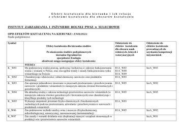 Efekty kształcenia dla kierunku i ich relacje z efektami kształcenia dla obszarów kształcenia INSTYTUT ZARZĄDZANIA I INŻYNIERII ROLNEJ PWSZ w SULECHOWIE OPIS EFEKTÓW KSZTAŁCENIA NA KIERUNKU: ENOLOGIA Studia podyplomowe Symbol Efekty kształcenia dla kierunku studiów Po ukończeniu studiów podyplomowych kierunku Ogrodnictwo specjalności Enologia absolwent osiąga następujące efekty kształcenia: K _W01 K _W02 K _W03 K _W04 K _W05 K_W06 K_W07 WIEDZA Ma podstawową wiedzę prawną, społeczną i kulturową w zakresie funkcjonowania winnic i winiarni w Polsce, oraz zna ogólne trendy i zasady funkcjonowania rynku winiarskiego na Świecie Charakteryzuje właściwości i skład chemiczny surowców oraz produktów fermentacji Zna operacje jednostkowe stosowane w procesach przetwarzania i przechowywania surowców i produktów winiarskich (w mniejszym zakresie również browarniczych i gorzelniczych) Ma aktualną wiedzę z zakresu technologii przetwórstwa surowców winiarskich (w mniejszym zakresie również gorzelniczych i browarniczych) oraz charakteryzuje i klasyfikuje produkty tych technologii Wykazuje znajomość przemian fizyko-chemicznych i biochemicznych zachodzących podczas przetwarzania, utrwalania i przechowywania w surowcach i produktach winiarskich Zna podstawowe techniki analizy wina i moszczu (fizykochemicznej, mikrobiologicznej, sensorycznej, zaawansowanej instrumentalnej) Zna zasady i warunki działania oraz eksploatacji maszyn i urządzeń stosowanych w produkcji win i przetwórstwie surowców winiarskich Odniesienie do efektów kształcenia dla obszaru nauk rolniczych, leśnych i weterynaryjnych Odniesienie do efektów kształcenia prowadzących do uzyskania kompetencji inżynierskich R1A_W02 R1A_W08 R1A_W09 R1A_W03 InzA_W03 R1A_W05 InzA_W02 R1A_W05 InzA_W05 R1A_W03 R1A_W05 InzA_W02 InzA_W01 K_W08 K_W09 K_W 10 K_W 11 K_W 12 K_W 13 K_W 14 K_W 15 K_W 16 K_W 17 K_W 18 K_W 19 K_U01 K_U02 K_U03 K_U04 K_U05 Zna i rozumie podstawowe pojęcia i zasady z zakresu ochrony własności przemysłowej i prawa autorskiego związanego z produkcją winiarską Ma podstawową wiedzę związaną z: opisem technicznym maszyn, urządzeń i procesów technologicznych oraz zna podstawowe zasady realizacji prac projektowych w zakresie małej winiarni. opisuje chemiczne i biochemiczne techniki oraz technologie stosowane w ogrodnictwie charakteryzuje zasady funkcjonowania naturalnych, półnaturalnych oraz sztucznych układów ekologicznych definiuje antropogeniczne zagrożenia środowiska, zna metody i przykłady działań, które mogą poprawić stan środowiska przedstawia formy, działanie i zasady stosowania środków chemicznych w ogrodnictwie, ze szczególnym uwzględnieniem nawożenia i ochrony winorośli definiuje biotyczne i abiotyczne zagrożenia dla upraw winorośli oraz zna metody przeciwdziałania i zwalczania tych zagrożeń ma wiedzę na temat genezy, budowy, funkcjonalności, właściwości i klasyfikacji gleb zna techniki i technologie uprawy winorośli oraz czynniki zewnętrzne i skutki ich stosowania zna działanie urządzeń i systemów technicznych ogrodnictwa oraz opisuje ich funkcjonalność ma podstawową wiedzę z zakresu budownictwa i materiałoznawstwa ogrodowego, w tym konstrukcji budynków i budowli ogrodniczych zna i rozumie historyczne i współczesne determinanty funkcjonowania obszarów wiejskich i miejskich oraz ich rozwoju UMIEJĘTNOŚCI Dokonuje pomiarów oraz interpretuje i optymalizuje parametry fizyko-chemiczne w procesach technologicznych Analizuje zjawiska fizyko-chemiczne i biologiczne zachodzące w procesach wytwarzania i przechowywania wina Posługuje się podstawowym sprzętem laboratoryjnym i aparaturą kontrolnopomiarową stosowaną przy produkcji i analizie surowców i produktów winiarskich Posiada zdolność wykorzystania odpowiednich metod, technik, technologii, narzędzi i materiałów stosowanych w produkcji i utrwalaniu produktów fermentowanych (w szczególności win) Potrafi przeprowadzić sensoryczną, fizykochemiczną i mikrobiologiczną analizę surowców i produktów fermentowanych oraz ich klasyfikację. R1A_W08 R1A_W01 InzA_W03 R1_W05 InzA_W02; InzA_W05 R1_W03; R1_W06 R1_W03; R1_W06 InzA_W02; InzA_W05 R1_W03; R1_W05; R1_W06 R1_W04; R1_W05; R1_W06 R1_W04 InzA_W03; InzA_W04 R1_W04; R1_W05 InzA_W01; InzA_W02 R1_W04; R1_W05 InzA_W01; InzA_W02 R1_W05 InzA_W01; InzA_W02 R1_W07 InzA_W03 InzA_W02 InzA_W03 R1A_U05 R1A_U06 R1A_U05 InzA_U07 R1A_U05 InzA_U07 R1A_U06 InzA_U07 R1A_U06 K_U06 Potrafi dobierać operacje jednostkowe, urządzenia i warunki procesów oraz projektować linie technologiczne w zakładach wytwarzających wina R1A_U02 R1A_U06 R1A_U07 K_U07 Stosuje zasady dobrych praktyk produkcyjnych, laboratoryjnych i gastronomicznych Posiada umiejętność samodzielnego zbierania informacji i przygotowania prac pisemnych dotyczących zagadnień szczegółowych z zakresu enologii Ocenia jakość i przydatność produktu, surowca do: wykorzystania bezpośrednio do spożycia lub przetwórstwa spożywczego R1A_U05 R1A_U06 R1A_U08 R1A_U04 R1A_U05 InzA_U02 InzA_U04 R1A_U01 R1A_U02 R1A_U03 R1A_U06 R1A_U04 InzA_U06 InzA_U07 InzA_U08 R1A_U06; R1A_U07 InzA_U07 R1A_U06; R1A_U07 R1A_U06; R1A_U07 InzA_U06; InzA_U07 InzA_U05; InzA_U07 K_U 19 Potrafi wykonywać projekty i rysunki techniczne oraz czytać ze zrozumieniem dokumentację techniczną, a także nawiązywać kontakt zawodowy ze specjalistami innych dziedzin technicznych w celu rozwiązywania problemów na pograniczu techniki i technologii spożywczej Prawidłowo zbiera i interpretuje informacje oraz przedstawia wyniki swojej pracy i badań ocenia przydatność rutynowych technik uprawowych i pielęgnacyjnych oraz dobiera optymalne rozwiązania dla konkretnych zastosowań układa cykl technologiczny uprawy winorośli w gruncie i pod osłonami ocenia możliwość zastosowania oraz dobiera sprzęt mechaniczny do określonych zadań, warunków uprawowych i pielęgnacyjnych rozpoznaje szkodniki 
