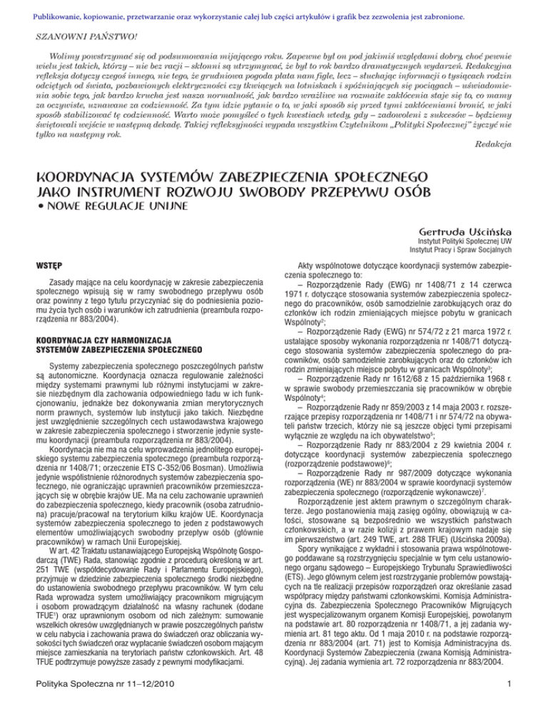 Publikowanie, kopiowanie, przetwarzanie oraz wykorzystanie całej lub części artykułów i grafik bez zezwolenia jest zabronione. SZANOWNI PAŃSTWO! Wolimy powstrzymać się od podsumowania mijającego roku. Zapewne był on pod jakimiś względami dobry, choć pewnie wielu jest takich, którzy – nie bez racji – skłonni są utrzymywać, że był to rok bardzo dramatycznych wydarzeń. Redakcyjna refleksja dotyczy czegoś innego, nie tego, że grudniowa pogoda płata nam figle, lecz – słuchając informacji o tysiącach rodzin odciętych od świata, pozbawionych elektryczności czy tkwiących na lotniskach i spóźniających się pociągach – uświadomienia sobie tego, jak bardzo krucha jest nasza normalność, jak bardzo wrażliwe na rozmaite zakłócenia staje się to, co mamy za oczywiste, uznawane za codzienność. Za tym idzie pytanie o to, w jaki sposób się przed tymi zakłóceniami bronić, w jaki sposób stabilizować tę codzienność. Warto może pomyśleć o tych kwestiach wtedy, gdy – zadowoleni z sukcesów – będziemy świętowali wejście w następną dekadę. Takiej refleksyjności wypada wszystkim Czytelnikom „Polityki Społecznej” życzyć nie tylko na następny rok. Redakcja KOORDYNACJA SYSTEMÓW ZABEZPIECZENIA SPOŁECZNEGO JAKO INSTRUMENT ROZWOJU SWOBODY PRZEPŁYWU OSÓB • NOWE REGULACJE UNIJNE Gertruda Uścińska Instytut Polityki Społecznej UW Instytut Pracy i Spraw Socjalnych WSTĘP Zasady mające na celu koordynację w zakresie zabezpieczenia społecznego wpisują się w ramy swobodnego przepływu osób oraz powinny z tego tytułu przyczyniać się do podniesienia poziomu życia tych osób i warunków ich zatrudnienia (preambuła rozporządzenia nr 883/2004). KOORDYNACJA CZY HARMONIZACJA SYSTEMÓW ZABEZPIECZENIA SPOŁECZNEGO Systemy zabezpieczenia społecznego poszczególnych państw są autonomiczne. Koordynacja oznacza regulowanie zależności między systemami prawnymi lub różnymi instytucjami w zakresie niezbędnym dla zachowania odpowiedniego ładu w ich funkcjonowaniu, jednakże bez dokonywania zmian merytorycznych norm prawnych, systemów lub instytucji jako takich. Niezbędne jest uwzględnienie szczególnych cech ustawodawstwa krajowego w zakresie zabezpieczenia społecznego i stworzenie jedynie systemu koordynacji (preambuła rozporządzenia nr 883/2004). Koordynacja nie ma na celu wprowadzenia jednolitego europejskiego systemu zabezpieczenia społecznego (preambuła rozporządzenia nr 1408/71; orzeczenie ETS C-352/06 Bosman). Umożliwia jedynie współistnienie różnorodnych systemów zabezpieczenia społecznego, nie ograniczając uprawnień pracowników przemieszczających się w obrębie krajów UE. Ma na celu zachowanie uprawnień do zabezpieczenia społecznego, kiedy pracownik (osoba zatrudniona) pracuje/pracował na terytorium kilku krajów UE. Koordynacja systemów zabezpieczenia społecznego to jeden z podstawowych elementów umożliwiających swobodny przepływ osób (głównie pracowników) w ramach Unii Europejskiej. W art. 42 Traktatu ustanawiającego Europejską Wspólnotę Gospodarczą (TWE) Rada, stanowiąc zgodnie z procedurą określoną w art. 251 TWE (współdecydowanie Rady i Parlamentu Europejskiego), przyjmuje w dziedzinie zabezpieczenia społecznego środki niezbędne do ustanowienia swobodnego przepływu pracowników. W tym celu Rada wprowadza system umożliwiający pracownikom migrującym i osobom prowadzącym działalność na własny rachunek (dodane TFUE1) oraz uprawnionym osobom od nich zależnym: sumowanie wszelkich okresów uwzględnianych w prawie poszczególnych państw w celu nabycia i zachowania prawa do świadczeń oraz obliczania wysokości tych świadczeń oraz wypłacanie świadczeń osobom mającym miejsce zamieszkania na terytoriach państw członkowskich. Art. 48 TFUE podtrzymuje powyższe zasady z pewnymi modyfikacjami. Polityka Społeczna nr 11–12/2010 Akty wspólnotowe dotyczące koordynacji systemów zabezpieczenia społecznego to: – Rozporządzenie Rady (EWG) nr 1408/71 z 14 czerwca 1971 r. dotyczące stosowania systemów zabezpieczenia społecznego do pracowników, osób samodzielnie zarobkujących oraz do członków ich rodzin zmieniających miejsce pobytu w granicach Wspólnoty2; – Rozporządzenie Rady (EWG) nr 574/72 z 21 marca 1972 r. ustalające sposoby wykonania rozporządzenia nr 1408/71 dotyczącego stosowania systemów zabezpieczenia społecznego do pracowników, osób samodzielnie zarobkujących oraz do członków ich rodzin zmieniających miejsce pobytu w granicach Wspólnoty3; – Rozporządzenie Rady nr 1612/68 z 15 października 1968 r. w sprawie swobody przemieszczania się pracowników w obrębie Wspólnoty4; – Rozporządzenie Rady nr 859/2003 z 14 maja 2003 r. rozszerzające przepisy rozporządzenia nr 1408/71 i nr 574/72 na obywateli państw trzecich, którzy nie są jeszcze objęci tymi przepisami wyłącznie ze względu na ich obywatelstwo5; – Rozporządzenie Rady nr 883/2004 z 29 kwietnia 2004 r. dotyczące koordynacji systemów zabezpieczenia społecznego (rozporządzenie podstawowe)6; – Rozporządzenie Rady nr 987/2009 dotyczące wykonania rozporządzenia (WE) nr 883/2004 w sprawie koordynacji systemów zabezpieczenia społecznego (rozporządzenie wykonawcze)7. Rozporządzenie jest aktem prawnym o szczególnym charakterze. Jego postanowienia mają zasięg ogólny, obowiązują w całości, stosowane są bezpośrednio we wszystkich państwach członkowskich, a w razie kolizji z prawem krajowym nadaje się im pierwszeństwo (art. 249 TWE, art. 288 TFUE) (Uścińska 2009a). Spory wynikające z wykładni i stosowania prawa wspólnotowego poddawane są rozstrzygnięciu specjalnie w tym celu ustanowionego organu sądowego – Europejskiego Trybunału Sprawiedliwości (ETS). Jego głównym celem jest rozstrzyganie problemów powstających na tle realizacji przepisów rozporządzeń oraz określanie zasad współpracy między państwami członkowskimi. Komis