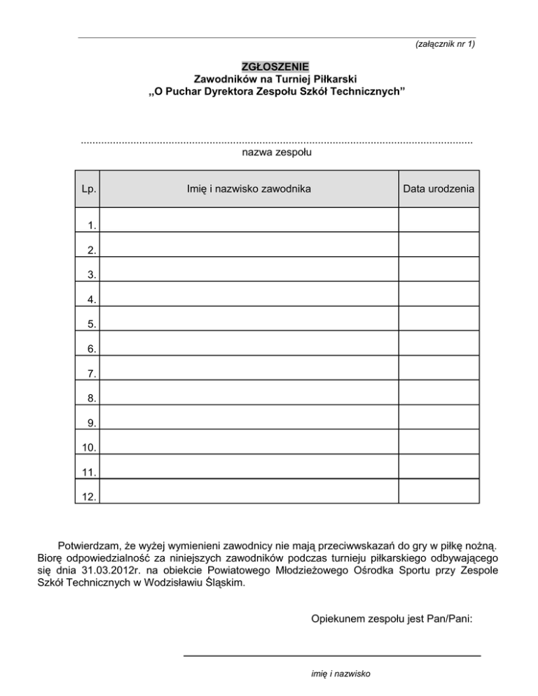 (załącznik nr 1) ZGŁOSZENIE Zawodników na Turniej Piłkarski ,,O Puchar Dyrektora Zespołu Szkół Technicznych” ...................................................................................................................................... nazwa zespołu Lp. Imię i nazwisko zawodnika Data urodzenia 1. 2. 3. 4. 5. 6. 7. 8. 9. 10. 11. 12. Potwierdzam, że wyżej wymienieni zawodnicy nie mają przeciwwskazań do gry w piłkę nożną. Biorę odpowiedzialność za niniejszych zawodników podczas turnieju piłkarskiego odbywającego się dnia 31.03.2012r. na obiekcie Powiatowego Młodzieżowego Ośrodka Sportu przy Zespole Szkół Technicznych w Wodzisławiu Śląskim. Opiekunem zespołu jest Pan/Pani: imię i nazwisko (załącznik nr 2) ZGODA RODZICA/OPIEKUNA NA UDZIAŁ DZIECKA W TURNIEJU PIŁKARSKIM Wyrażam zgodę na udział mojego dziecka …………………………………………….. w turnieju piłki nożnej ,,O Puchar Dyrektora Zespołu Szkół Technicznych” odbywającego się dnia 31.03.2012r. na obiekcie Powiatowego Młodzieżowego Ośrodka Sportu przy Zespole Szkół Technicznych w Wodzisławiu Śląskim. Ponadto zaświadczam, iż dziecko jest zdrowe i nie ma przeciwskazań do jego uczestnictwa w niniejszych rozgrywkach. Zgadzam się na samodzielne przybycie dziecka na zawody oraz powrót do domu. ………………………………………. (miejscowość/data) ……………………………………… (podpis rodzica/opiekuna) ZGODA RODZICA/OPIEKUNA NA UDZIAŁ DZIECKA W TURNIEJU PIŁKARSKIM Wyrażam zgodę na udział mojego dziecka …………………………………………….. w turnieju piłki nożnej ,,O Puchar Dyrektora Zespołu Szkół Technicznych” odbywającego się dnia 31.03.2012r. na obiekcie Powiatowego Młodzieżowego Ośrodka Sportu przy Zespole Szkół Technicznych w Wodzisławiu Śląskim. Ponadto zaświadczam, iż dziecko jest zdrowe i nie ma przeciwskazań do jego uczestnictwa w niniejszych rozgrywkach. Zgadzam się na samodzielne przybycie dziecka na zawody oraz powrót do domu. ………………………………………. (miejscowość/data) ……………………………………… (podpis rodzica/opiekuna) ZGODA RODZICA/OPIEKUNA NA UDZIAŁ DZIECKA W TURNIEJU PIŁKARSKIM Wyrażam zgodę na udział mojego dziecka …………………………………………….. w turnieju piłki nożnej ,,O Puchar Dyrektora Zespołu Szkół Technicznych” odbywającego się dnia 31.03.2012r. na obiekcie Powiatowego Młodzieżowego Ośrodka Sportu przy Zespole Szkół Technicznych w Wodzisławiu Śląskim. Ponadto zaświadczam, iż dziecko jest zdrowe i nie ma przeciwskazań do jego uczestnictwa w niniejszych rozgrywkach. Zgadzam się na samodzielne przybycie dziecka na zawody oraz powrót do domu. ………………………………………. (miejscowość/data) ……………………………………… (podpis rodzica/opiekuna) ZGODA RODZICA/OPIEKUNA NA UDZIAŁ DZIECKA W TURNIEJU PIŁKARSKIM Wyrażam zgodę na udział mojego dziecka …………………………………………….. w turnieju piłki nożnej ,,O Puchar Dyrektora Zespołu Szkół Technicznych” odbywającego się dnia 31.03.2012r. na obiekcie Powiatowego Młodzieżowego Ośrodka Sportu przy Zespole Szkół Technicznych w Wodzisławiu Śląskim. Ponadto zaświadczam, iż dziecko jest zdrowe i nie ma przeciwskazań do jego uczestnictwa w niniejszych rozgrywkach. Zgadzam się na samodzielne przybycie dziecka na zawody oraz powrót do domu. ………………………………………. (miejscowość/data) ……………………………………… (podpis rodzica/opiekuna) ZGODA RODZICA/OPIEKUNA NA UDZIAŁ DZIECKA W TURNIEJU PIŁKARSKIM Wyrażam zgodę na udział mojego dziecka …………………………………………….. w turnieju piłki nożnej ,,O Puchar Dyrektora Zespołu Szkół Technicznych” odbywającego się dnia 31.03.2012r. na obiekcie Powiatowego Młodzieżowego Ośrodka Sportu przy Zespole Szkół Technicznych w Wodzisławiu Śląskim. Ponadto zaświadczam, iż dziecko jest zdrowe i nie ma przeciwskazań do jego uczestnictwa w niniejszych rozgrywkach. Zgadzam się na samodzielne przybycie dziecka na zawody oraz powrót do domu. ………………………………………. (miejscowość/data) ……………………………………… (podpis rodzica/opiekuna)