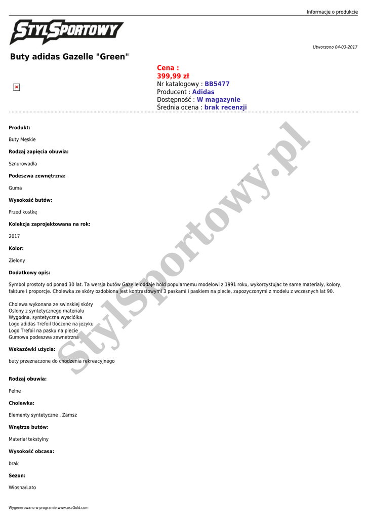 Informacje o produkcie Utworzono 04-03-2017 Buty adidas Gazelle "Green" Cena : 399,99 zł Nr katalogowy : BB5477 Producent : Adidas Dostępność : W magazynie Średnia ocena : brak recenzji Produkt: pl Buty Męskie Rodzaj zapięcia obuwia: y. Sznurowadła Podeszwa zewnętrzna: Wysokość butów: Przed kostkę Kolekcja zaprojektowana na rok: 2017 Kolor: Zielony lS p Dodatkowy opis: or to w Guma Symbol prostoty od ponad 30 lat. Ta wersja butów Gazelle oddaje hold popularnemu modelowi z 1991 roku, wykorzystujac te same materialy, kolory, fakture i proporcje. Cholewka ze skóry ozdobiona jest kontrastowymi 3 paskami i paskiem na piecie, zapozyczonymi z modelu z wczesnych lat 90. St y Cholewa wykonana ze swinskiej skóry Oslony z syntetycznego materialu Wygodna, syntetyczna wysciólka Logo adidas Trefoil tloczone na jezyku Logo Trefoil na pasku na piecie Gumowa podeszwa zewnetrzna Wskazówki użycia: buty przeznaczone do chodzenia rekreacyjnego Rodzaj obuwia: Pełne Cholewka: Elementy syntetyczne , Zamsz Wnętrze butów: Materiał tekstylny Wysokość obcasa: brak Sezon: Wiosna/Lato Wygenerowano w programie www.oscGold.com Rozmiar prezentowany na zdjęciach: 44 Przeznaczenie: Klasyka BB5477 Dostępne opcje Buty adidas Gazelle "Green" St y lS p or to w y. pl Rozmiar: 41|1/3, 42, 42|2/3, 43|1/3, 44, 44|2/3, 45|1/3, 46, 46|2/3.