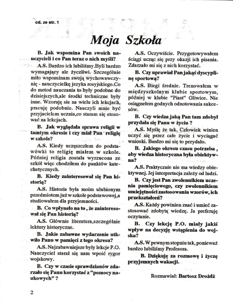 cd. ze 3tr. 1 Moja B. Jak wspomina Pan swoich nauczycieli i co Pan'teraz o nich myśli? A.S. Bardzo ich lubiliśmy.Byli bardzo wymagająey ale życł}iwi"Szozególnie miło wspominam swÓją wychowawczy_ nię _ nauczycielkę jezyka rosyjskiego.Co do metod nauczania to"były,podobne do dzisiejszych,ale środki techniczne byĘ inne. Wzoruję sie na wielu ich lekcjach, pracuję podobnie. Nauczyli mnie być przyjacielem ucznia,co staram się stosować na lekcjach. B. Jak wygĘdda spnwa religii w tbmtynr olrresic i cŻy lillat ?ah "rctigę w szkole? A.S. Kiedy uczęszczłem do podsta_ wówki to religię miałem łr szkole. Później religia została wyrzucona ze szkół więc chodziłem do punktów latechetycmych. B. Kiedy storią? zainteresowd się Pan hi- A.S. Historia była rroim ulubionym przednriotem już w szkole podstawowej,a sfu diowałem dla ptzyjemności. , B. Cow$ynełonatorżezainteresowdsię Pan lristoĄ? A.S. Głównie literafura,s zczególnte lektury histqryczne. B. Jakie zabawne wydarzenie utk- wiło Panu w.pamięci ztego okresu? A.S. Najzabawniejsze były tekcje P.o. Nauczyciel starał się nam wpoić rygor wojskowy. B. Czy w czasie sprawdzianów zdatzało się Panukorzystać z ''pomocynaukowychtt ? 2 SrIffi A.S. oczywiście. Przygotowywałem ściągiucząc się przy okazji ich pisania. 7,darzeło mi się z nich korzystać. B. Czy uprawiał PanjaĘśdyscypH- nę spor'tową? A.S. Biegi średnie. Trenowałęm w międżyszkolnym klubie sportowym, późtttej w klubie ''Piast'' Gliwice. Nie osiągnełem godnych odnotowania sukct _ só'w. B. Czy wiedzajaĘ Pan tam rAobył przydałasię Panu w źryciu ? A.S. Myślężę tak. Cźgwiek winien uczyć się przez całe Życie i wyciągać wnioski. Bardzo mi się to ptzydało. B. Jakięo olrrtsu czasu potrzeba , aby wierlza historyczra Ęła obiektyw. na? A.S. PraĘcznie nie ma wiedzy obie- Ęwnej. Jej interpretacja zależy od ludzi. B. Czy jest Pan zwolennikiem uczenia pamięciowego' czy zwolennikiem umieJętności zastgsowania wzońw, ich przekształceń? A.S. Ka:żdy powinien znać i umieć za_ stosować zdobyą wiedzę. Ja preferuję oczytanie. B. Czy lekcję P.O. miaĘ jakiś wpływ na decy4ię wsĘpienia do wojska? A.S. W pewnym stopniu tak, ponieważ bardzo lubiliśmyProfesora. B. DzięĘię za romowę i zycą prTyjemnych wakacji.. Rozmawiał: Bartosz Dnoźdż