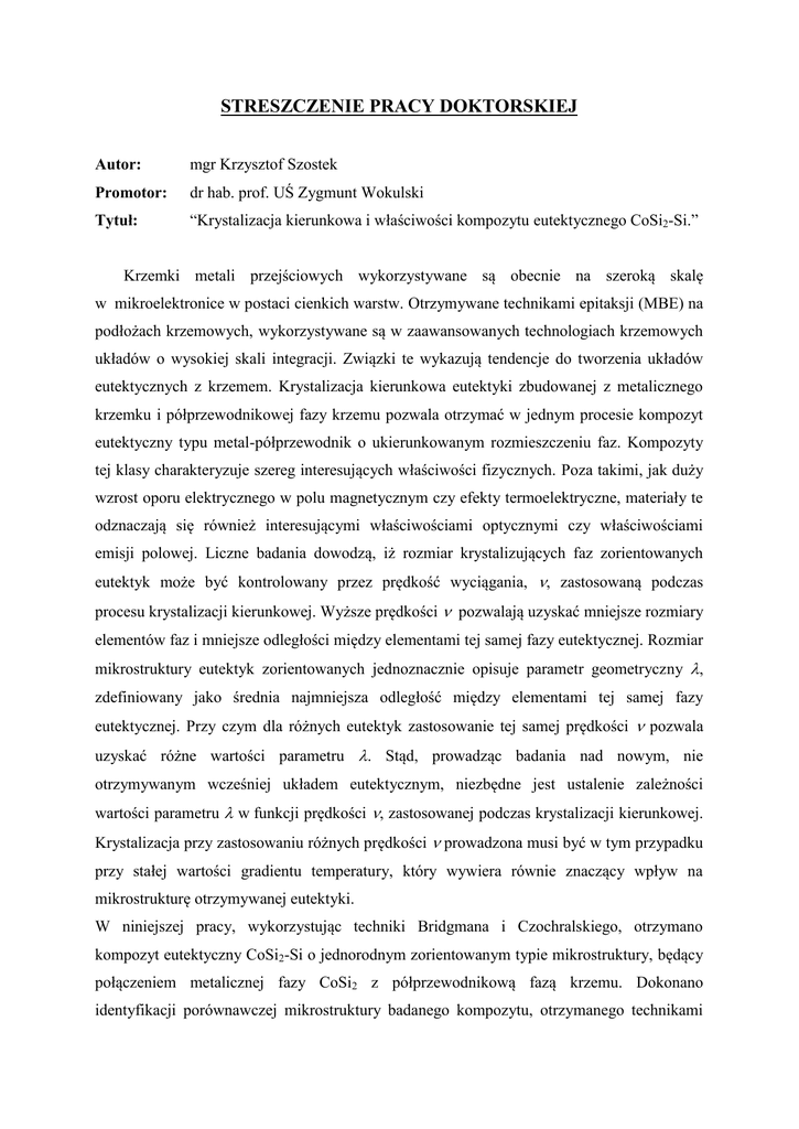 STRESZCZENIE PRACY DOKTORSKIEJ Autor: mgr Krzysztof Szostek Promotor: dr hab. prof. UŚ Zygmunt Wokulski Tytuł: “Krystalizacja kierunkowa i właściwości kompozytu eutektycznego CoSi2-Si.” Krzemki metali przejściowych wykorzystywane są obecnie na szeroką skalę w mikroelektronice w postaci cienkich warstw. Otrzymywane technikami epitaksji (MBE) na podłożach krzemowych, wykorzystywane są w zaawansowanych technologiach krzemowych układów o wysokiej skali integracji. Związki te wykazują tendencje do tworzenia układów eutektycznych z krzemem. Krystalizacja kierunkowa eutektyki zbudowanej z metalicznego krzemku i półprzewodnikowej fazy krzemu pozwala otrzymać w jednym procesie kompozyt eutektyczny typu metal-półprzewodnik o ukierunkowanym rozmieszczeniu faz. Kompozyty tej klasy charakteryzuje szereg interesujących właściwości fizycznych. Poza takimi, jak duży wzrost oporu elektrycznego w polu magnetycznym czy efekty termoelektryczne, materiały te odznaczają się również interesującymi właściwościami optycznymi czy właściwościami emisji polowej. Liczne badania dowodzą, iż rozmiar krystalizujących faz zorientowanych eutektyk może być kontrolowany przez prędkość wyciągania, , zastosowaną podczas procesu krystalizacji kierunkowej. Wyższe prędkości pozwalają uzyskać mniejsze rozmiary elementów faz i mniejsze odległości między elementami tej samej fazy eutektycznej. Rozmiar mikrostruktury eutektyk zorientowanych jednoznacznie opisuje parametr geometryczny , zdefiniowany jako średnia najmniejsza odległość między elementami tej samej fazy eutektycznej. Przy czym dla różnych eutektyk zastosowanie tej samej prędkości pozwala uzyskać różne wartości parametru . Stąd, prowadząc badania nad nowym, nie otrzymywanym wcześniej układem eutektycznym, niezbędne jest ustalenie zależności wartości parametru w funkcji prędkości , zastosowanej podczas krystalizacji kierunkowej. Krystalizacja przy zastosowaniu różnych prędkości prowadzona musi być w tym przypadku przy stałej wartości gradientu temperatury, który wywiera równie znaczący wpływ na mikrostrukturę otrzymywanej eutektyki. W niniejszej pracy, wykorzystując techniki Bridgmana i Czochralskiego, otrzymano kompozyt eutektyczny CoSi2-Si o jednorodnym zorientowanym typie mikrostruktury, będący połączeniem metalicznej fazy CoSi2 z półprzewodnikową fazą krzemu. Dokonano identyfikacji porównawczej mikrostruktury badanego kompozytu, otrzymanego technikami Bridgmana i Czochralskiego. Ustalono także zakres prędkości dla danego gradientu temperatury umożliwiający otrzymanie kompozytu CoSi2-Si o zorientowanym typie mikrostruktury techniką Bridgmana. Celem identyfikacji otrzymanych próbek przeprowadzono rentgenowską jakościową analizę składu fazowego i punktową mikroanalizę rentgenowską. Określono także temperaturę eutektyczną otrzymanych próbek z wykorzystaniem różnicowej kalorymetrii skaningowej (DSC) i wyznaczono parametry sieciowe faz CoSi2 i Si otrzymanego kompozytu. Kompozyt CoSi2-Si nie był otrzymywany do tej pory technikami Bridgmana i Czochralskiego, dlatego w niniejszej pracy określono zależność wartości parametru od zastosowanej podczas procesu krystalizacji prędkości dla próbek wykazujących zorientowany typ mikrostruktury. W ramach badań uzupełniających, celem określenia charakteru przewodnictwa elektrycznego kompozytu CoSi2-Si, wyznaczono temperaturową zależność rezystywności otrzymanych próbek, stosując metodę Van der Pouwa.