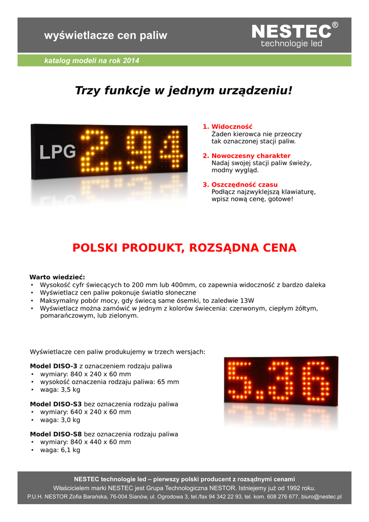 wyświetlacze cen paliw katalog modeli na rok 2014 Trzy funkcje w jednym urządzeniu! 1. Widoczność Żaden kierowca nie przeoczy tak oznaczonej stacji paliw. 2. Nowoczesny charakter Nadaj swojej stacji paliw świeży, modny wygląd. 3. Oszczędność czasu Podłącz najzwyklejszą klawiaturę, wpisz nową cenę, gotowe! POLSKI PRODUKT, ROZSĄDNA CENA Warto wiedzieć: • Wysokość cyfr świecących to 200 mm lub 400mm, co zapewnia widoczność z bardzo daleka • Wyświetlacz cen paliw pokonuje światło słoneczne • Maksymalny pobór mocy, gdy świecą same ósemki, to zaledwie 13W • Wyświetlacz można zamówić w jednym z kolorów świecenia: czerwonym, ciepłym żółtym, pomarańczowym, lub zielonym. Wyświetlacze cen paliw produkujemy w trzech wersjach: Model DISO-3 z oznaczeniem rodzaju paliwa • wymiary: 840 x 240 x 60 mm • wysokość oznaczenia rodzaju paliwa: 65 mm • waga: 3,5 kg Model DISO-S3 bez oznaczenia rodzaju paliwa • wymiary: 640 x 240 x 60 mm • waga: 3,0 kg Model DISO-S8 bez oznaczenia rodzaju paliwa • wymiary: 840 x 440 x 60 mm • waga: 6,1 kg NESTEC technologie led – pierwszy polski producent z rozsądnymi cenami Właścicielem marki NESTEC jest Grupa Technologiczna NESTOR. Istniejemy już od 1992 roku. P.U.H. NESTOR Zofia Barańska, 76-004 Sianów, ul. Ogrodowa 3, tel./fax 94 342 22 93, tel. kom. 608 276 677, [email protected] pierwszy polski producent z rozsądnymi cenami WYŚWIETLACZE SERII DISO – WYSOKOŚĆ 24cm i 44cm Model DISO-3 Wymiary zewn. (mm) Oznaczenie paliwa 840 x 240 x 60 tak Cena netto (PLN) 850,00 Model Wymiary zewn. (mm) Oznaczenie paliwa Cena netto (PLN) DISO-S3 640 x 240 x 60 nie 800,00 DISO-S8 840 x 440 x 60 nie 1 660,00 WYPOSAŻENIE OPCJONALNE Model Opis Cena netto (PLN) NKBD-5m Przedłużacz do klaw. 5mb 28,00 NKBD-10m Przedłużacz do klaw. 10mb 38,00 NKBD-15m Przedłużacz do klaw. 15mb 48,00 Model NLS Opis Czujnik oświetlenia Cena netto (PLN) 50,00 Podane ceny nie zawierają kosztów zakupu standardowej klawiatury komputerowej PS/2. Zgodnie z zasadami NESTEC, dotyczącymi stałego udoskonalania produktów, zastrzegamy sobie prawo do wprowadzania zmian w specyfikacji technicznej i cenniku bez wcześniejszego powiadomienia. Niniejszy cennik nie stanowi oferty w rozumieniu art. 71 kodeksu cywilnego. Podane ceny są cenami netto i należy do nich doliczyć 23% VAT.