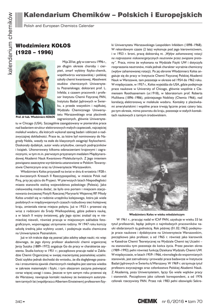 kalendarium chemików Kalendarium Chemików – Polskich i Europejskich Polish and European Chemists Calendar Włodzimierz KOŁOS (1928 – 1996) Mija 20 lat, gdy w czerwcu 1996 r., po długim okresie choroby i cierpień, zmarł wybitny fizyko-chemik, współtwórca warszawskiej i polskiej szkoły chemii kwantowej. Absolwent studiów chemicznych Uniwersytetu Poznańskiego; doktorant prof. L. Infelda; z czasem pracownik i profesor Instytutu Chemii Fizycznej PAN, Instytutu Badań Jądrowych w Świerku, a przede wszystkim i najdłużej, Wydziału Chemicznego Uniwersytetu Warszawskiego oraz placówek Prof. dr hab. Włodzimierz Kołos zagranicznych, głównie Uniwersytetu w Chicago (USA). Szczególnie zaangażowany w pionierskie prace nad badaniem struktur elektronowych małych cząsteczek, najczęściej molekuł wodoru, dla których wykonał szereg badań i obliczeń o nadzwyczajnej dokładności. Prace te, za które był nominowany do Nagrody Nobla, weszły na stałe do klasycznych osiągnięć fizykochemii. Doskonały dydaktyk, autor wielu artykułów, cennych podręczników i książek. Uhonorowany kilkoma odznaczeniami krajowymi i zagranicznymi, w tym m.in. pierwszym przyznanym medalem Międzynarodowej Akademii Nauk Kwantowo–Molekularnych. Z Jego imieniem powiązano zaszczytne wyróżnienia ustanowione w Polskim Towarzystwie Chemicznym oraz na Uniwersytecie Warszawskim. Włodzimierz Kołos przyszedł na świat w dniu 6 września 1928 r. na ówczesnych Kresach II Rzeczypospolitej, w mieście Pińsk nad Piną, przy jej ujściu do Prypeci. W pierwszych latach Niepodległości miasto stanowiło stolicę województwa poleskiego (Polesia). Jako ciekawostkę można dodać, że było ono portem i miejscem stacjonowania ówczesnej Flotylli Rzecznej Marynarki Wojennej RP. Młody Kołos urodził się w rodzinie urzędnika kolejowego, która jak wiele podobnych w międzywojennych czasach rozbudowy sieci kolejowej kraju, zmieniała nieraz miejsce pobytu. Już w 1933 r. przenosi się wraz z rodzicami do Środy Wielkopolskiej, gdzie pobiera naukę, a w latach II wojny światowej, gdy Jego ojciec znalazł się w niemieckiej niewoli, również pracuje w miejscowym zakładzie fotograficznym, wspomagając utrzymanie rodziny. W 1947 roku kończy szkołę średnią jako wybitny uczeń, i podejmuje studia chemiczne na Uniwersytecie Poznańskim. Już w ich trakcie daje się poznać jako zdolny adept nauki; nic więc dziwnego, że jego słynny profesor akademicki chemii organicznej Jerzy Suszka (1889–1972) angażuje Go do pracy w charakterze asystenta. Studia kończy w 1951 r.; początkowo pracuje nadal w Zakładzie Chemii Organicznej w swojej macierzystej poznańskiej uczelni. Dość szybko jednak dochodzi do wniosku, że dla dogłębnego poznania i zrozumienia zjawisk chemicznych niezbędna jest szersza wiedza w zakresie matematyki i fizyki, i tym obszarom zaczyna poświęcać coraz więcej uwagi i czasu. Jeszcze w tym samym roku przenosi się do Warszawy, nawiązuje kontakt naukowy ze światowym autorytetem tamtych lat (współpraca z Albertem Einsteinem) profesorem fizy- 340 • ki Uniwersytetu Warszawskiego Leopoldem Infeldem (1898–1968). W rekordowym czasie (2 lata) wykonuje pod jego kierownictwem, i w 1953 r. broni, pracę doktorską nt. „Wpływ zahamowanej rotacji na rozpraszanie niskoenergetycznych neutronów przez związane protony”. Praca, mimo że wykonana na Wydziale Fizyki UW i dotyczyła rozpraszania neutronów, miała jednak charakter wyraźnie chemiczny (wpływ zahamowanej rotacji). Po jej obronie Włodzimierz Kołos angażuje się do pracy w Instytucie Chemii Fizycznej Polskiej Akademii Nauk w Warszawie, tam pozostaje w okresie od 1954 do 1962 roku. W międzyczasie, w 1957 r., Kołos wyjeżdża do USA, gdzie podejmuje prace naukowe w University of Chicago, głównie wspólnie z Clemensem Roothaanemem (ur.1918), w laboratorium prof. Roberta Mullikena (1896–1986), późniejszego Noblisty (Chemia 1966), nad korelacją elektronową w molekule wodoru. Kontakty z placówkami amerykańskimi i wspólne prace trwają łącznie przez cztery lata; po tym okresie, mimo powrotu do kraju, pozostaje w stałych kontaktach naukowych z tamtym środowiskiem. Włodzimierz Kołos w wieku młodzieńczym W 1961 r., pracując nadal w IChF PAN, uzyskuje w wieku 33 lat tytuł profesorski, będąc jednym z najmłodszych pracowników nauki obdarzonych tą godnością. Rok później (01.02.1962) podejmuje prace naukowe i dydaktyczne na Uniwersytecie Warszawskim, początkowo jako profesor, a od 1965 r. również jako kierownik w Katedrze Chemii Teoretycznej na Wydziale Chemii tej Uczelni – na stanowisku tym pozostaje do końca życia. Przez pewien okres (1989–1992) pełni również funkcję Dziekana Wydziału Chemii UW. W międzyczasie, w latach 1959–1966, równolegle do wspomnianych stanowisk, jest zatrudniony i prowadzi prace badawcze w Instytucie Badań Jądrowych w Świerku k/Warszawy. W 1969 r. otrzymuje tytuł profesora zwyczajnego oraz członkostwo Polskiej Akademii Nauk. Z Akademią, poza Uniwersytetem, łączy Go wiele wątków pracy i stanowisk. Początkowo jako członek korespondent, a od 1976 członek rzeczywisty PAN. Przez rok 1983 pełni obowiązki Sekre- nr 6/2016 • tom 70 nr 6/2016 • tom 70 torstwa wybitnego angielskiego chemika kwantowego C. Coulsona (1910–1974) pt. „Wiązania chemiczne”. Poza wymienionymi książkami w Jego dorobku znalazło się ponad 130 publikacji naukowych. Był wielokrotnie zapraszany i wyjeżdżał dla prowadzenia badań i wykładów na uczelniach i placówkach naukowych USA, Meksyku, Niemiec i Włoch. Do najważniejszych z nich należy zaliczyć: Quantum Theory Project University of Florida (USA), Max Planck Institut für Astrophysik (Niemcy), Instytut Mantedison (Włochy) oraz Uniwersytet w Meksyku. Jego nazwisko stało się znane na całym świecie jako jednego z twórców nowoczesnej teoretycznej chemii kwantowej. O wielkości i znaczeniu wszelkich pr