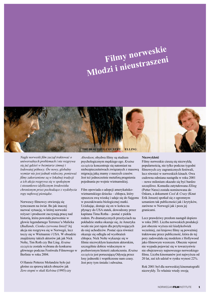 kie s e w r o Filmy n raszeni st u e i n i Młodzi the beautiful country Nagle norweski film zaczął traktować o uniwersalnych problemach i nie rozgrywa się już gdzieś w bezmiarze zimnej i lodowatej północy. Ów nowy, globalny wymiar nie jest jednak widoczny, ponieważ filmy zakorzenione są w lokalnej tradycji a ich akcja rozgrywa się w spokojnym i stosunkowo idyllicznym środowisku chronionym przez pochodzące z wydobycia ropy naftowej pieniądze. Norwescy filmowcy otwierają się tymczasem na świat. Bo jak inaczej nazwać sytuację, w której norweski reżyser i producent zaczynają pracę nad historią, która powstała pierwotnie w głowie legendarnego Terrence’a Malicka (Badlands, Cienka czerwona linia)? Jej akcja nie rozgrywa się w Norwegii, lecz toczy się w Wietnamie i USA. W obsadzie znajdziemy takich aktorów jak jak Nick Nolte, Tim Roth czy Bai Ling. Kraina szczęścia została wybrana do konkursu głównego podczas Festiwalu Filmowego w Berlinie w roku 2004. O Hansie Petterze Molandzie było już głośno za sprawą takich obrazów jak Zero stopni w skali Kelvina (1995) czy elling Aberdeen; obydwa filmy są studium psychologicznym męskiego ego. Kraina szczęścia koncentruje się natomiast na niebezpieczeństwach związanych z masową migracją jaką znamy z naszych czasów. Jest też jednocześnie metaforą pragnienia pojednania po wojnie wietnamskiej. Niezwykłość Filmy norweskie cieszą się niezwykłą popularnością, nie tylko podczas tygodni filmowych czy zagranicznych festiwali, lecz również w norweskich kinach. Owa cudowna odmiana nastąpiła w roku 2001 – nowe milenium okazało się być bardzo szczęśliwe. Komedia zatytułowana Elling Film opowiada o adopcji amerykańsko(Petter Næss) została nominowana do wietnamskiego dziecka – chłopca, który Oskara, a dokument Cool & Crazy (Knut opuszcza swą wioskę i udaje się do Sajgonu Erik Jensen) spotkał się z ogromnym w poszukiwaniu biologicznej matki. uznaniem tak publiczności jak i krytyków, Uciekając, dostaje się on w końcu na zarówno w Norwegii jak i poza jej płynący do USA statek, dowodzony przez granicami. kapitana Tima Rotha – postać z piekła rodem. Po dramatycznych przeżyciach na Lecz prawdziwy przełom nastąpił dopiero pokładzie statku okazuje się, że Ameryka w roku 2003. Liczba norweskich produkcji wcale nie jest rajem dla przybywających jest obecnie wyższa niż kiedykolwiek do niej uchodźców. Postać ojca również wcześniej, zaś krajowe filmy są poważniej okazuje się odległa od wyobrażeń traktowane przez publiczność, która do tej chłopca. Nick Nolte wykazuje się w pory zadowalała się modelem z Hollywood filmie niezwykłym kunsztem aktorskim, jako filmowym wzorcem. Obecnie wprost szczególnie dobrze widocznym w nie wypada pojawiać się w towarzystwie pozbawionym histerii zakończeniu. Kraina nie obejrzawszy najnowszego norweskiego szczęścia jest poruszającą Odyseją przez filmu. Liczba kinomanów jest najwyższa od losy jednostki i współczesne nam czasy. 20 lat, zaś ich udział w rynku wynosi 22%. Jest przy tym śmiała i odważna. Rok 2001 był dla norweskiej kinematografii niezwykły. To właśnie wtedy swoją NORWEGIANFILMINSTITUTE 1 Tradra premierę miał Elling – historia oparta na serii popularnych powieści, które były już wcześniej z sukcesem adaptowane dla potrzeb teatru. Ponad 700 tysięcy Norwegów z całkowitej liczby obywateli wynoszącej 4,5 miliona odwiedziło kina, by obejrzeć tą niezwykła komedię. Zobaczyło ją również ponad pół miliona Niemców. Dzięki nominacji do Oskara film święcił także sukcesy na festiwalach, a po adaptacji na sztukę teatralną cieszył się ogromną popularnością w całej Europie. Elling wraz ze swym przyjacielem są zmuszeni do walki ze swymi obsesjami i fobią społeczną. Problemy Ellinga dotyczą niemal wszystkich aspektów życia, więc do ucieczki od stresujących sytuacji stosuje on desperackie próby oddania się fantazjom i używa bardzo charakterystycznego, niezwykle wysokiego tonu głosu. Jego przyjaciel jest natomiast na swój własny, naiwny sposób bardzo mocno stąpającym po ziemi człowiekiem. Doskonałe aktorstwo sprawia, że niepokój i stany lękowe obydwu bohaterów oddane są z uczuciem, w sposób wyważony i ludzki. Scenarzysta Ingvald Ambjørnsen jest jednym z najlepszych autorów historii wykorzystywanych w norweskich filmach. Człowiek definiujący epokę, w której żyje. W roku 2004 stojący za sukcesem filmu Elling Petter Næss wyreżyserował komedię o jeszcze mocniejszym amerykańskim zabarwieniu à la American Pie. Just Bea jest historią o seksualnej inicjacji 16-letnich dziewczyn. Næss nie stworzył cynicznej komedii o nastolatkach. Rzuca raczej nowe światło na presję konformizmu i co najmniej wątpliwe ideały, za którymi podążają młodzi ludzie. Cool and Crazy Takie tematy doskonale nadają się na komedię. A na tym filmie widz ani przez chwilę się nie nudzi. W tym samym roku pojawiły się produkcje jeszcze bardziej zróżnicowane niż repertuar z roku 2003. Były one wynikiem prac nad wieloma filmami krótkometrażowymi i dokumentalnymi, które są wręcz idealnym narzędziem do nauki rzemiosła i rozwoju talentu. Filmy dokumentalne zajmują poczytne miejsce w historii norweskiej kinematografii – wynika to głównie z zapotrzebowania na trzeźwy realizm. Ostatnimi laty Sigve Endresen zrobił kilka filmów o tematyce tyle delikatnej, co niezwykle ważnej dla współczesnej norweskiej rzeczywistości: uzależnieniu od narkotyków, nowotworach czy histerii związanej z różnego rodzaju dietami. Endresen stworzył własną szkołę, charakteryzującą się wyjątkowym talentem do zbliżania się do bohaterów bez ich wykorzystywania. Na wzmiankę zasługuje tu również nazwisko Karoline Frogner, która w obrazie Igĺr ble jeg Tater poruszyła problemy wiecznych włóczęgów. Lecz Knut Erik Jensen nadał ostatnio gatunkowi zup