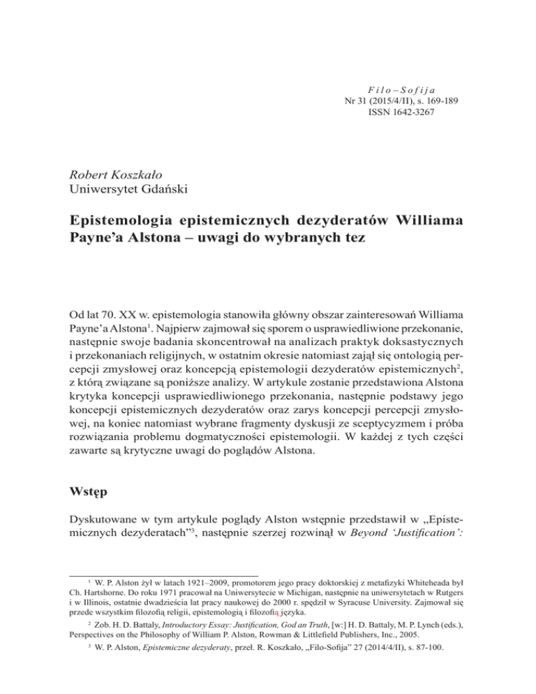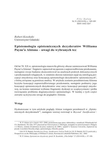 Filo– Sofija Nr 31 (2015/4/II), s. 169-189 ISSN 1642-3267 Robert Koszkało Uniwersytet Gdański Epistemologia epistemicznych dezyderatów Williama Payne’a Alstona – uwagi do wybranych tez Od lat 70. XX w. epistemologia stanowiła główny obszar zainteresowań Williama Payne’a Alstona1. Najpierw zajmował się sporem o usprawiedliwione przekonanie, następnie swoje badania skoncentrował na analizach praktyk doksastycznych i przekonaniach religijnych, w ostatnim okresie natomiast zajął się ontologią percepcji zmysłowej oraz koncepcją epistemologii dezyderatów epistemicznych2, z którą związane są poniższe analizy. W artykule zostanie przedstawiona Alstona krytyka koncepcji usprawiedliwionego przekonania, następnie podstawy jego koncepcji epistemicznych dezyderatów oraz zarys koncepcji percepcji zmysłowej, na koniec natomiast wybrane fragmenty dyskusji ze sceptycyzmem i próba rozwiązania problemu dogmatyczności epistemologii. W każdej z tych części zawarte są krytyczne uwagi do poglądów Alstona. Wstęp Dyskutowane w tym artykule poglądy Alston wstępnie przedstawił w „Epistemicznych dezyderatach”3, następnie szerzej rozwinął w Beyond ‘Justification’: W. P. Alston żył w latach 1921–2009, promotorem jego pracy doktorskiej z metafizyki Whiteheada był Ch. Hartshorne. Do roku 1971 pracował na Uniwersytecie w Michigan, następnie na uniwersytetach w Rutgers i w Illinois, ostatnie dwadzieścia lat pracy naukowej do 2000 r. spędził w Syracuse University. Zajmował się przede wszystkim filozofią religii, epistemologią i filozofią języka. 1 2 Zob. H. D. Battaly, Introductory Essay: Justification, God an Truth, [w:] H. D. Battaly, M. P. Lynch (eds.), Perspectives on the Philosophy of William P. Alston, Rowman & Littlefield Publishers, Inc., 2005. 3 W. P. Alston, Epistemiczne dezyderaty, przeł. R. Koszkało, „Filo-Sofija” 27 (2014/4/II), s. 87-100. 170 Robert Koszkało Dimensions of Epistemic Evaluation4. Obie prace w filozofii analitycznej pełnią wyjątkową rolę, ponieważ stanowią próbę zbudowania nowej epistemologii, której celem było uwolnienie filozofii analitycznej od – w przekonaniu Alstona – daremnego wysiłku rozwiązania problemu Gettiera. W „Epistemicznych dezyderatach” znajdujemy wstępnie opracowany zarys tego projektu natomiast w Beyond ‘Justification’: Dimensions of Epistemic Evaluation jego szeroko rozbudowaną wersję. Analizy Alstona doprowadziły do wielu cennych wyników. Poniższa próba przedstawienia polemicznych uwag do jego analiz nie podważa wartości całej teorii epistemicznych dezyderatów. Alstona krytyka epistemologii usprawiedliwionego przekonania Problematyka usprawiedliwionych przekonań przez wiele dekad stanowiła główny przedmiot zainteresowań epistemologii analitycznej. Alston poświęcił jej wiele prac5, jednak w ostatnim okresie swojej twórczości doszedł do wniosku o konieczności jej zakwestionowania. Jego zarzuty uderzają w fundamentalne założenie tej problematyki. Twierdzi bowiem, że bezpodstawnie przyjmuje się w niej, iż usprawiedliwienie6 jest obiektywną, główną i najważniejszą cechą epistemiczną przekonania i z tego względu powinno stanowić podstawowy przedmiot badań epistemologii. Epistemologia analityczna przez całe lata usiłowała wyjaśnić naturę oraz ustalić konieczne i wystarczające warunki usprawiedliwionego przekonania. Alston stanowiska w omawianym sporze dzieli wstępnie na trzy grupy: (1) koncepcje deontologiczne (w których usprawiedliwienie definiowane jest w kategoriach deontycznych), (2) koncepcje „sprzyjania prawdzie” (w których głównymi kategoriami są posiadanie odpowiedniej podstawy i sprzyjanie prawdzie) i (3) koncepcje, które łączą oba poprzednie podejścia.7 Grupy te nie mają oczywiście jednolitego charakteru. W każdej z nich trwają spory o rozumienie treści i referencji ich podstawowych pojęć. Koncepcje deontologiczne dzielą się w zależności od sposobu rozwiązywania np. problemu podmiotu cech deontologicznych, którymi mogą być przekonania, bądź czyny prowadzące do ich wytworzenia. Podobnie druga grupa dzieli się na stanowiska, które odmiennie definiują podstawy przekonań – uznając, że są nimi odpowiednie świadectwa, racje, podstawy, reliabilność procesów wytwarzania przekonań, właściwe funkcjonowanie władz poznawczych czy cnoty 4 W. P. Alston, Beyond „Justification”: Dimensions of Epistemic Evaluation, Cornell University Press, Ithaca N.Y. 2005. 5 W. P. Alston, Epistemic Justification: Essays in the Theory of Knowledge, Cornell University Press, Ithaca, N.Y. 1989. 6 W języku polskim w niektórych kontekstach termin justification lepiej tłumaczyć jako uzasadnienie, a czasem nawet jako uprawomocnienie. W artykule zostawiam termin usprawiedliwienie, który w większości kontekstów jest najlepszym rozwiązaniem. 7 Alston przytacza także inne podziały stanowisk w tym sporze. Epistemologia epistemicznych dezyderatów Williama Payne’a Alstona... 171 intelektualne. Każda z tych propozycji rodzi dalej idące problemy i prowadzi do kolejnych podziałów stanowisk. Zdaniem Alstona to zróżnicowanie stanowisk nie świadczy o błędności większości z nich, ale o tym, że zostały w nich odkryte różne pozytywne wartości epistemiczne, które powinny stanowić przedmiot badań teorii epistemicznych dezyderatów, dlatego problem warunków usprawiedliwionego przekonania powinien zostać porzucony. Argumenty za odrzuceniem epistemologii usprawiedliwionego przekonania8 Istnieje wiele sporów filozoficznych, w których funkcjonuje szereg niezgodnych stanowisk, a mimo to można racjonalnie twierdzić, że zajmują się one tym samym wspólnym przedmiotem badań. W sporze o usprawiedliwienie natomiast mamy różne stanowiska, ale według Alstona nie ma takiego przedmiotu. Trwałość tego sporu nie jest zatem spowodowana trudnością zagadnienia i niemożliwością jego rozstrz