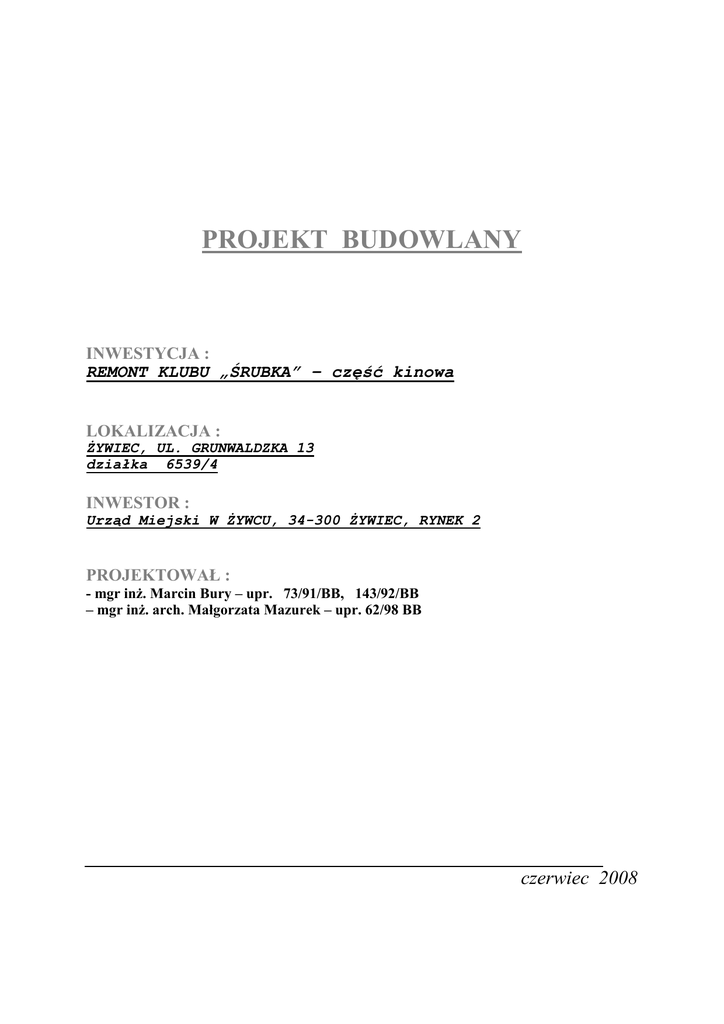 PROJEKT BUDOWLANY INWESTYCJA : REMONT KLUBU „ŚRUBKA” – część kinowa LOKALIZACJA : śYWIEC, UL. GRUNWALDZKA 13 działka 6539/4 INWESTOR : Urząd Miejski W śYWCU, 34-300 śYWIEC, RYNEK 2 PROJEKTOWAŁ : - mgr inŜ. Marcin Bury – upr. 73/91/BB, 143/92/BB – mgr inŜ. arch. Małgorzata Mazurek – upr. 62/98 BB czerwiec 2008 SPIS RYSUNKÓW: Z/1. 01. 02. 03. 04. 05. 06 PROJEKT ZAGOSPODAROWANIA TERENU RZUT PARTERU RZUT DACHU PRZEKRÓJ A-A ELEWACJE ELEWACJE ZESTAWIENIE STOLARKI 2 1:500 1:50 1:50 1:50 1:50 1:50 OPIS TECHNICZNY 1. DANE OGÓLNE 1.1. Inwestycja: Remont budynku Klubu Śrubka w śywcu – część kinowa. 1.2. Lokalizacja: śywiec, ul. Grunwaldzka 13 działka Nr: 6539/4 1.4. Inwestor: Urząd Miejski w śywcu, 34-300 śywiec, Rynek 2 2. Sytuacja: Budynek Klubu zlokalizowany jest w budynku będącym własnością Urzędu Miejskiego w śywcu. Od strony drogi zlokalizowany jest budynek dwukondygnacyjny, którego przebudowa ujęta została w odrębnym opracowaniu. Projekt zawiera remont części parterowej, zlokalizowanej za budynkiem piętrowym. Obiekt objęty opracowaniem zawiera pomieszczenia klubowe (kawiarenka internetowa) oraz salę kinową wraz z zapleczem. W odrębnych opracowaniach zawarto wymianę instalacji elektrycznej oraz C.O. i wodno-kanalizacyjnej, a takŜe instalacje klimatyzacyjną w sali kinowej. Na teren nieruchomości prowadzi wjazd z drogi asfaltowej. Na zapleczu budynku zlokalizowane są istniejące miejsca parkingowe. UŜytkowanie budynku jest zgodne z zapisem planu. 3. Uzbrojenie: 3.1. Zaopatrzenie w wodę - z wodociągu miejskiego 3.2. Odprowadzenie ścieków - do kanalizacji miejskiej 3.3. Zaopatrzenie w energię elektryczną - z istniejącej linii NN 3.4. Zaopatrzenie w ciepło - ogrzewanie centralne z kotłowni miejskiej 3.5. Dojście i dojazd - z drogi powiatowej 3 4. Spis pomieszczeń. SPIS POMIESZCZEŃ Nazwa pomieszczenia Numer Powierzchnia (m2) Wykończenie Posadzka Ściany PARTER Korytarz 1.12 Lastriko – do szlifowania 24,00 Hall Sala klubowa 1.13 12,40 1.14 43,60 1.15 6,60 Skucie istniejącej posadzki, wylewka wyrównawcza gr. 5 mm, płytki ceramiczne parkiet do cyklinowania Skucie istniejącej posadzki, wylewka wyrównawcza gr. 5 mm, płytki ceramiczne Skucie istniejącej posadzki, wylewka wyrównawcza gr. 5 mm, płytki ceramiczne Skucie istniejącej posadzki, wylewka wyrównawcza gr. 5 mm, płytki ceramiczne Skucie istniejącej posadzki, wylewka wyrównawcza gr. 5 mm, płytki ceramiczne Skucie istniejącej posadzki, wylewka wyrównawcza gr. 5 mm, płytki ceramiczne Korytarz Magazyn 1.16 6,70 Pomieszczenie porządkowe, magazyn opakowań zwrotnych 1.17 4,50 Pomieszczenie gospodarcze 1.18 2,10 1.19 3,60 WC dla niepełnosprawnych 4 Tynk mozaikowy do wysokości 1,50, powyŜej malowanie farbą akrylową Tynk mozaikowy do wysokości 1,50, powyŜej malowanie farbą akrylową Farba akrylowa Płytki ceramiczne wysokości do 2 m Płytki ceramiczne wysokości do 2 m, powyŜej malowanie farbą akrylową Lamperia olejna do wysokości 2,0, powyŜej malowanie farbą akrylową Lamperia olejna do wysokości 2,0 m, powyŜej malowanie farbą akrylową Płytki ceramiczne na pełną wysokość WC słuŜbowe 1.20 1,93 1.21 5,40 1.22 3,10 Skucie istniejącej posadzki, wylewka wyrównawcza gr. 5 mm, płytki ceramiczne Skucie istniejącej posadzki, wylewka wyrównawcza gr. 5 mm, płytki ceramiczne Skucie istniejącej posadzki, wylewka wyrównawcza gr. 5 mm, płytki ceramiczne Skucie istniejącej posadzki, wylewka wyrównawcza gr. 5 mm, płytki ceramiczne WC dla kobiet Kasa Hall 1.23 26,30 Sala kinowa 1.24 119,40 parkiet do wymiany 1.25 57,20 deski do cyklinowania i malowania Scena Wiatrołap 1.26 Skucie istniejącej posadzki, wylewka wyrównawcza gr. 5 mm, płytki ceramiczne Skucie istniejącej posadzki, wylewka wyrównawcza gr. 5 mm, płytki ceramiczne Skucie istniejącej posadzki, wylewka wyrównawcza gr. 5 mm, płytki ceramiczne 4,70 Wymiennik ciepła 1.27 9,90 Magazyn 1.28 9,50 5 Płytki ceramiczne na pełną wysokość Płytki ceramiczne na pełną wysokość Malowanie farbą olejną Tynk mozaikowy do wysokości 1,50, powyŜej malowanie farbą akrylową Lamperia olejna do wysokości 1,50, powyŜej malowanie farbą akrylową Lamperia olejna do wysokości 1,50, powyŜej malowanie farbą akrylową Tynk mozaikowy do wysokości 1,50, powyŜej malowanie farbą akrylową Lamperia olejna do wysokości 1,50, powyŜej malowanie farbą akrylową Lamperia olejna do wysokości 1,50, powyŜej malowanie farbą akrylową Rozdzielnia elektryczna 1.29 4,20 1.30 3,60 1.31 19,30 Skucie istniejącej posadzki, wylewka wyrównawcza gr. 5 mm, płytki ceramiczne Skucie istniejącej posadzki, wylewka wyrównawcza gr. 5 mm, płytki ceramiczne Skucie istniejącej posadzki, wylewka wyrównawcza gr. 5 mm, płytki ceramiczne WC+ prysznic Szatnia RAZEM Lamperia olejna do wysokości 1,50, powyŜej malowanie farbą akrylową Płytki ceramiczne na pełną wysokość Płytki ceramiczne na pełną wysokość 368,03 5. Funkcja Sala kinowa mieści około 140 osób. Koło sali znajduje się WC dla niepełnosprawnych oraz dwie kabiny dla kobiet. Widzowie dodatkowo mogą korzystać z sanitariatów znajdujących się na parterze i piętrze budynku piętrowego ( dwie ubikacje dla kobiet i dwie dla męŜczyzn). W części przeznaczonej na kawiarenkę internetową planuje się wydawanie posiłków gotowych, przygotowanych w opakowaniach jednorazowych oraz podawanie napojów. 6. Zakres planowanych prac W ramach przebudowy planuje się wykonanie następujących prac: 1. Wymiana wszystkich drzwi z poszerzeniem otworu o średnio ok. 15 cm. Rama skrzydła wykonana z klejonki drewna iglastego. Wypełnienie skrzydła z płyty wiórowej otworowej wzmocnionej wewnętrznym ramiakiem ze sklejki. Rama wraz z wypełnieniem oklejona dwustronnie płytą HDF. 2. Drzwi oszklone wykonać z zastosowaniem szkła bezpiecznego. 6 3. Wymiana okien na okna plastikowe pięciokomorowe, uchylnorozwieralne, o współczynniku przen